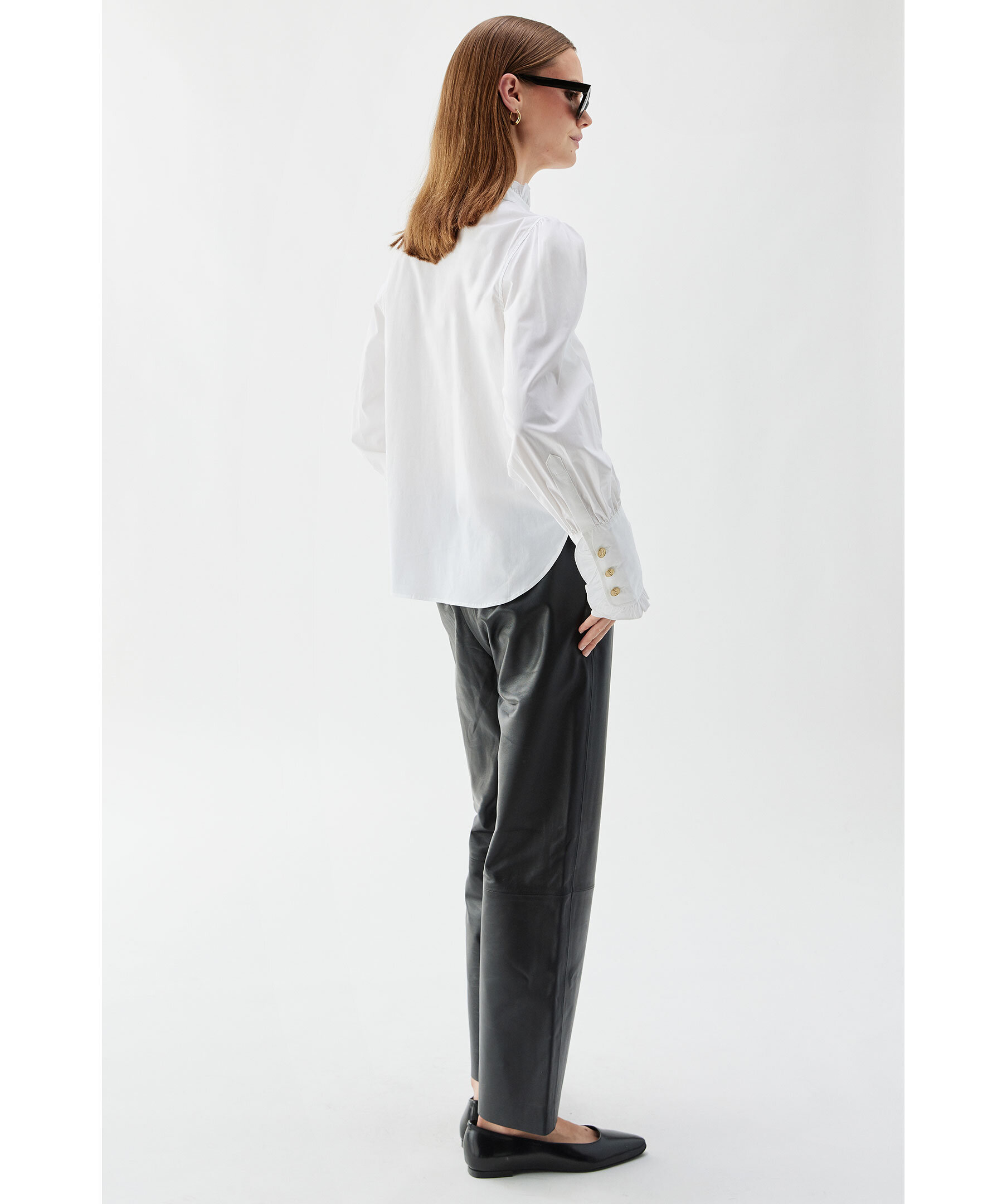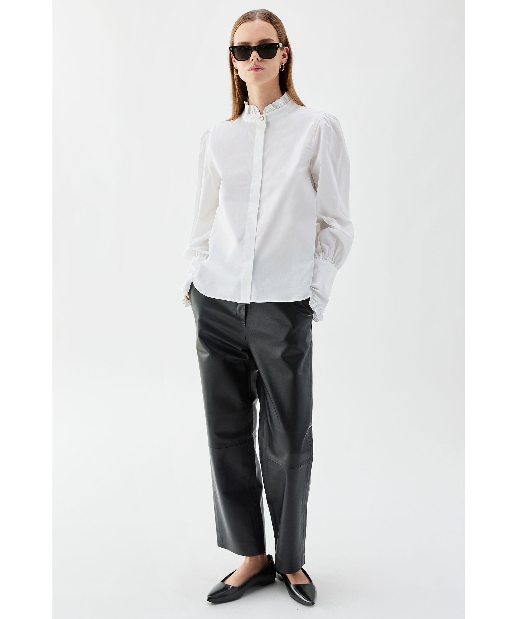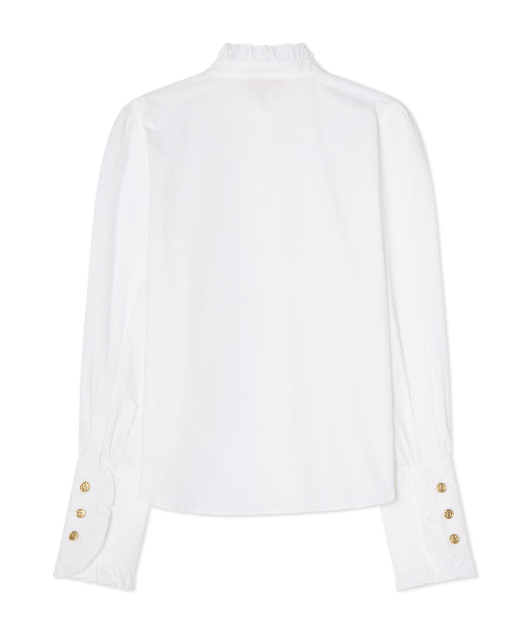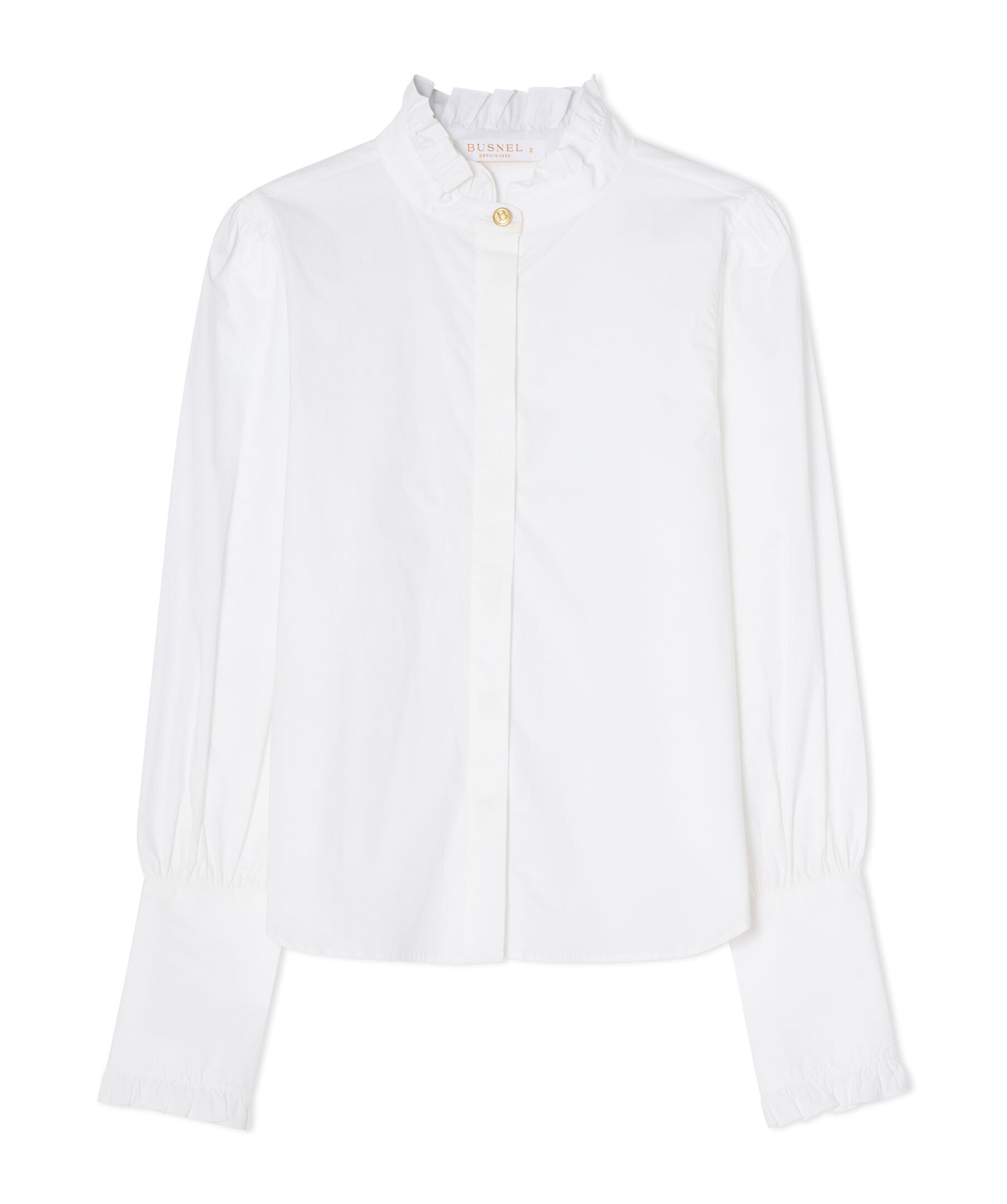 Vit blus från Busnel. Blusen är detaljerad med en volangkrage samt en gyllene B-knapp framtill och tre på varje mudd. Tillverkad i en bomullsblandning.