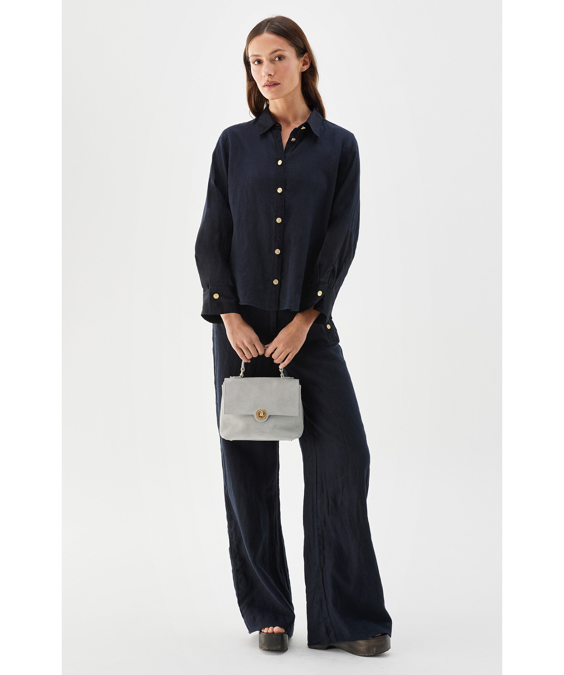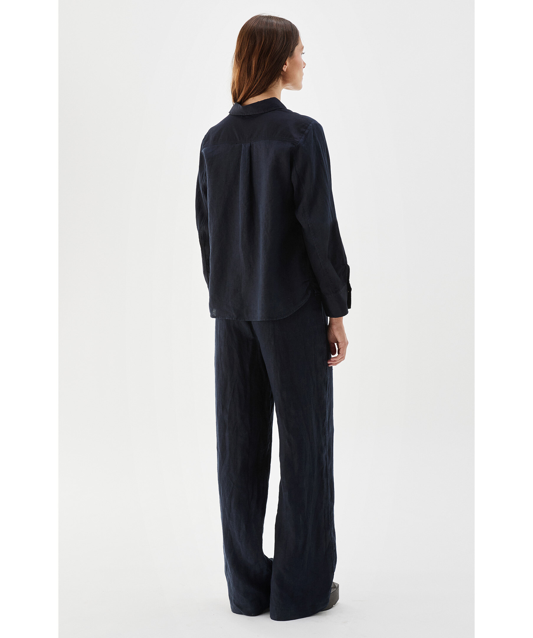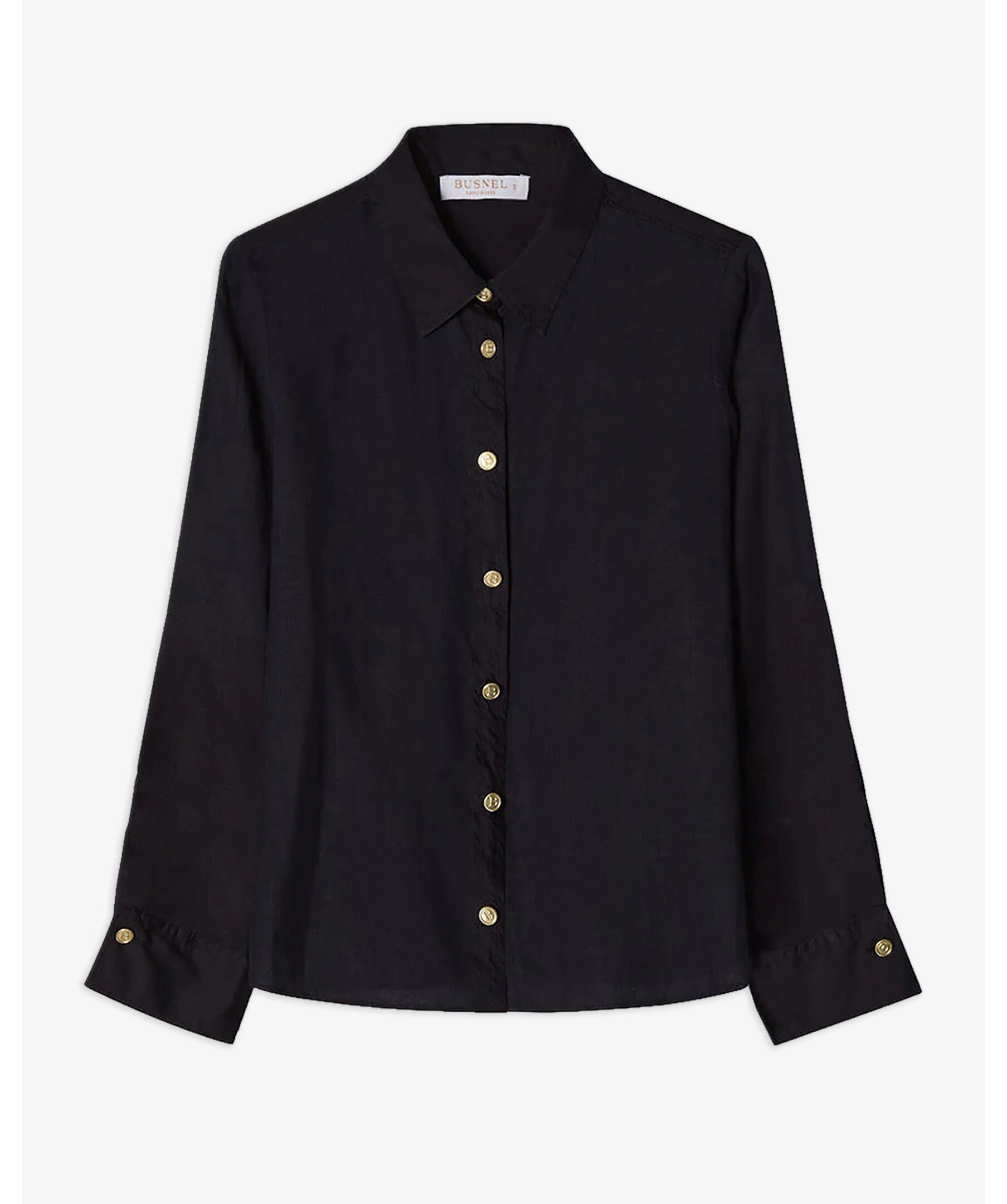 Mörkblå långärmad skjorta i linne från Busnel - tillverkad i mjuk och luftig linne. Linneskjortan har lång ärm, guldknappar och krage och manschett i bomull med lyster som skapar en fin kontrast till linnet.