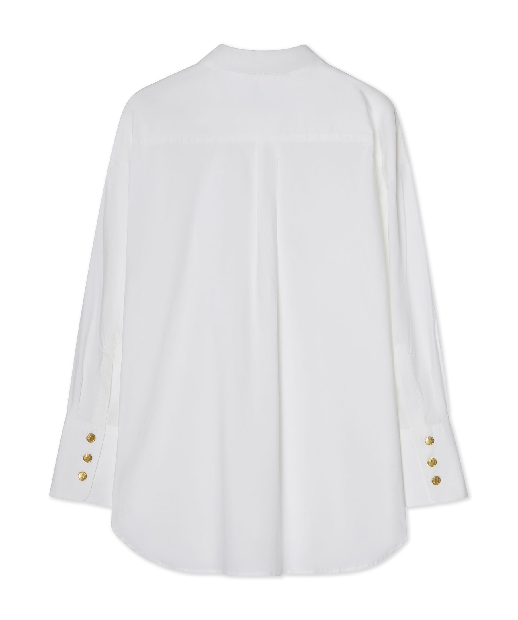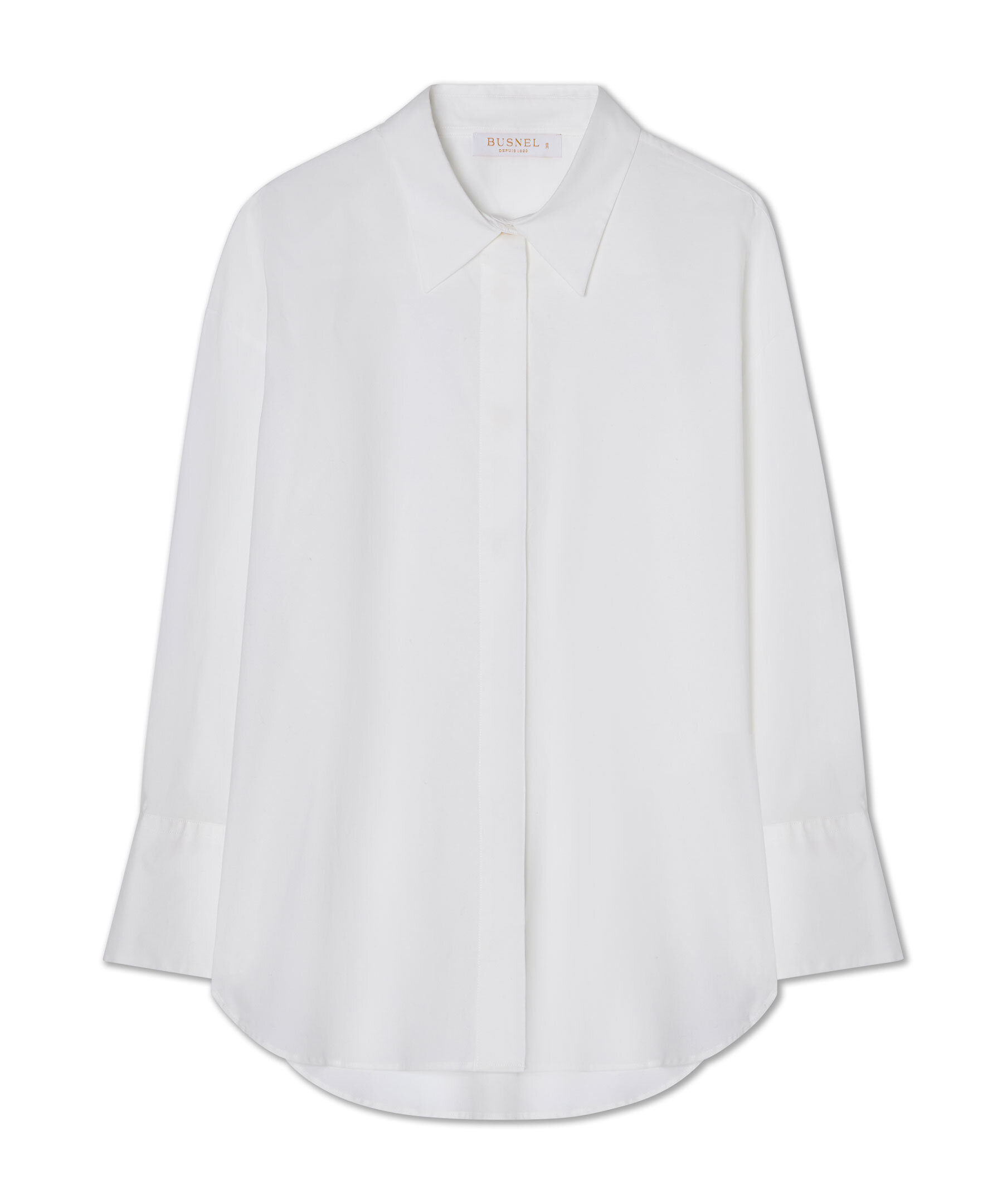 Vit skjorta från Busnel. Skjortan stängs med dolda knappar förutom den guldfärgade toppknappen och har breda manschetter med guldfärgade knappar samt en spetsig krage. Tillverkad i en bomullsblandning.