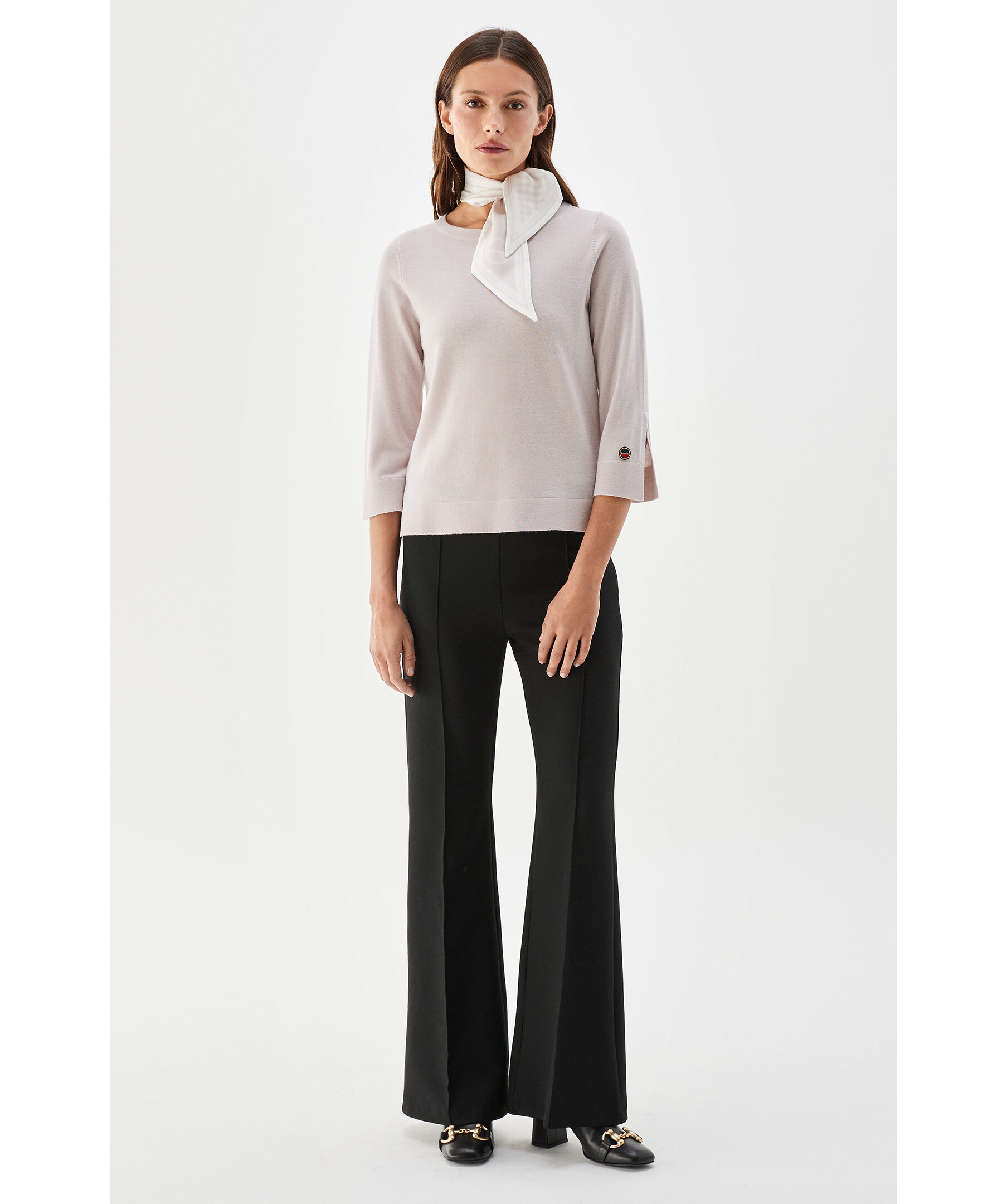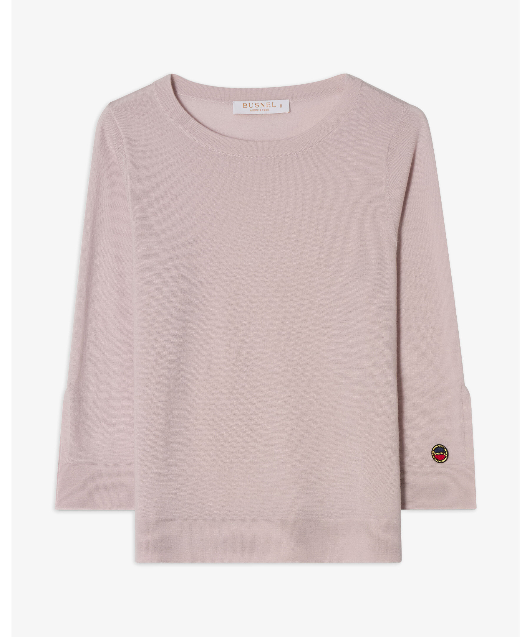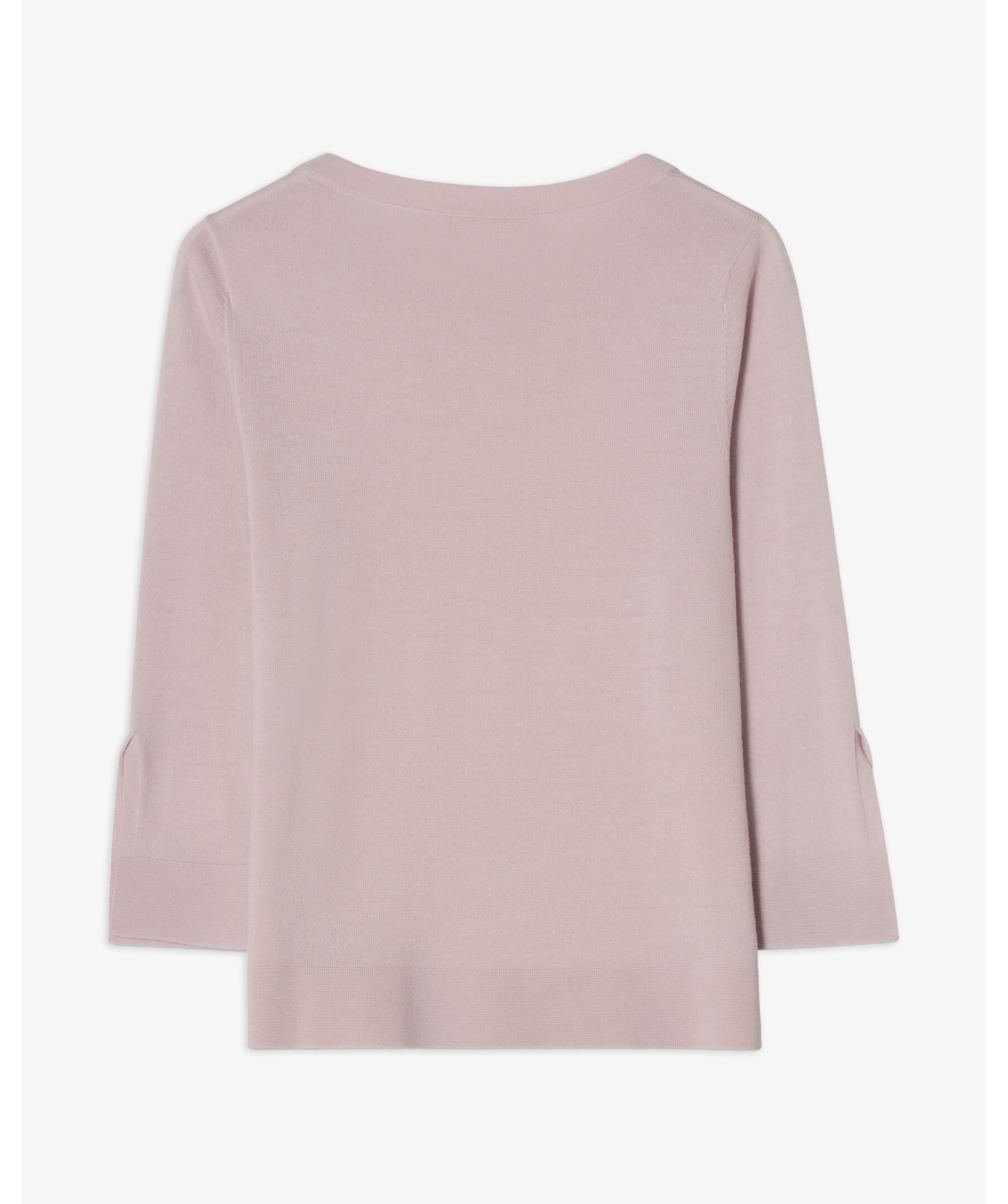 Ljusrosa båtringad topp från Busnel i mjuk merinoull. Toppen har en rak passform, båtringning och trekvartsärm. Formen förstärks av de vackra sprunden nedtill och på sidan av ärmarna. En mjuk merinoullströja som är mångsidig och lätt att bära