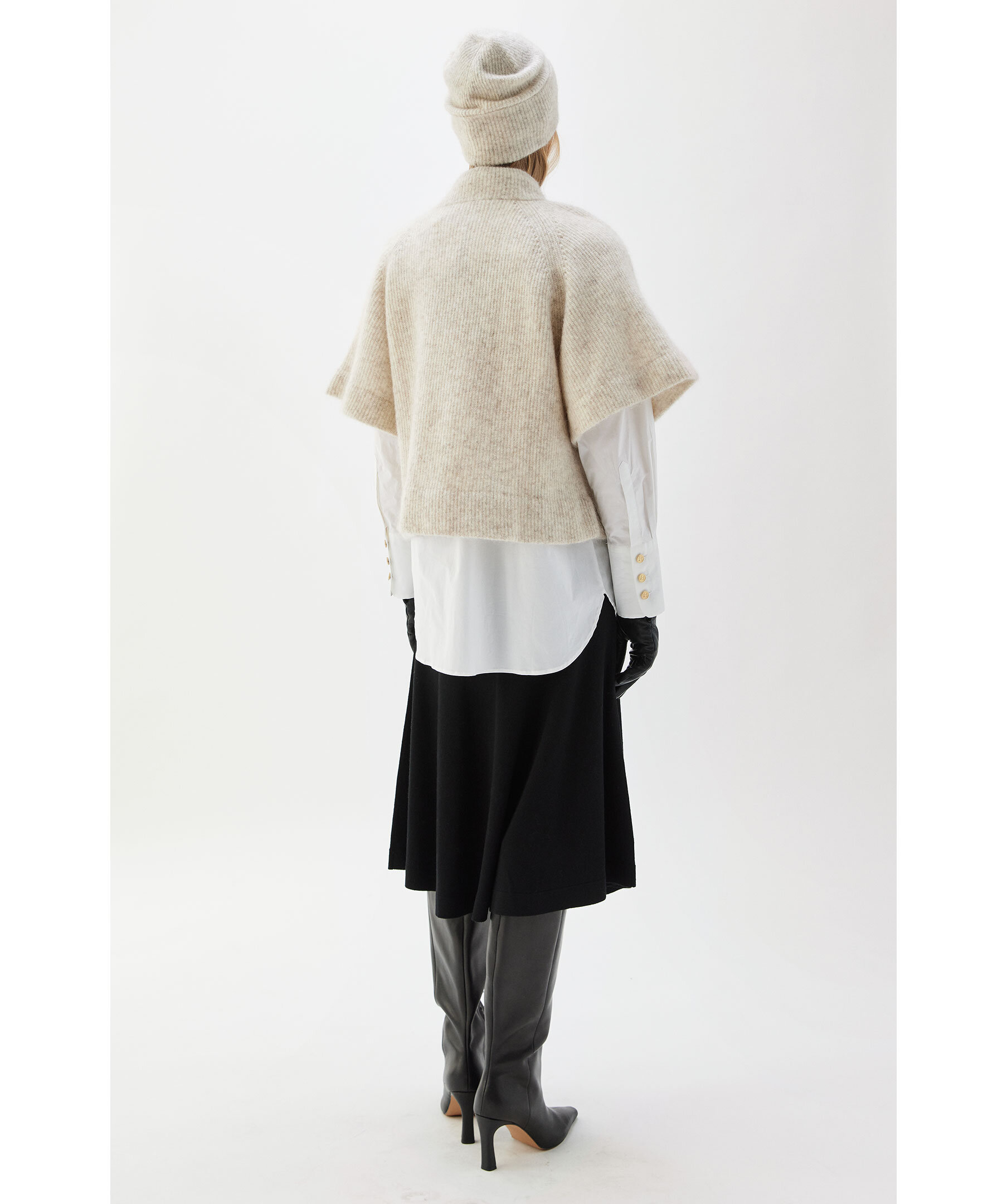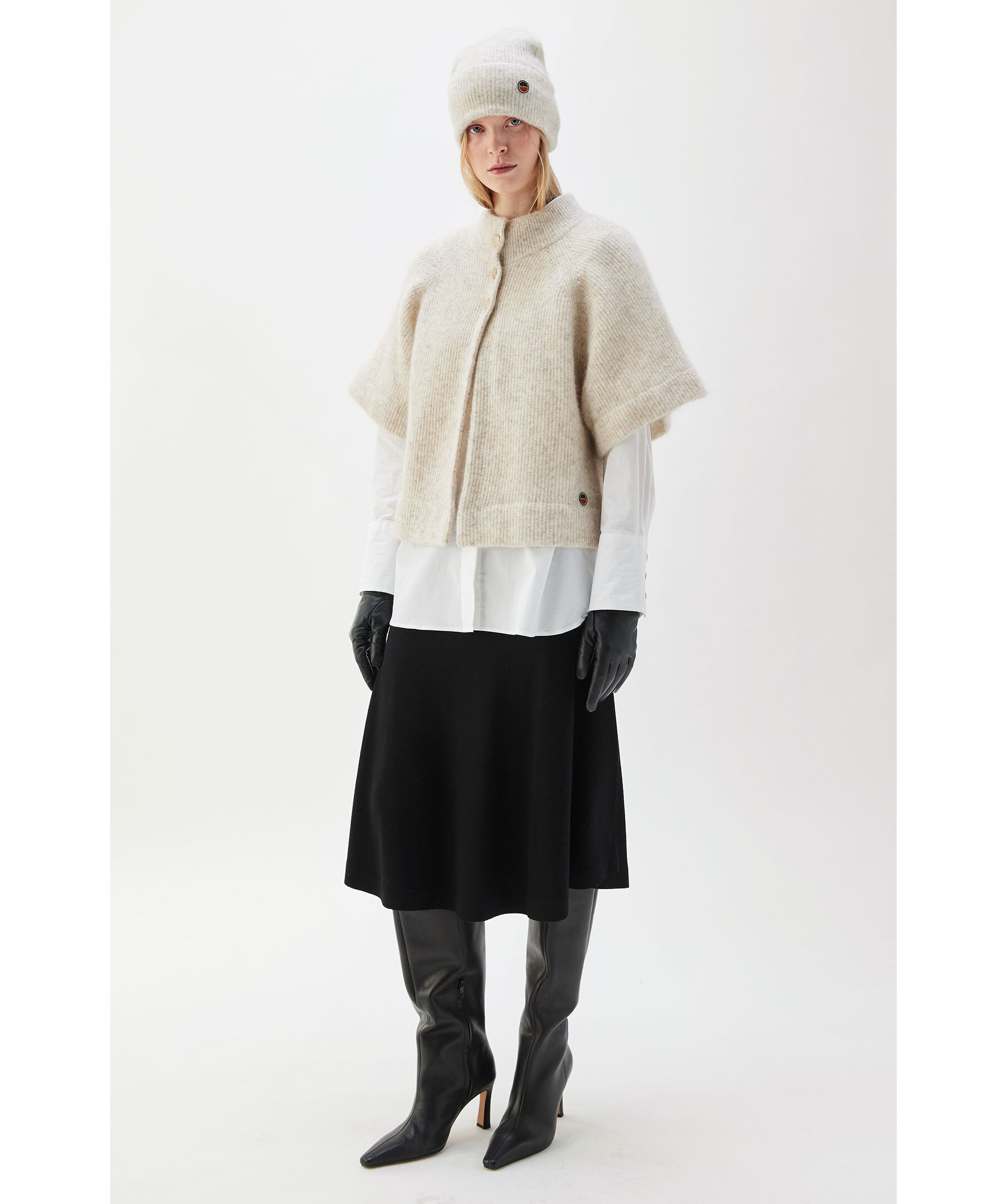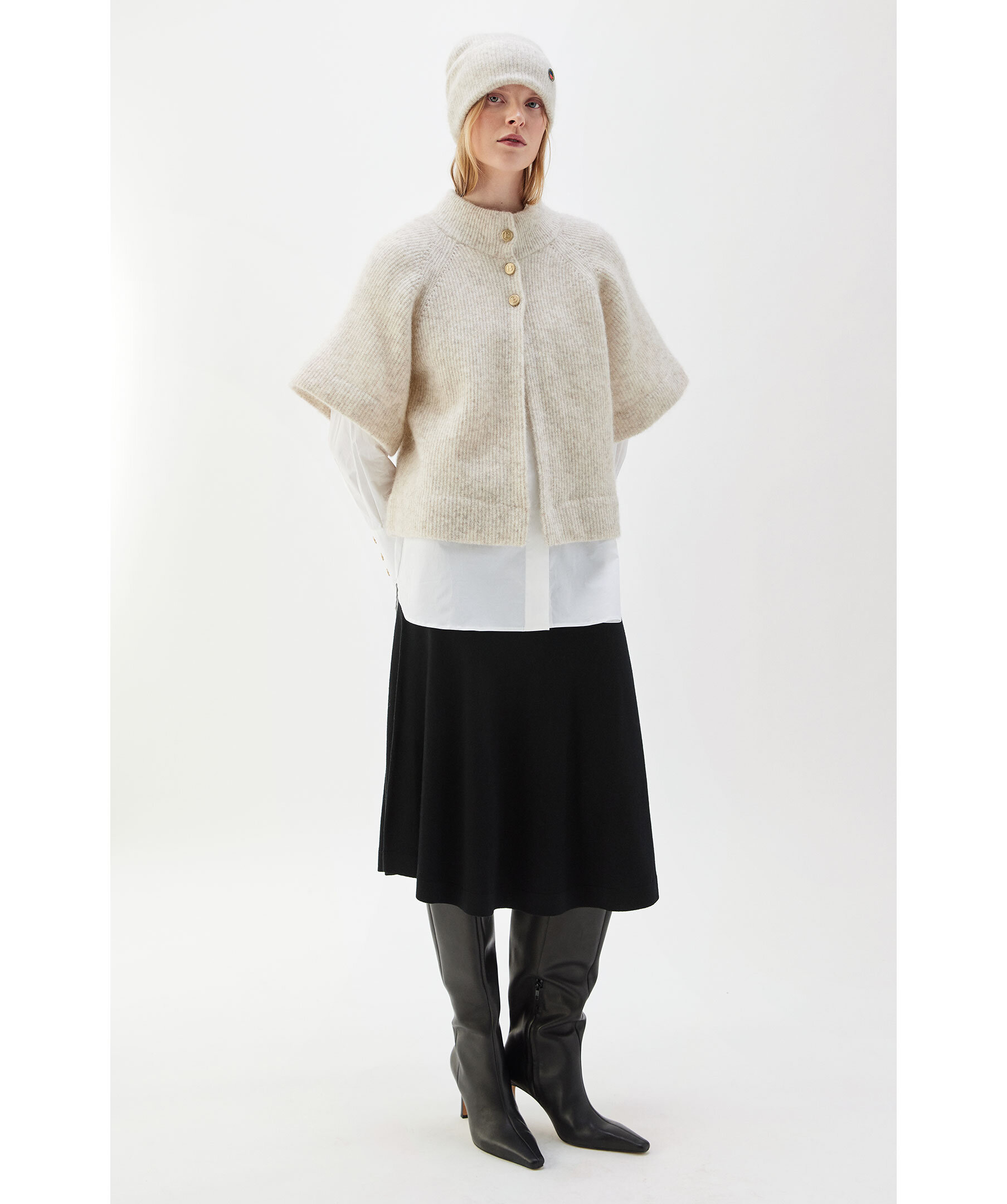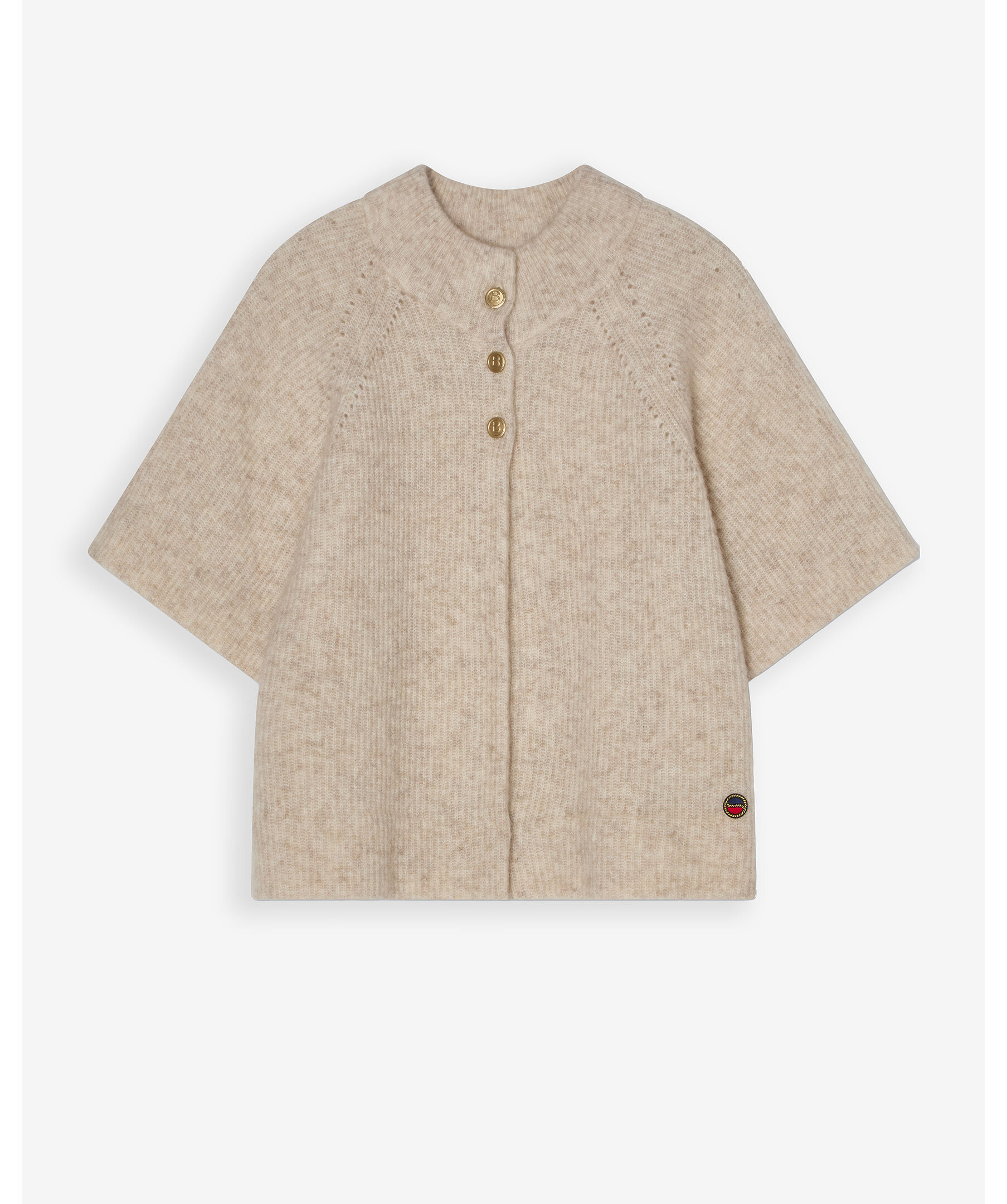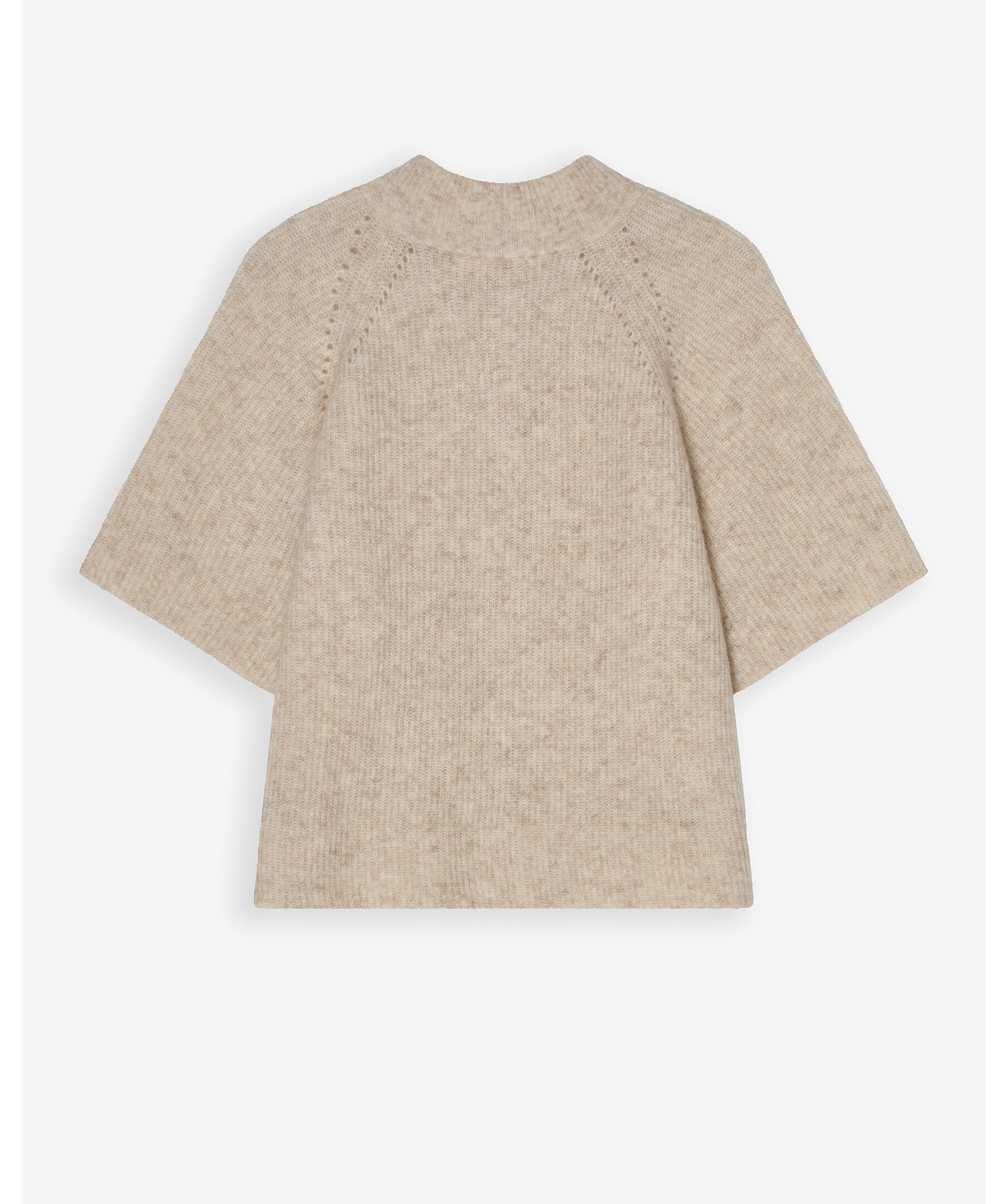 Ljusbeige, ribbstickad och kortärmad kofta från Busnel. Koftan har en rund halsringning och de kortare, fladdrande ärmarna skapar en vacker silhuett, vilket gör den enkel att passa även en överdimensionerad skjorta under. Den knäpps upptill med tre gyllene B-knappar. Stickad av en blandning av mohair och ull för att skapa en fluffig och mjuk struktur.