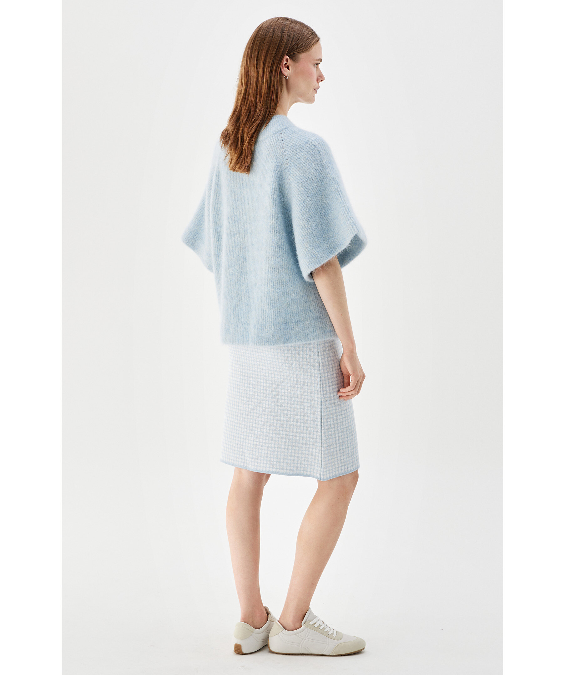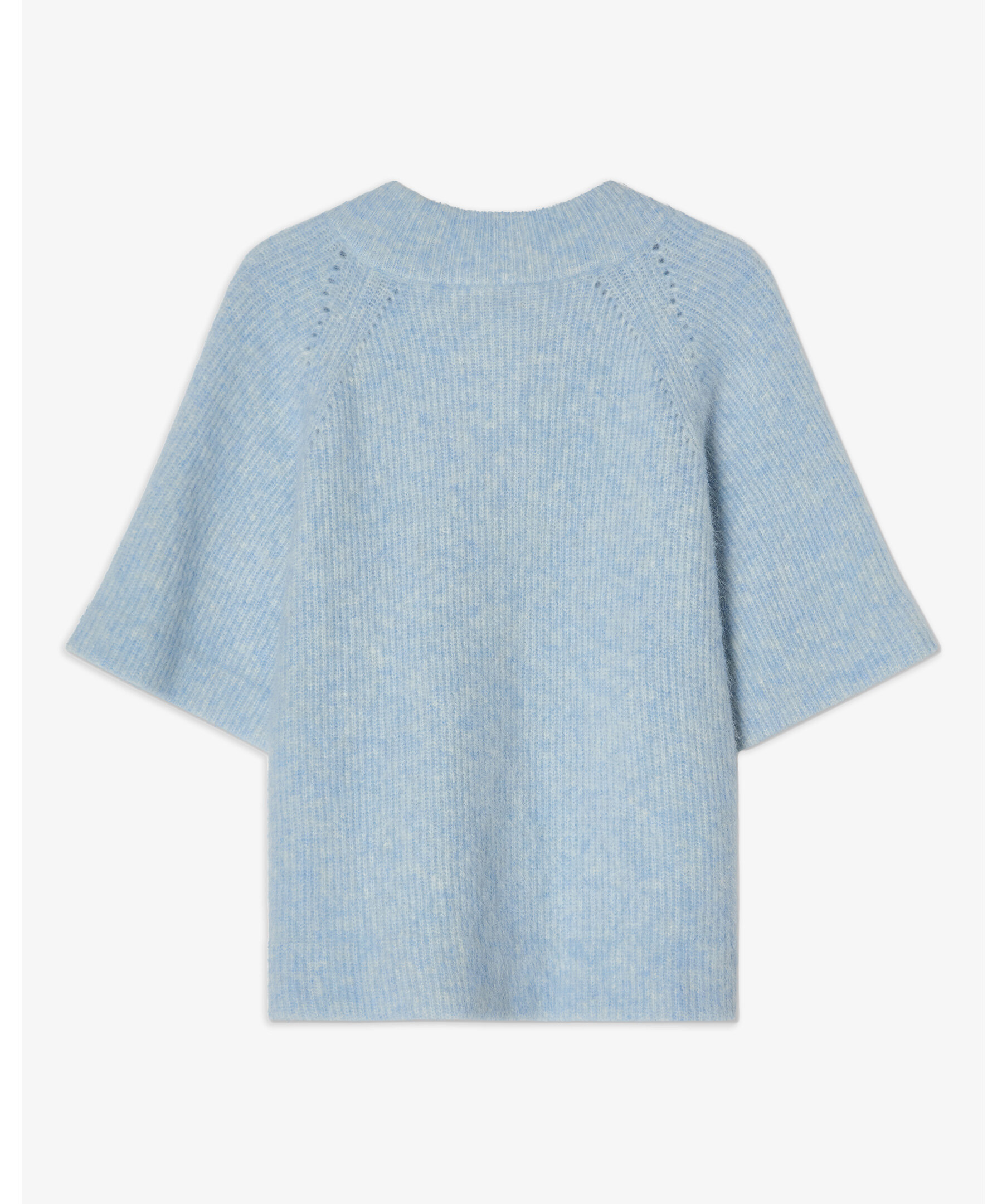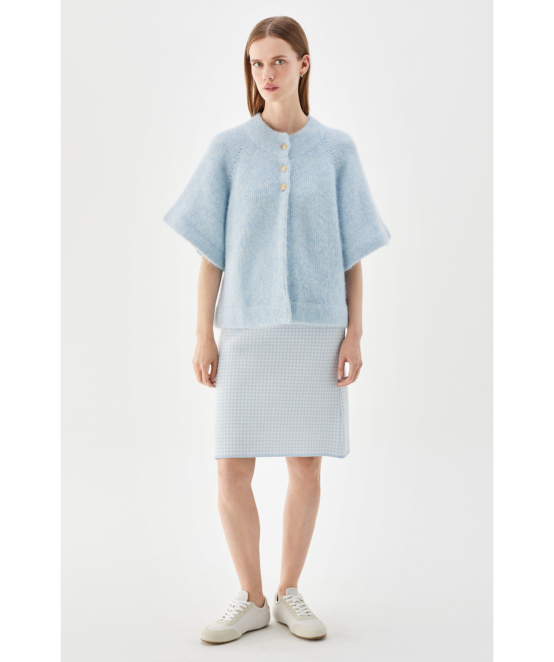 Ljusblå kort kofta från Busnel - kortärmad cape-kofta stickad i en mjuk och fluffig mohairkvalitet. Koftan har en något högre rundad hals, guldknappar, korta vida ärmar som skapar en vacker silhuett och gör det enkelt att styla tillsammans med de flesta plagg, så som en oversizad skjorta eller en klänning.