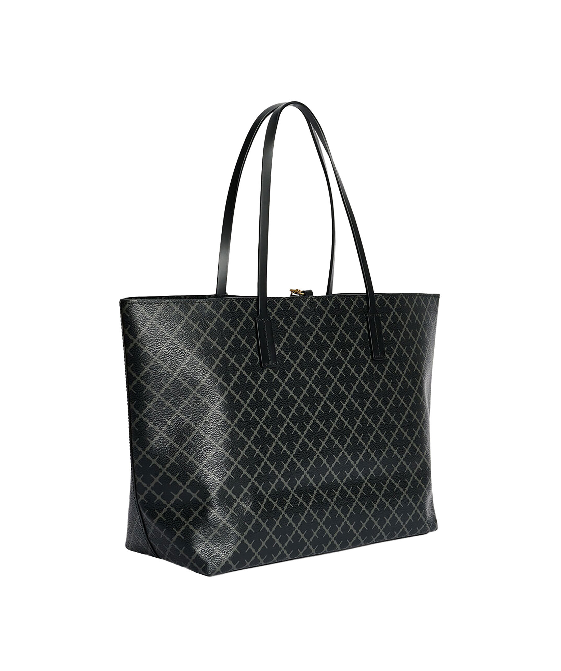 Stor svart och grå mönstrad tote väska från By Malene Birger. Signatur Flower-tryck, stängs med karbinhake och har en innerficka med dragkedja. Läderkant. Tillverkad i PVC. Mått: B: 48cm x H: 28cm x D: 12,5 cm