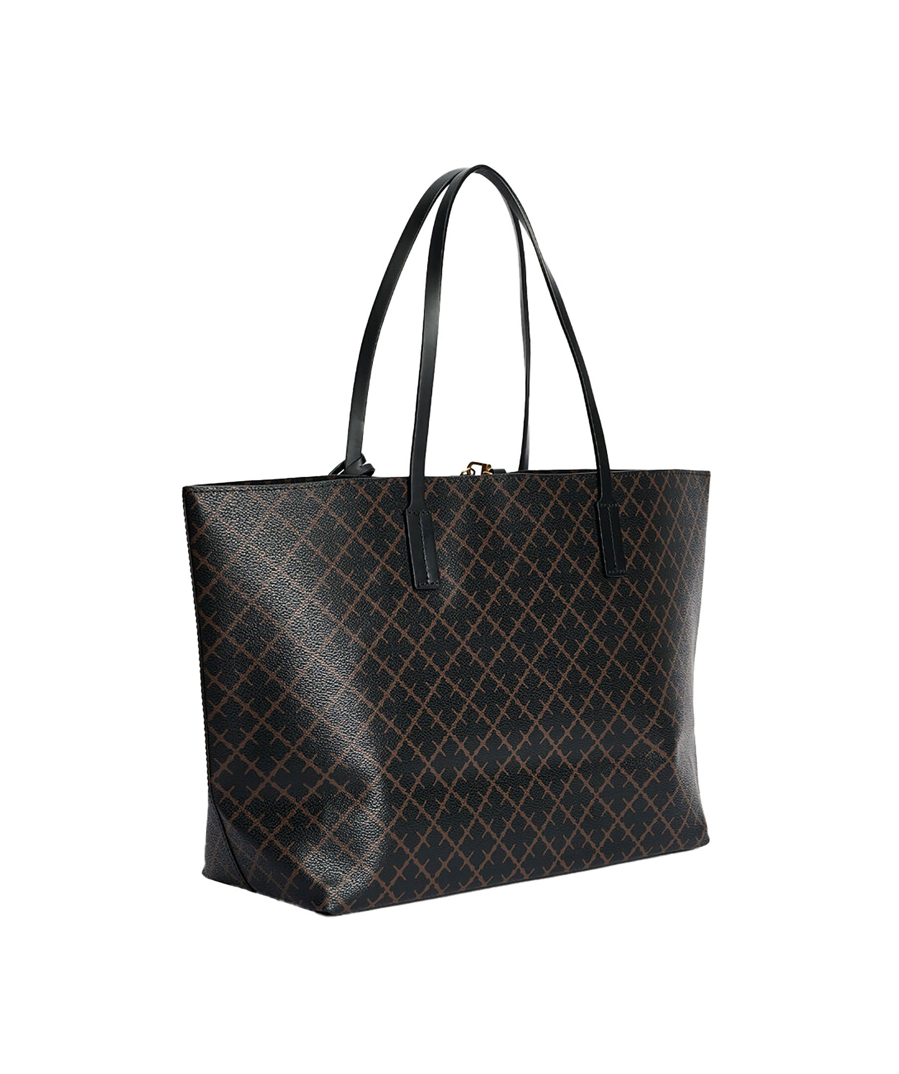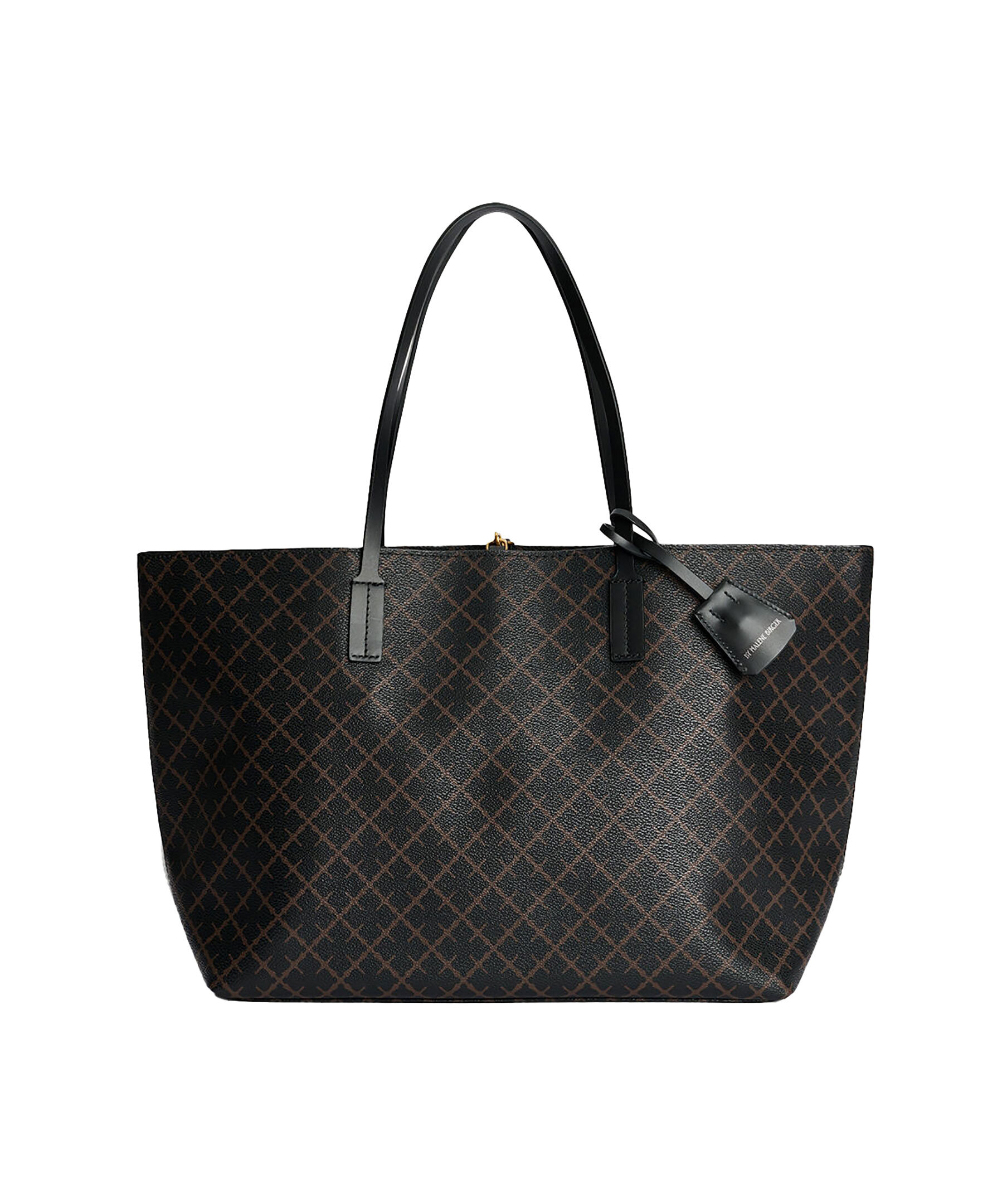 Stor svart och brun mönstrad tote väska från By Malene Birger. Signatur Flower-tryck, stängs med karbinhake och har en innerficka med dragkedja. Läderkant. Tillverkad i PVC. Mått: B: 48cm x H: 28cm x D: 12,5 cm