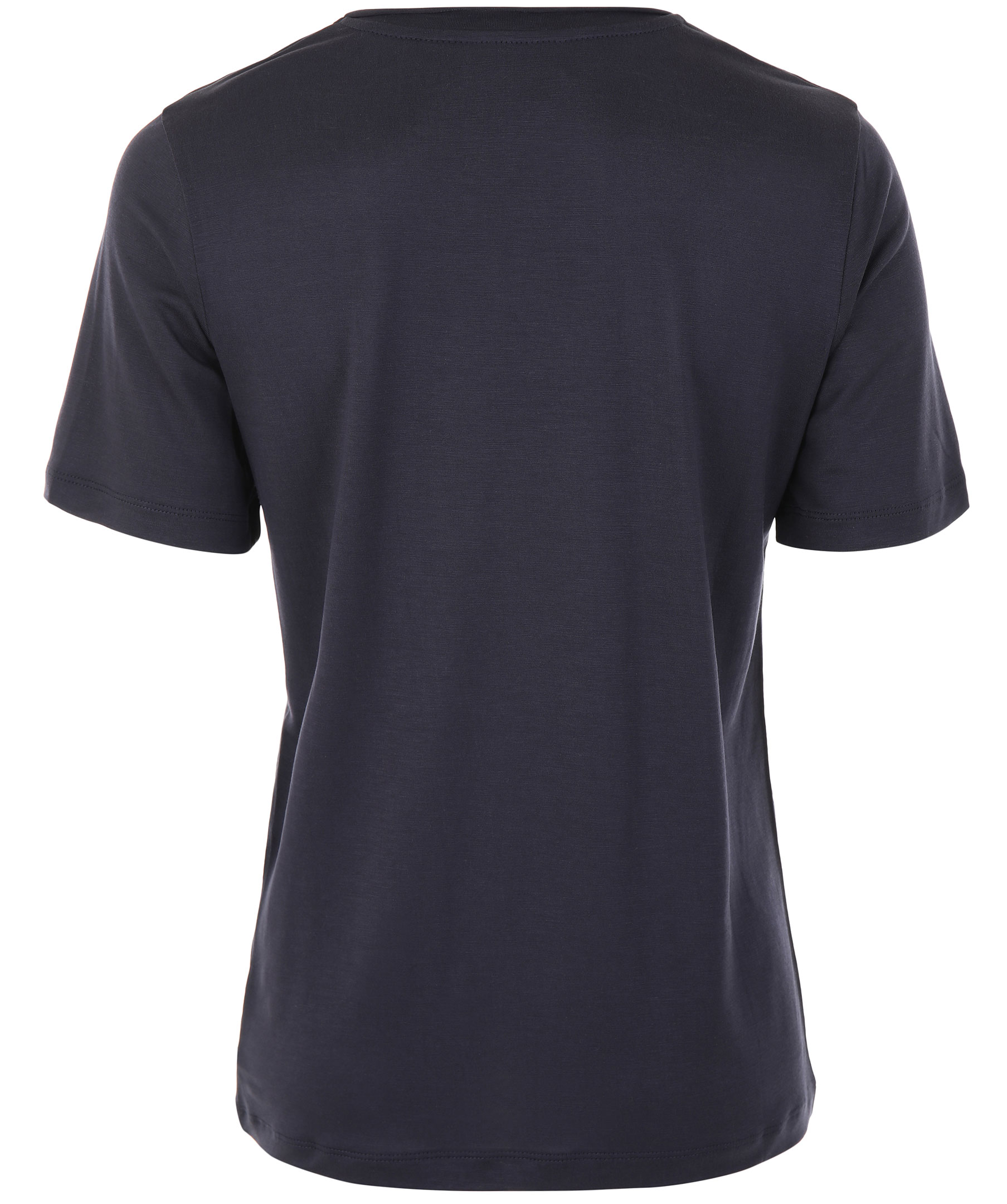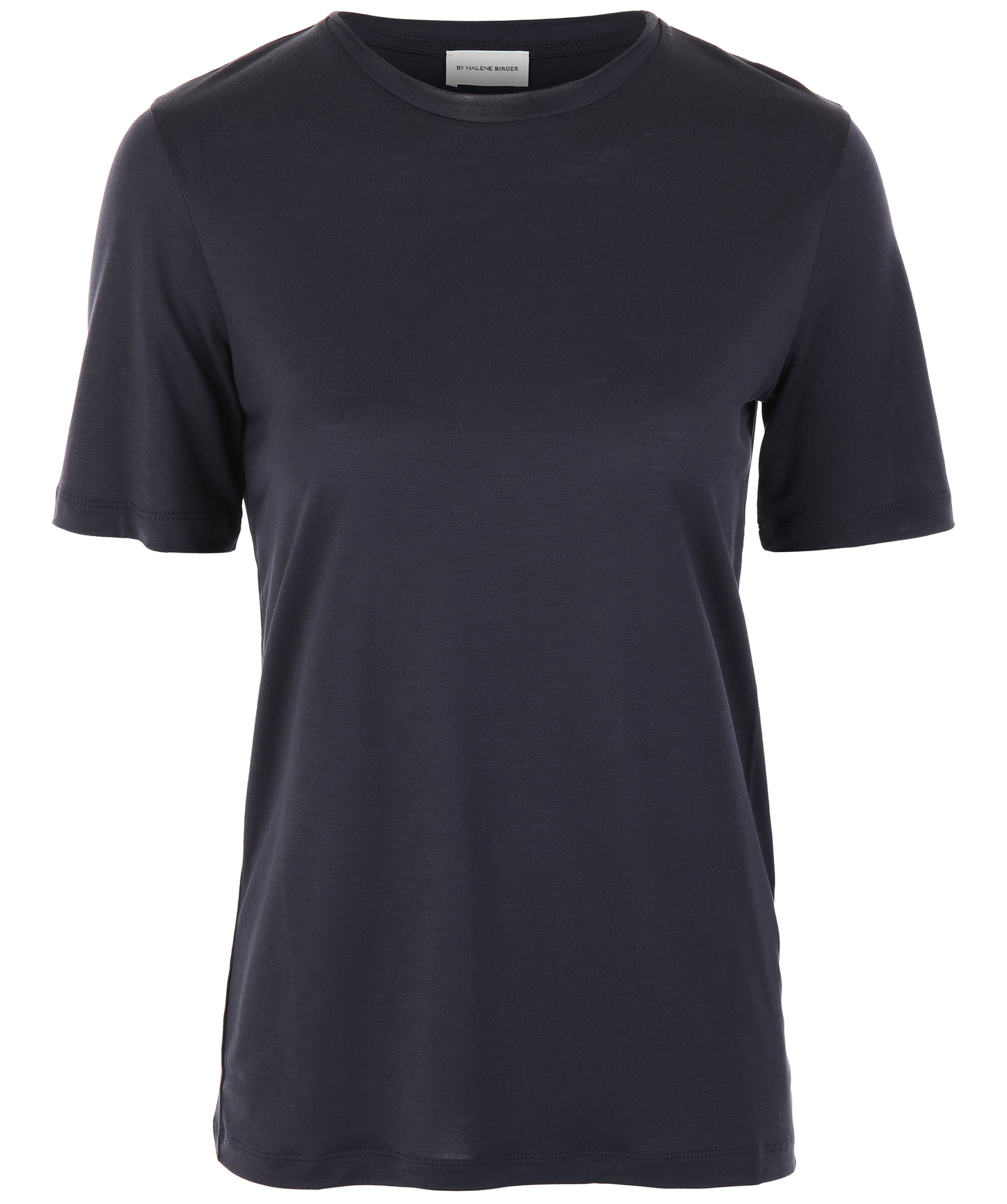 Marinblå t-shirt med rundad halsringning från by Malene Birger. Hög halsringning med rå kant och har en rak modell. Tillverkad i 100% lyocell.