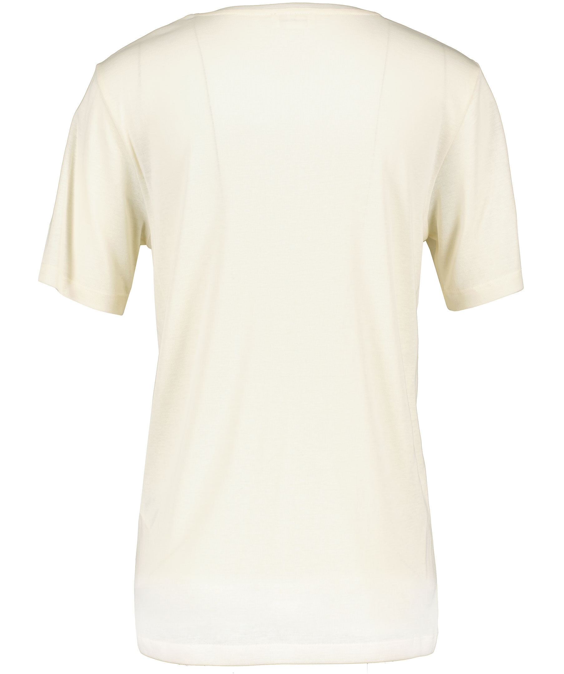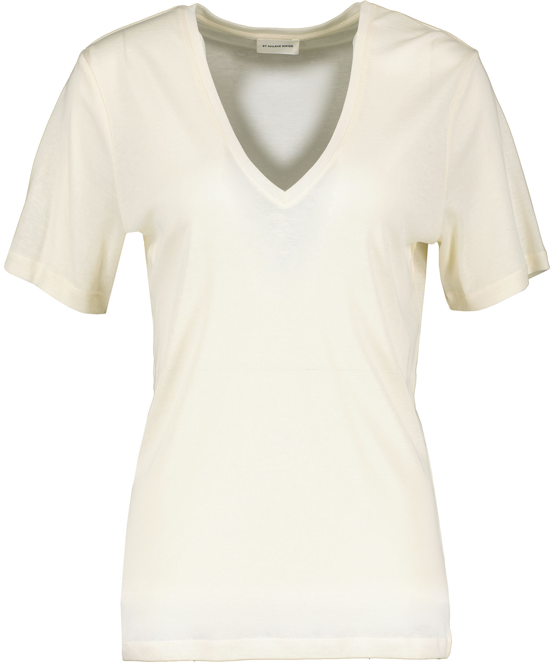 Krämvit t-shirt med v-ringad halsringning från by Malene Birger. Rak modell med längre t-shirtärmar. Tillverkad i tunt lyocelltyg.