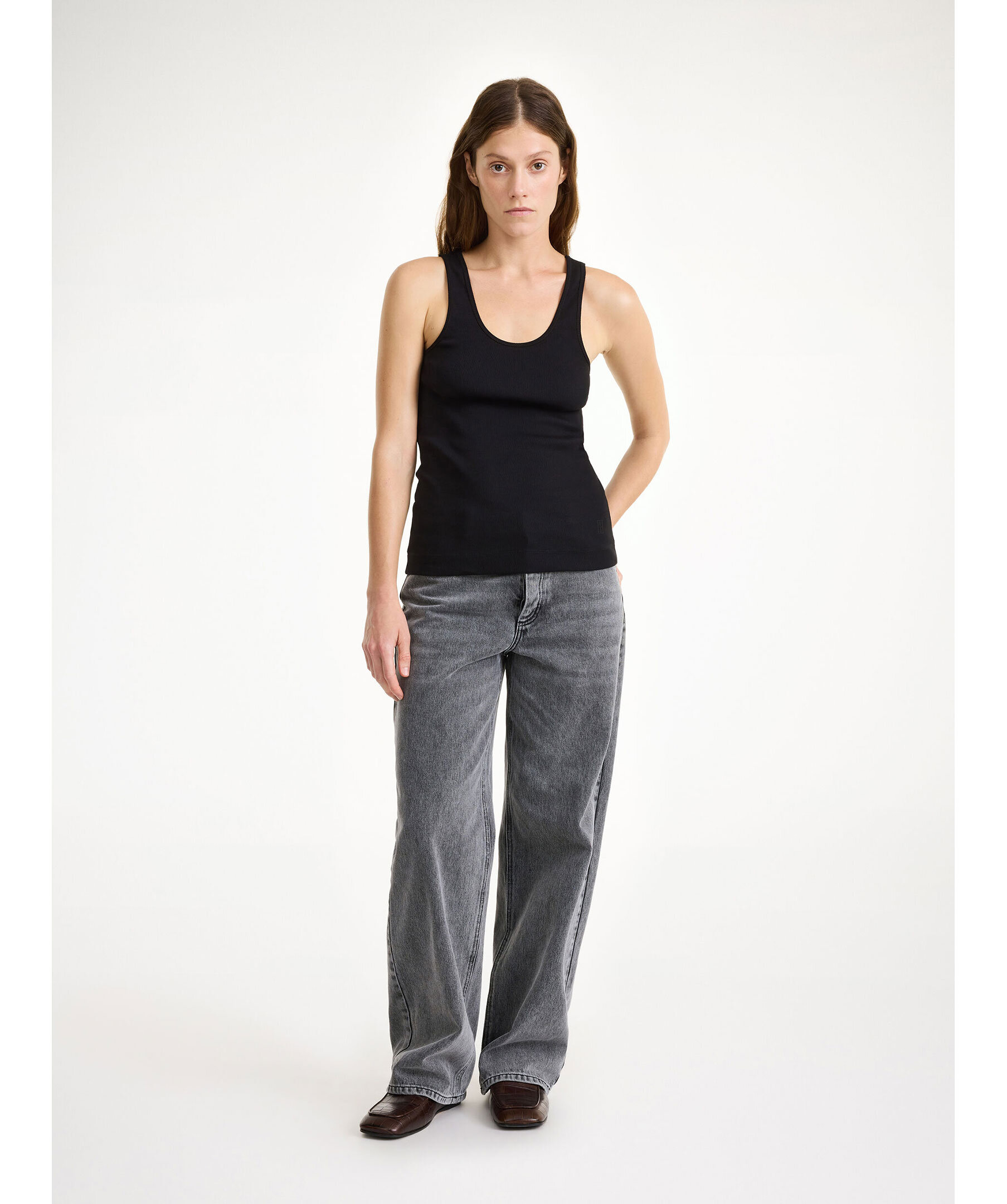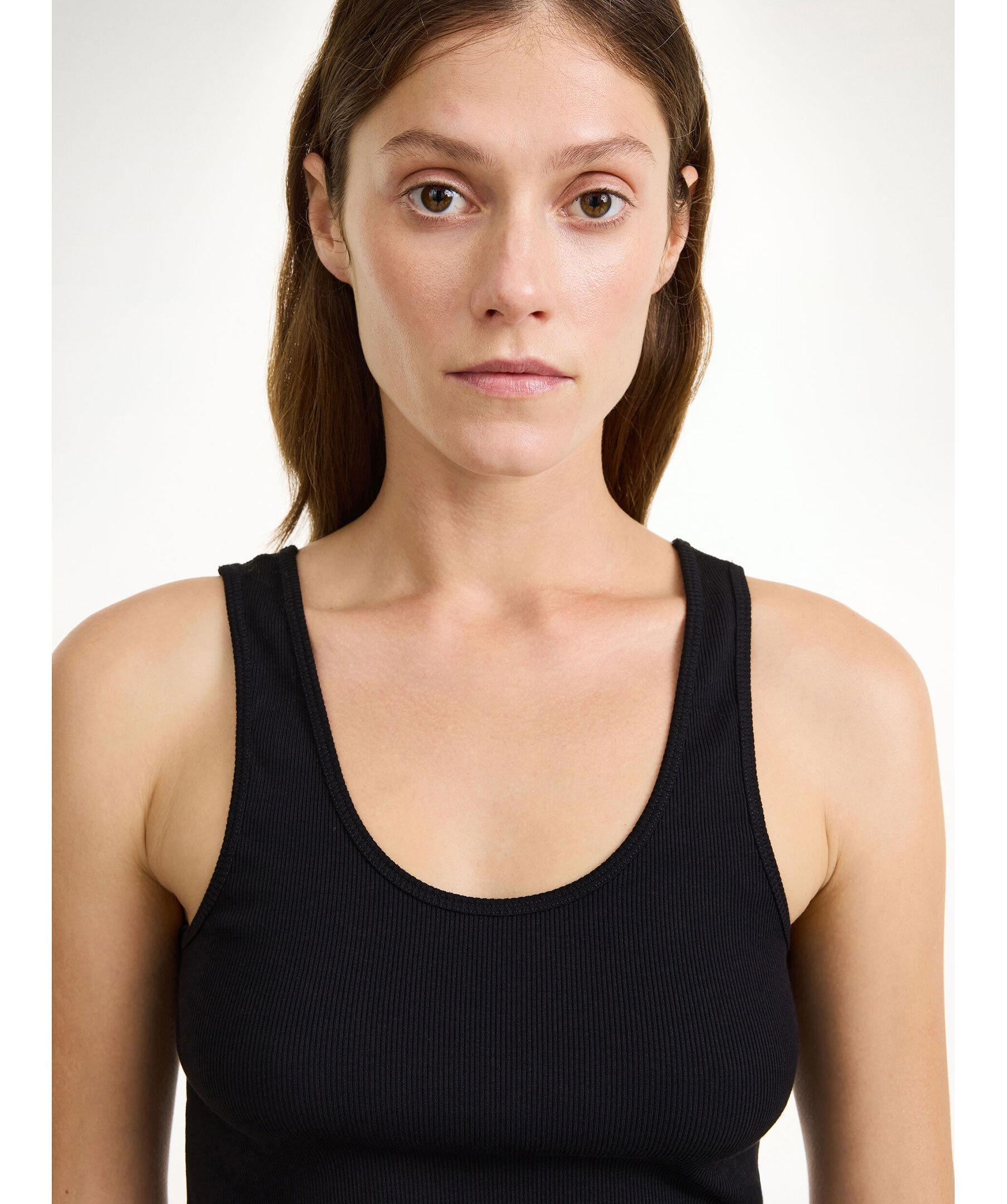 Svart ribbat linne från By Malene Birger. Normal passform. Rundad halsringning och breda axelband. Modellen är 168cm lång och har på sig strl S.