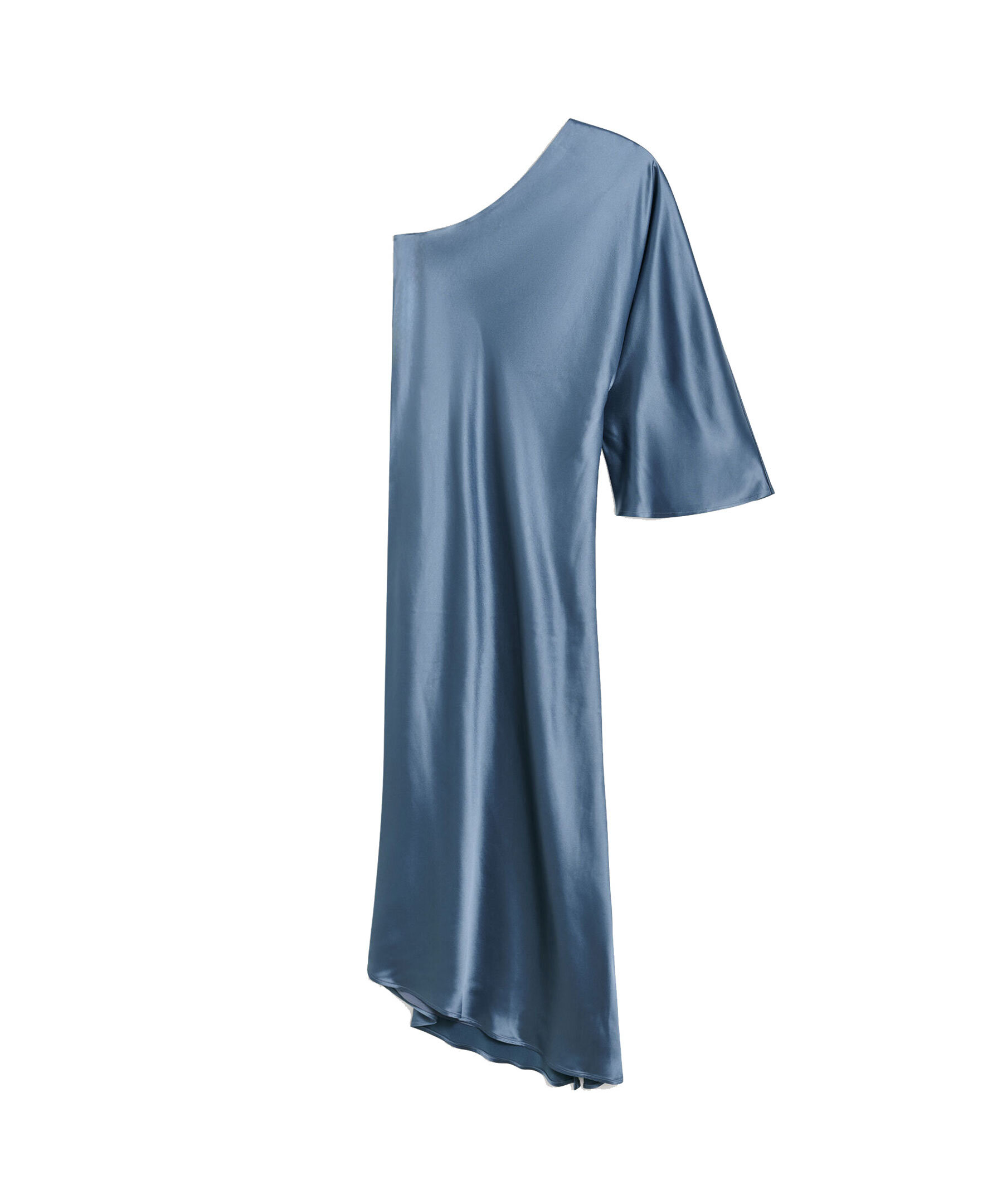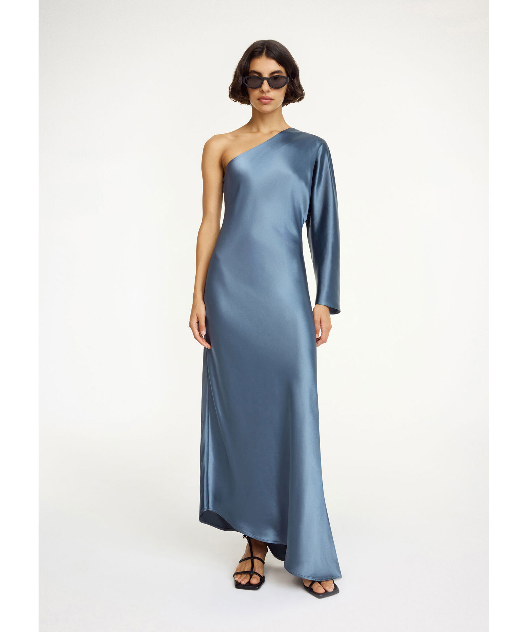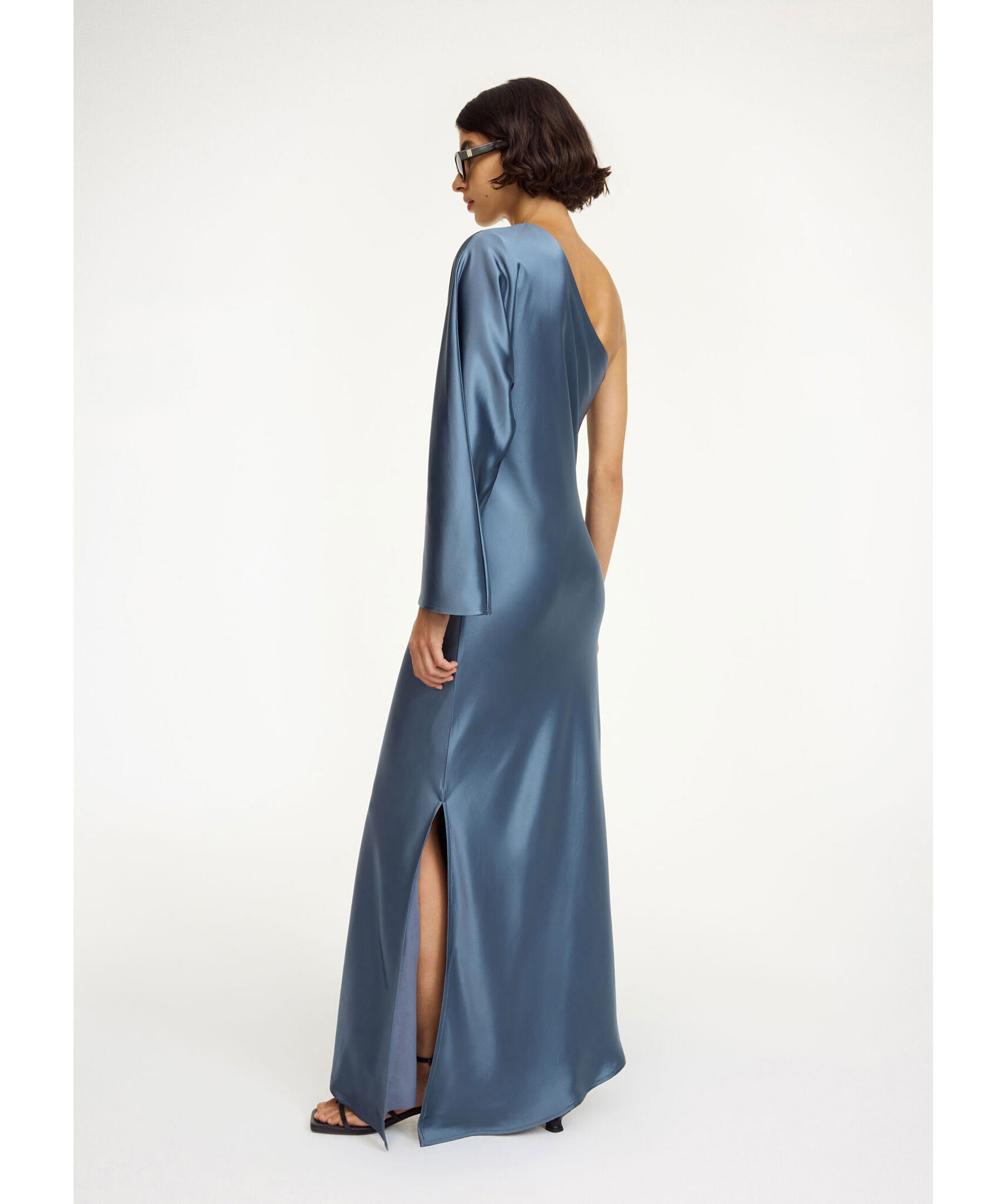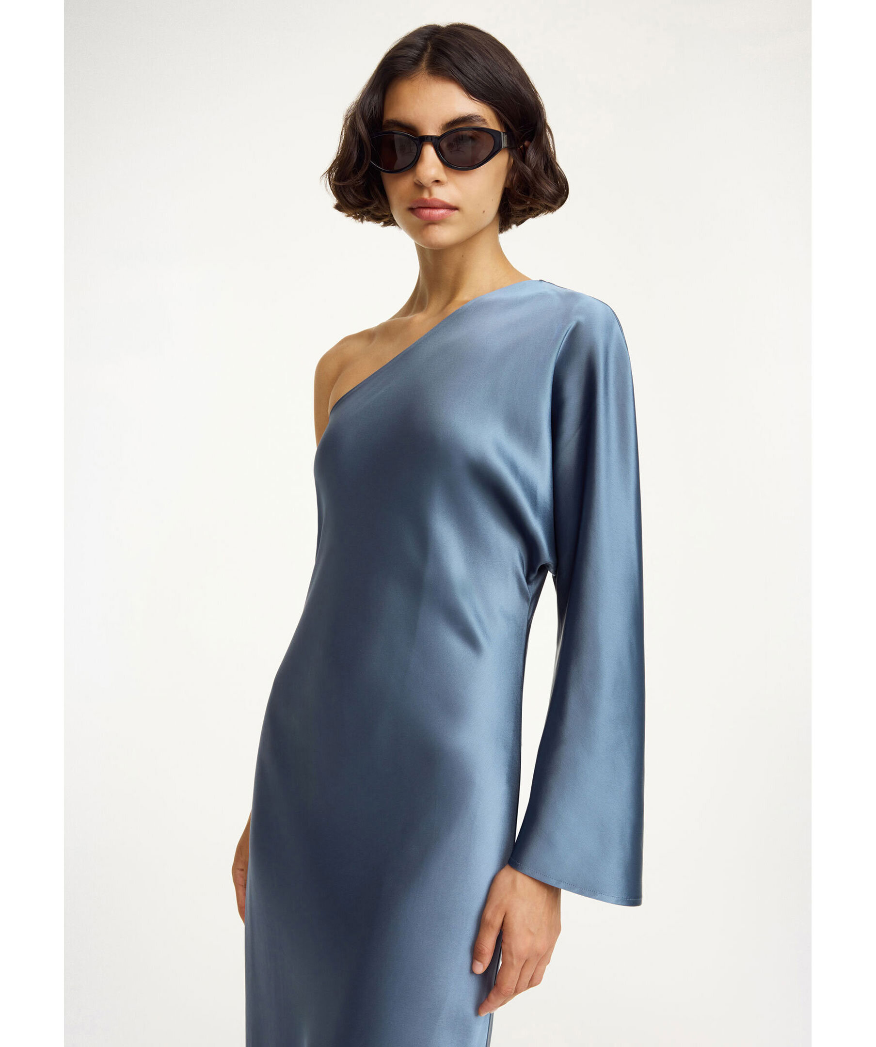 Blå klänning från By Malene Birger. Klänningen har en bar axel och den andra ärmen är vid. Den är snedskuren vid slutet och har en slits. En elegant långklänning med en följande siluett. Tillverkad av en acetatblandning.