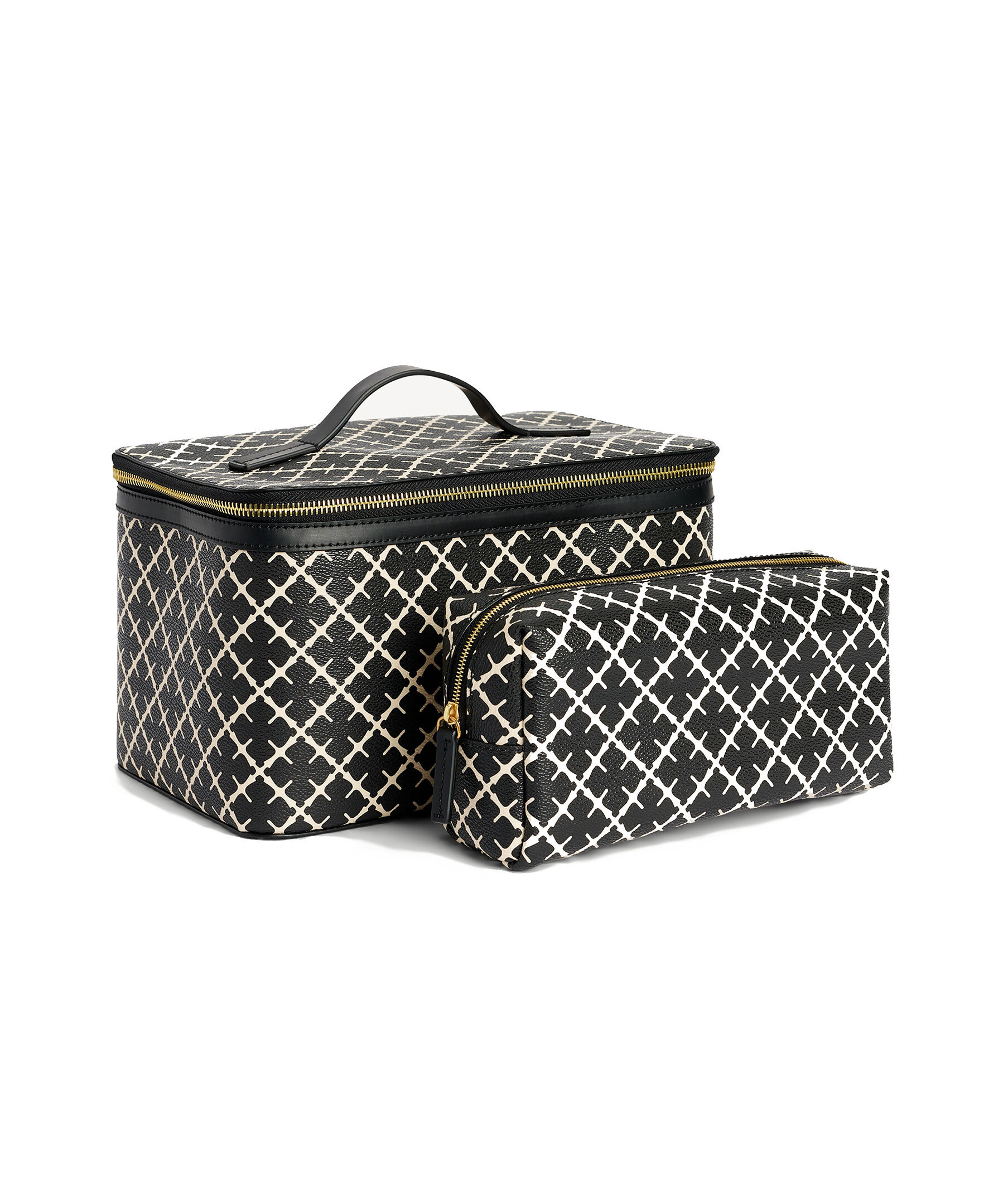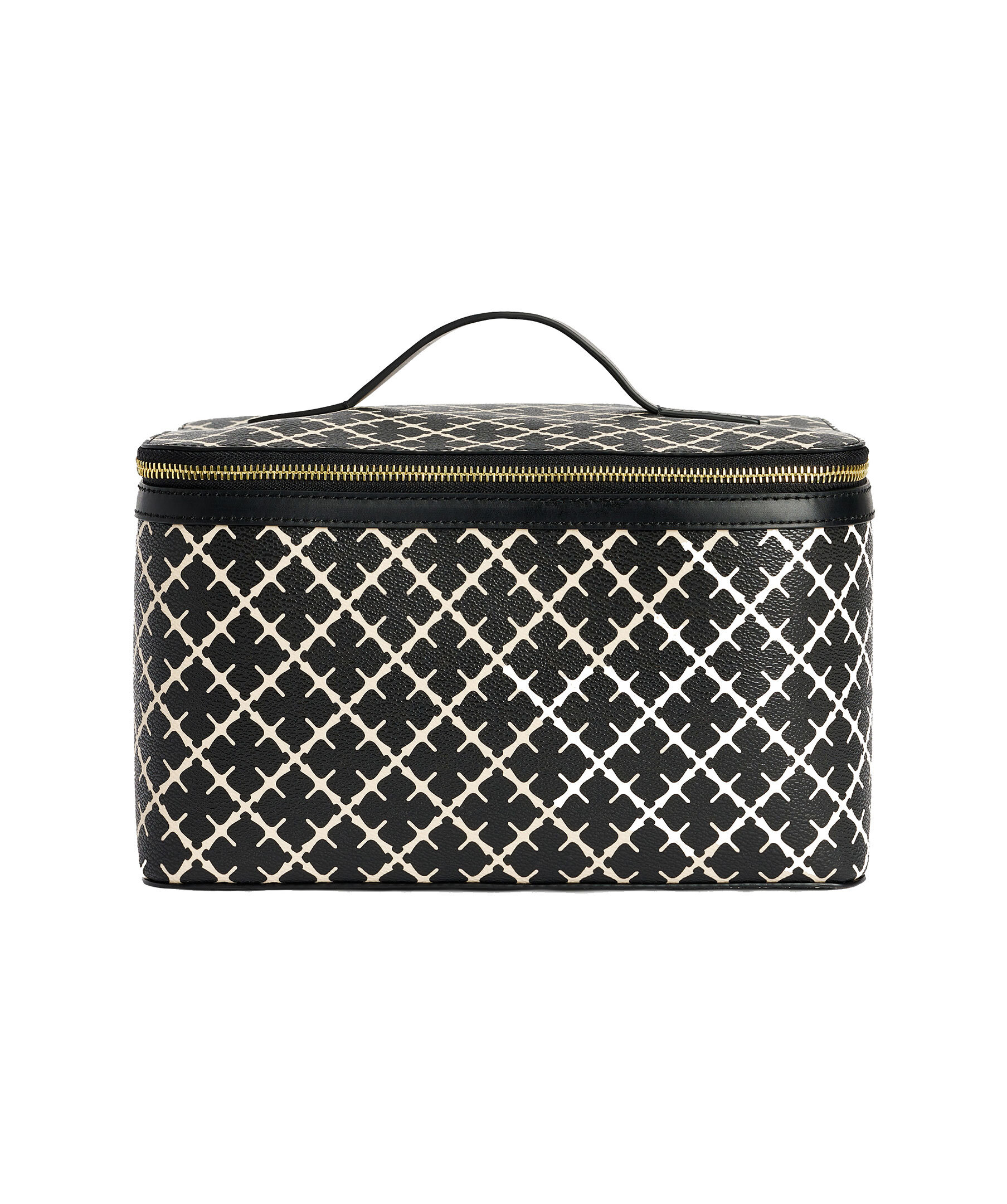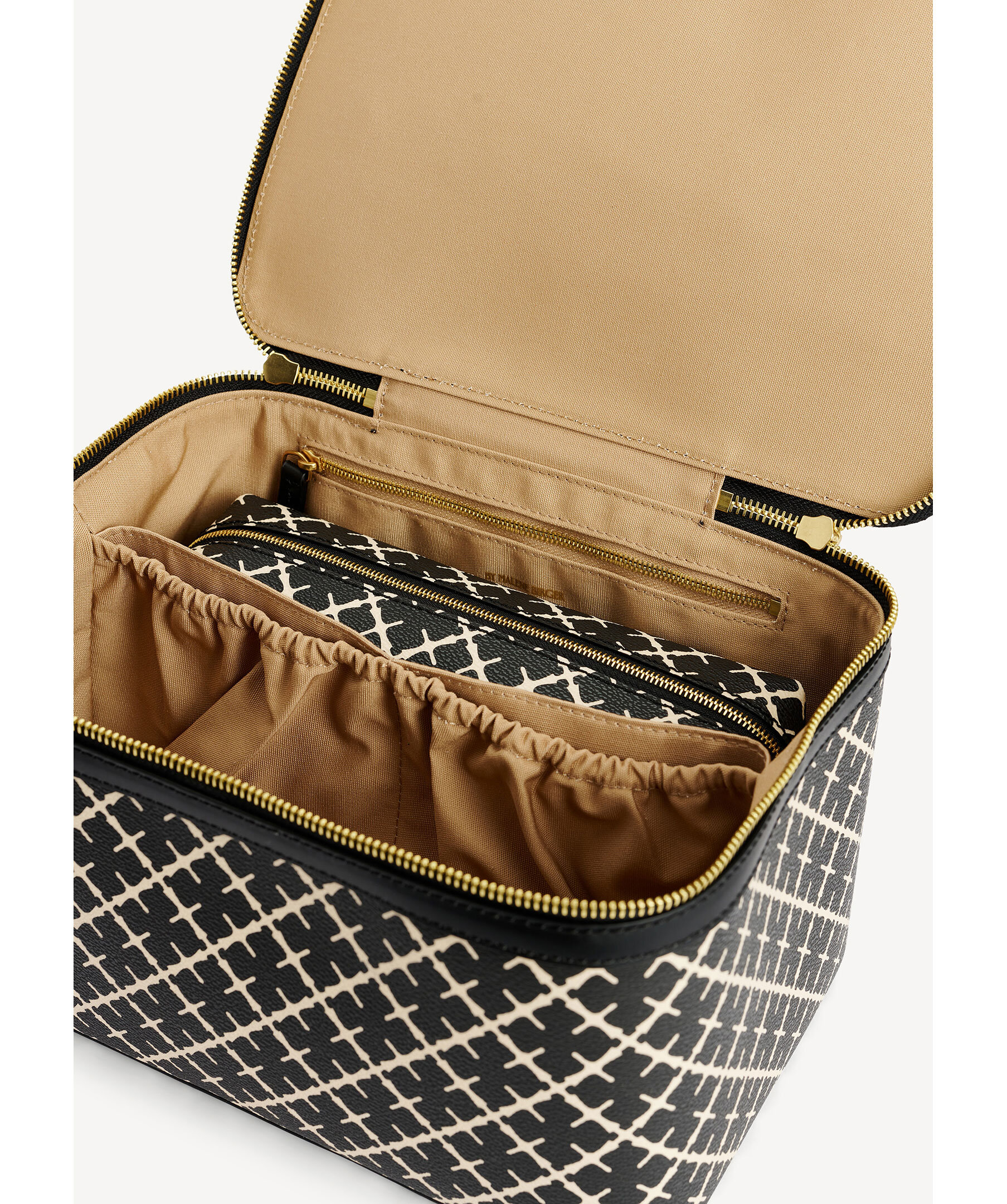 Stor necessär från By Malene Birger i deras klassiska mönster i svart och beiget. Stängs med guldfärgat blixtlås, har två stora inre fack, två elastiska fickor och en blixtlåsficka. Inuti finns en mindre necessär som går att ta ut, den stängs med dragkedja. Slitstarkt innetyg i bomull i beiget samt handtag på ovansidan. Tillverkad i PVC och har detaljer i läder. Mått: 27 x 16 x 17 cm.