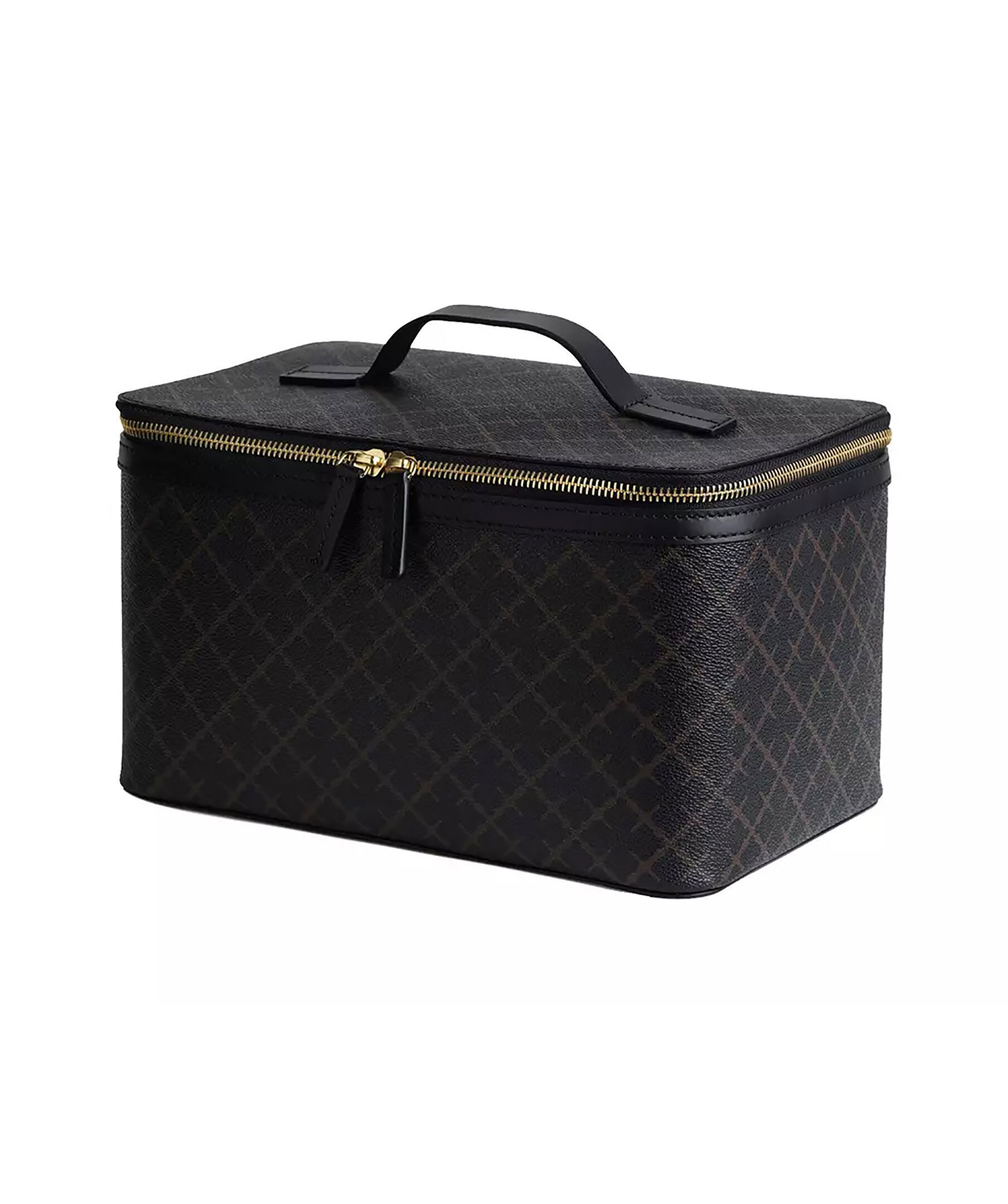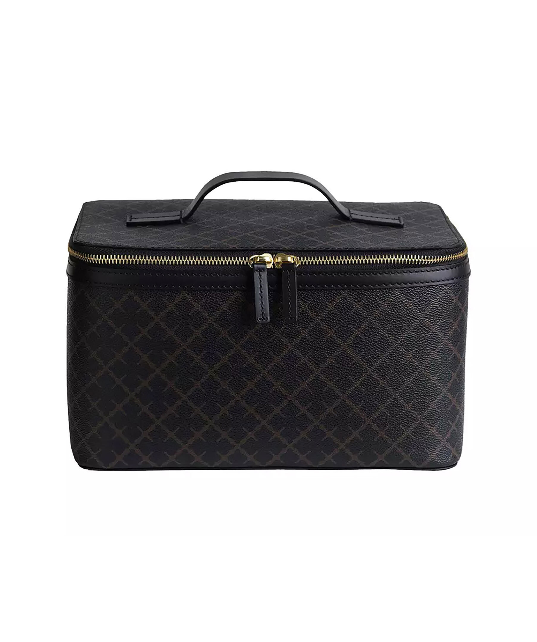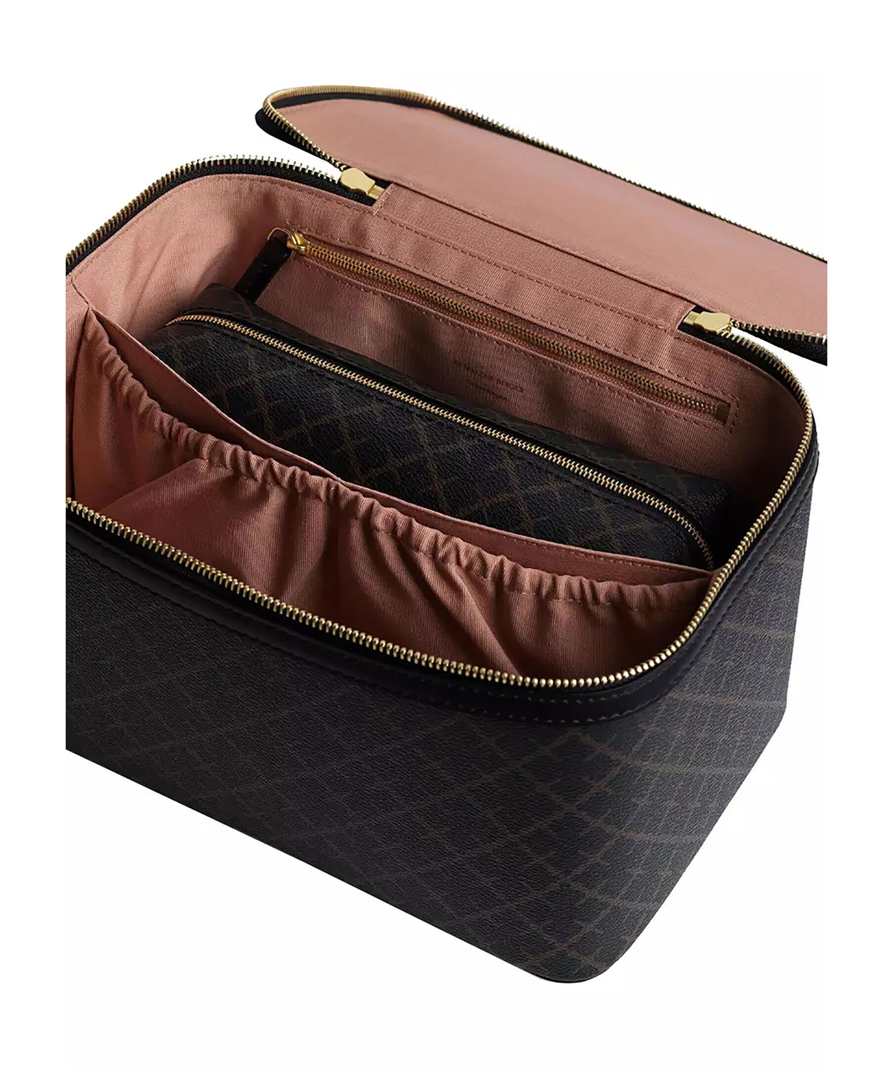 Stor necessär från By Malene Birger i deras klassiska mönster i svart och grått. Stängs med guldfärgat blixtlås, har två stora inre fack, två elastiska fickor och en blixtlåsficka. Inuti finns en mindre necessär som går att ta ut, den stängs med dragkedja. Slitstarkt innetyg i bomull i färgen gammelrosa samt handtag på ovansidan. Tillverkad i PVC och har detaljer i läder. Mått: 27 x 16 x 17 cm.