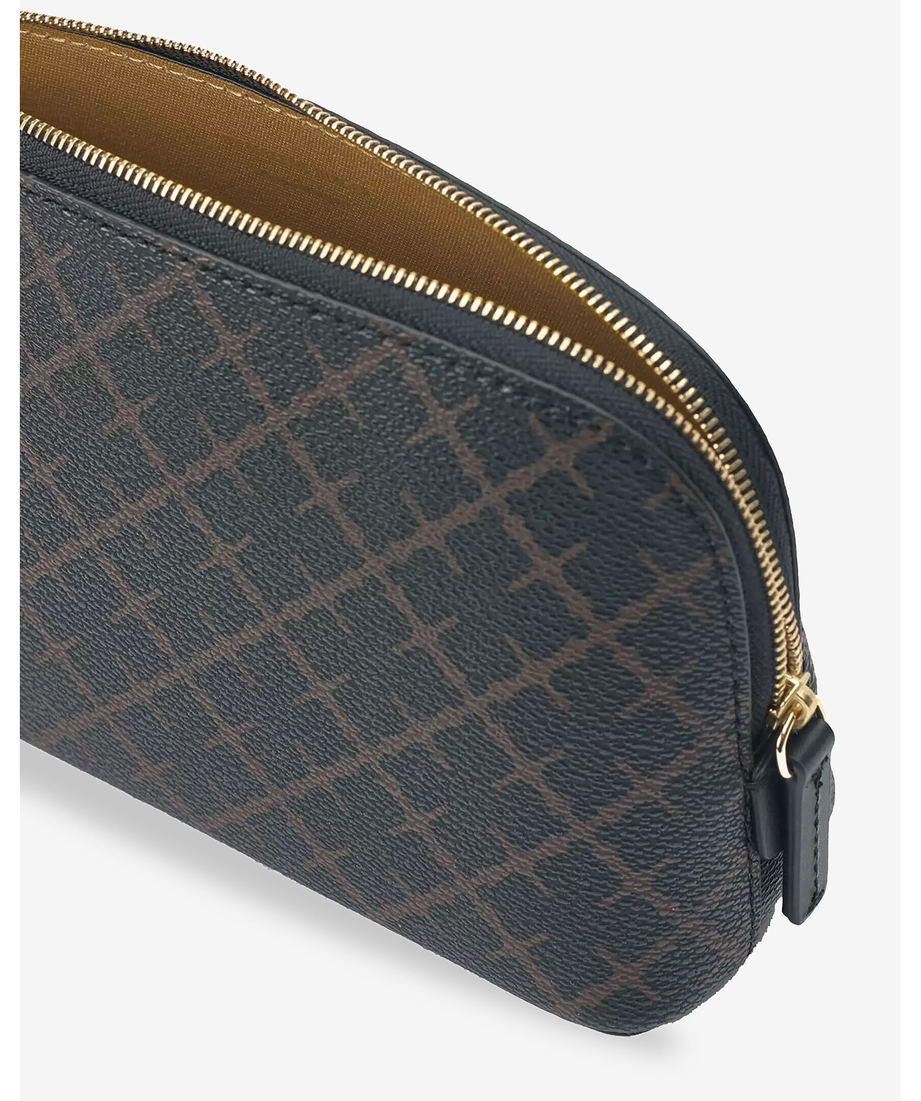 Mörkbrun necessär från By Malene Birger med deras klassiska blommönster. Stängs med guldfärgat blixtlås. Tillverkad av PVC.