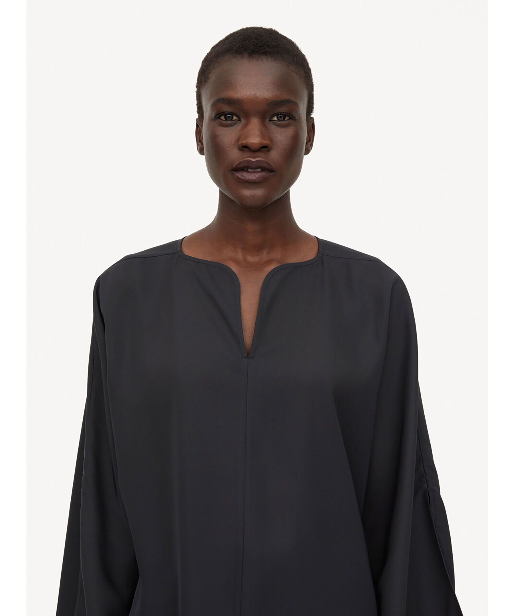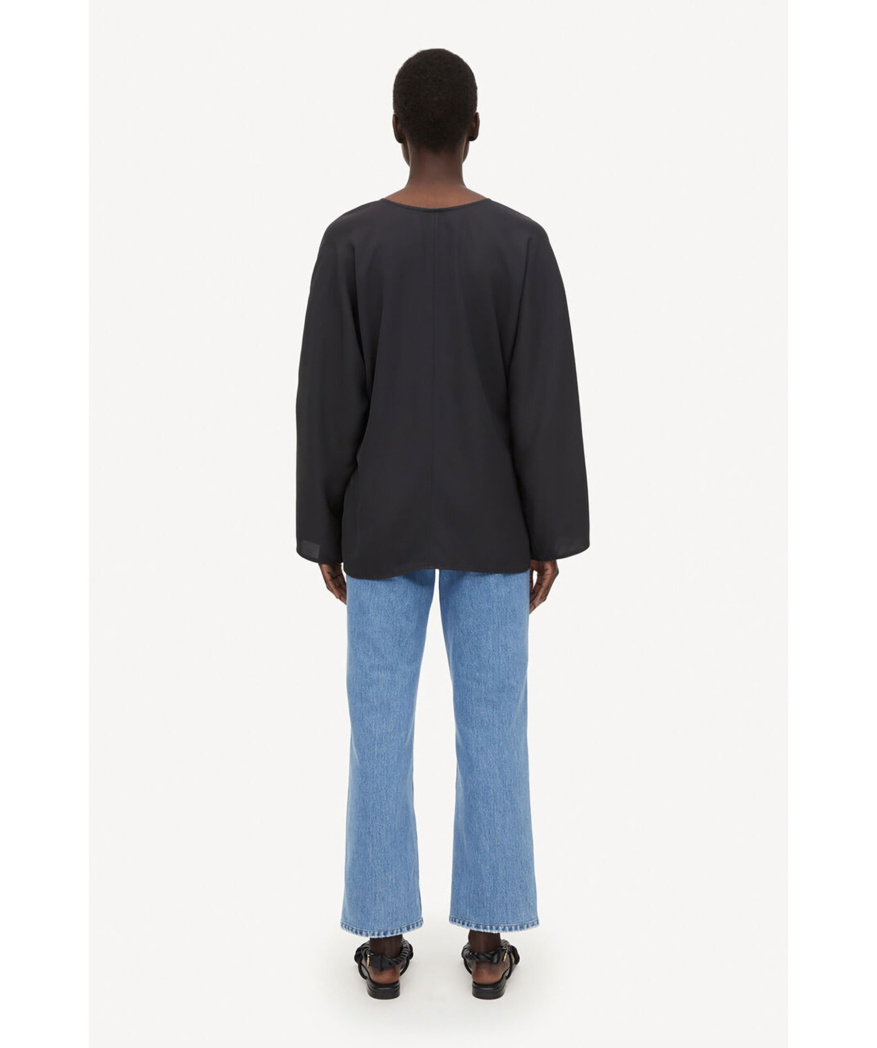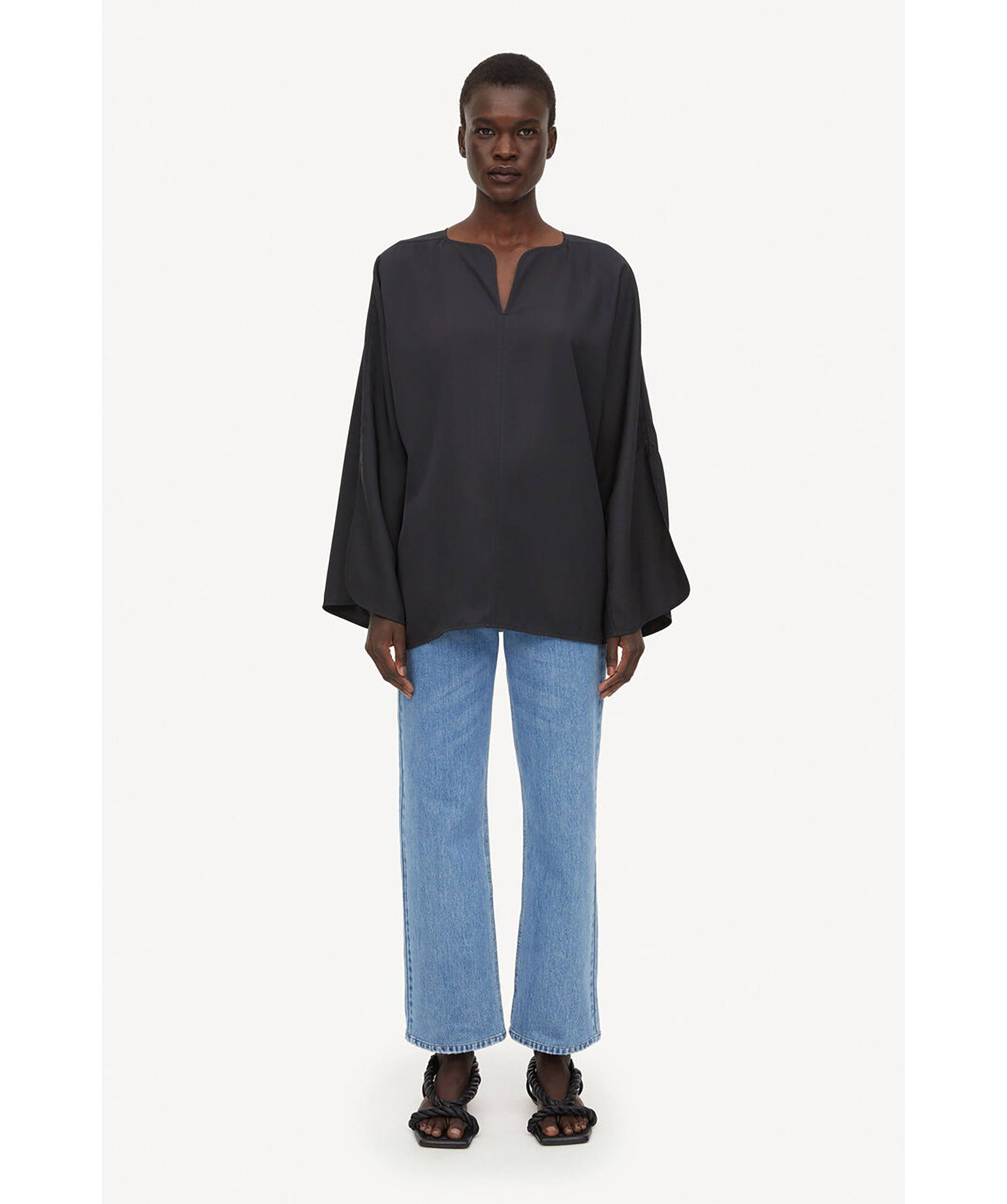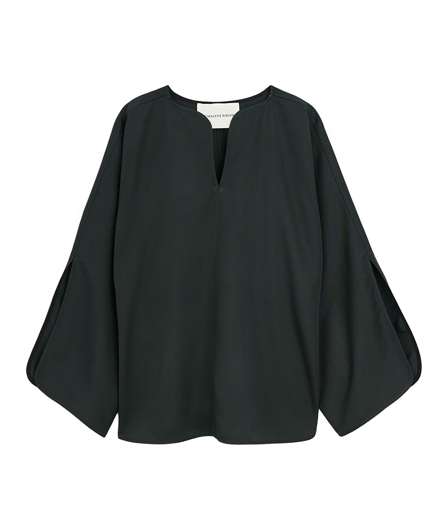 Svart Blus i Ull från By Malene Birger. V-ringad. Vida ärmar med liten slits vid ärmslut. Avslappnad passform. Tillverkad i 100% Ull. Rundad kand nedtill vid plaggslut.