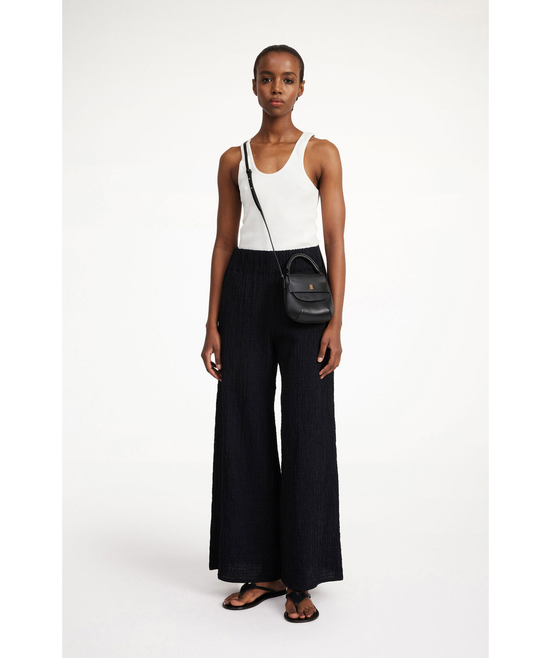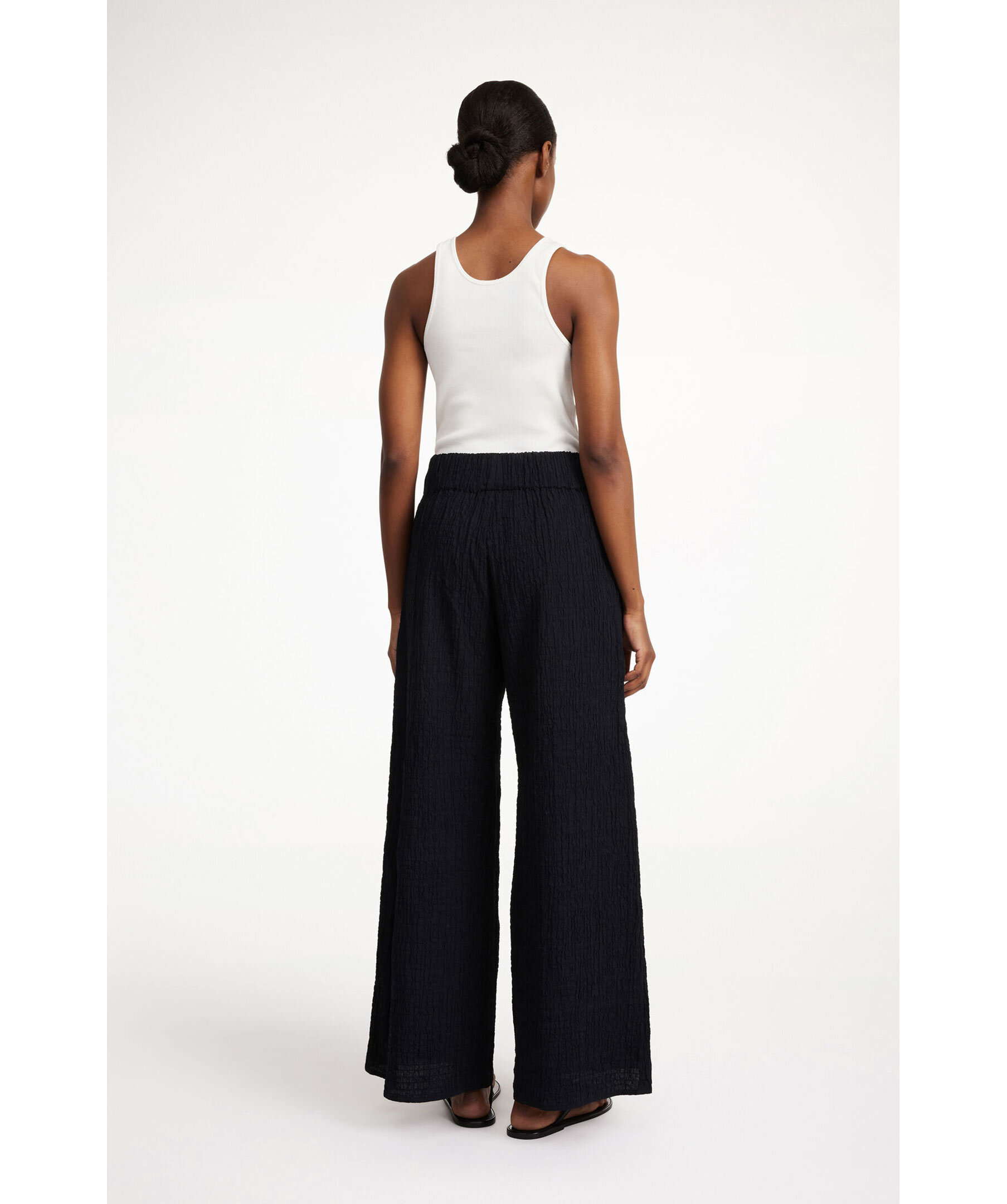 Svarta byxor från By Malene Birger. Breda byxben, fickor i sidorna och elastiskt mudd i midjan.