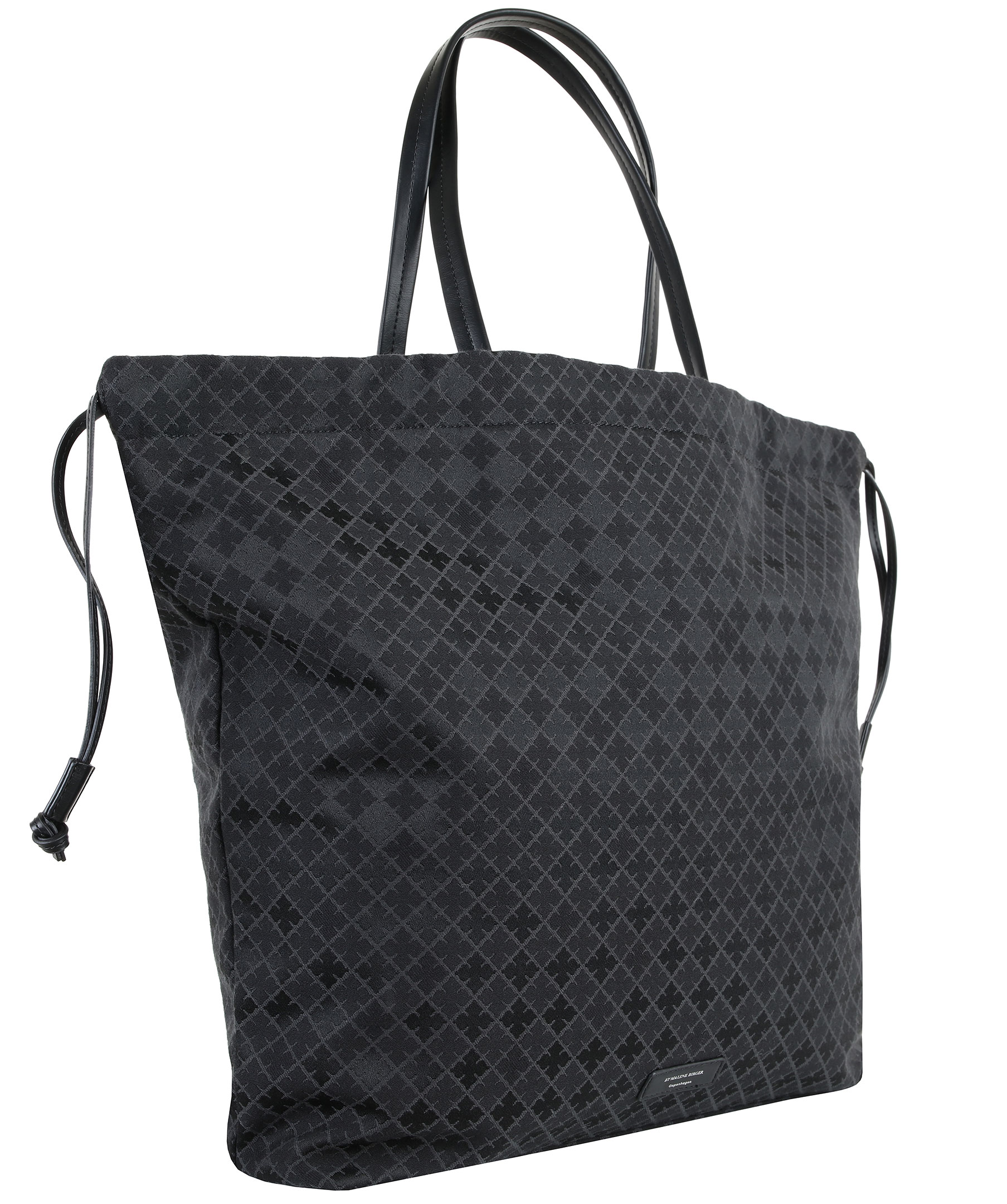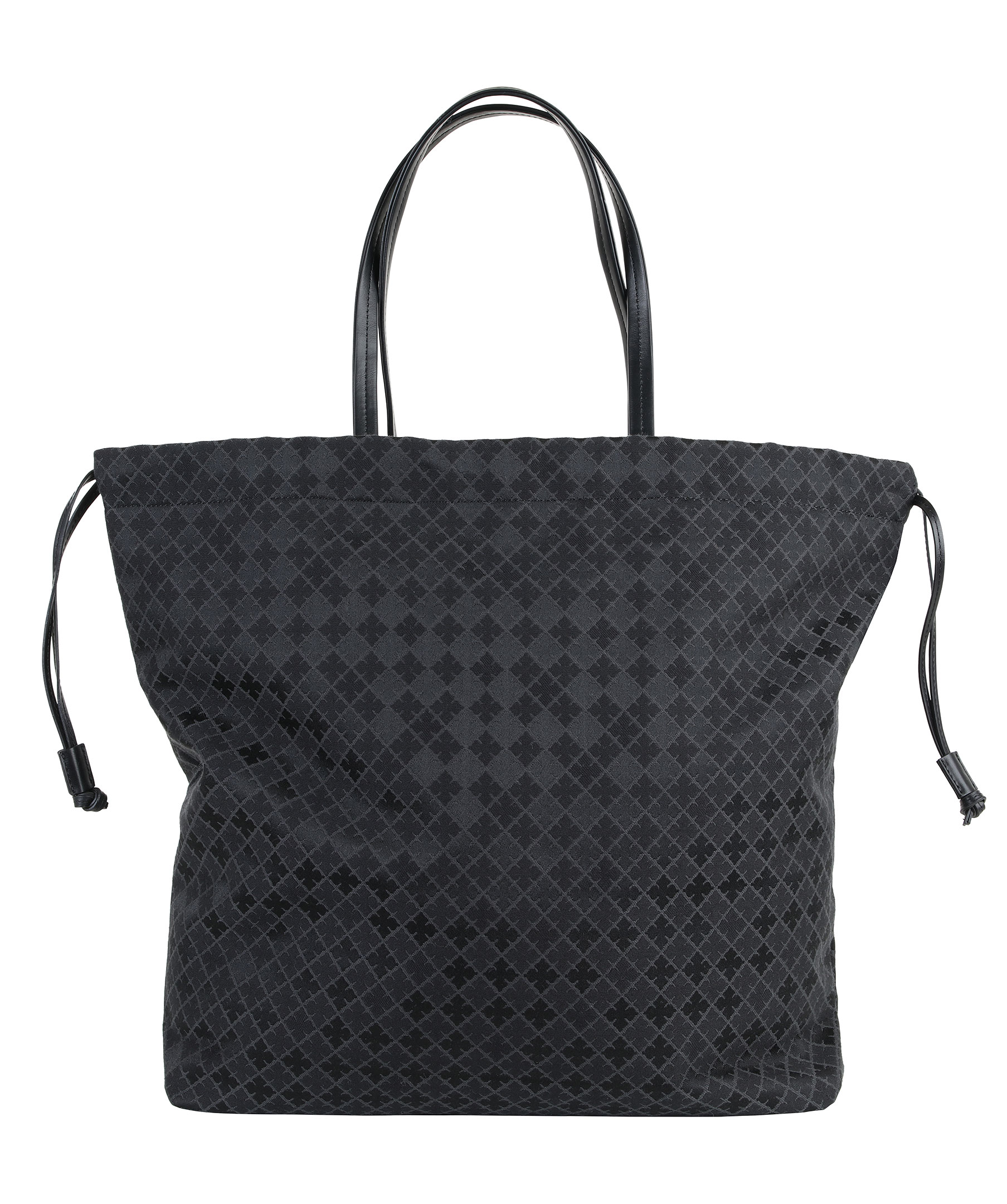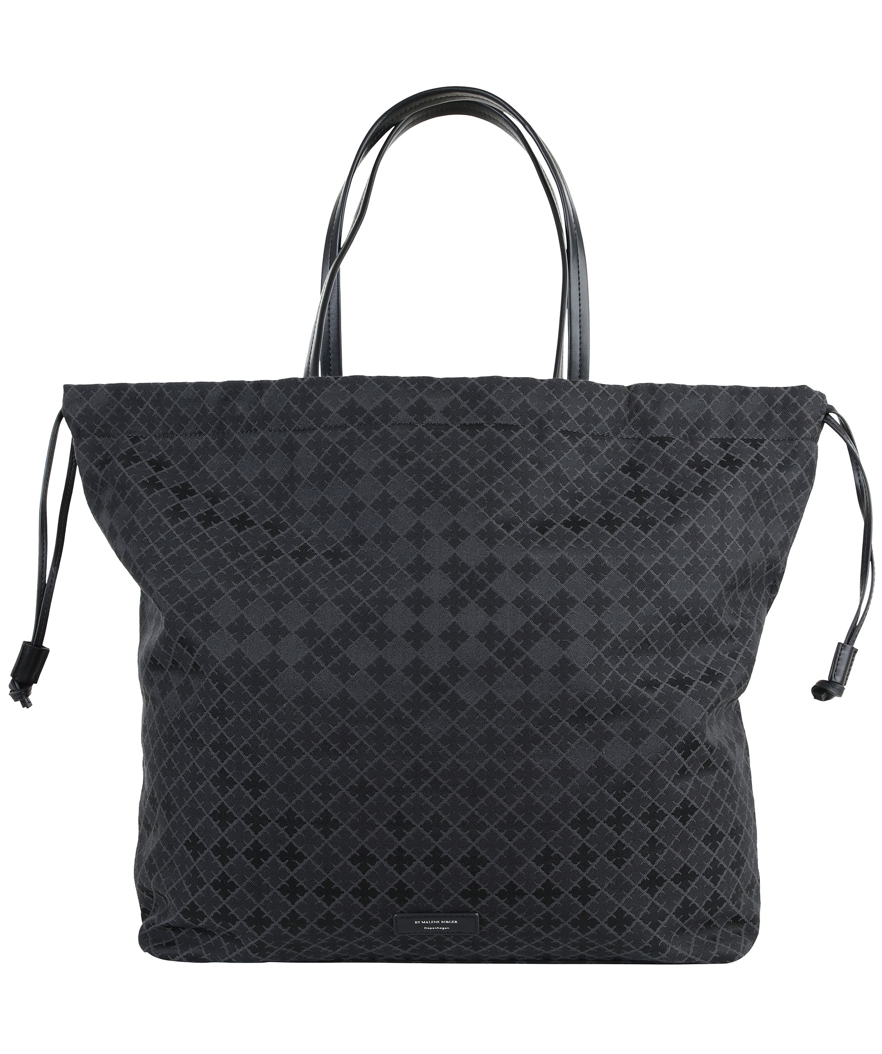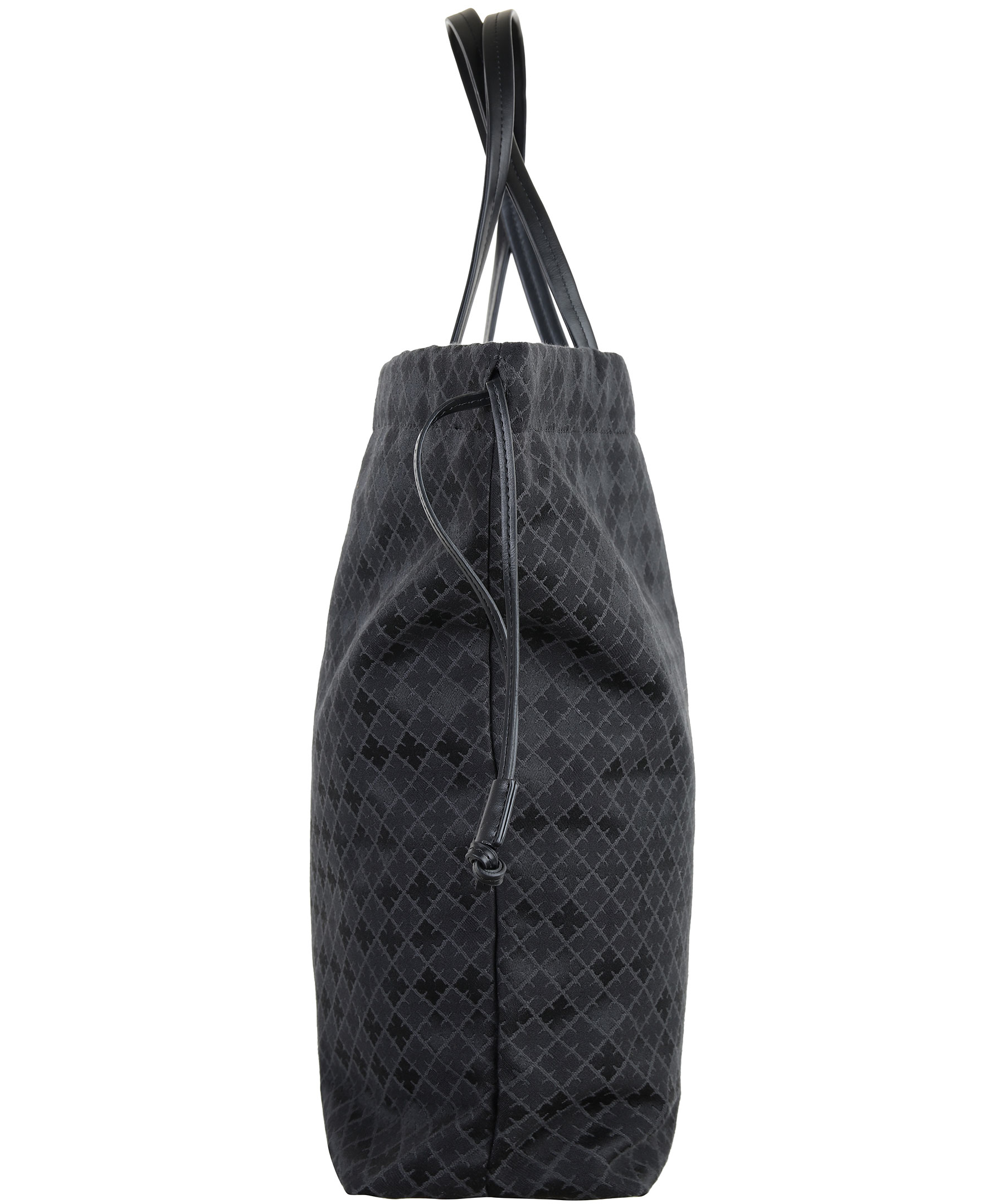 Svart mönstrad handväska i stor modell, från By Malene Birger. Tillverkad i polyester. Dragsko upptill, långa bärremmar, ett invändigt fack.