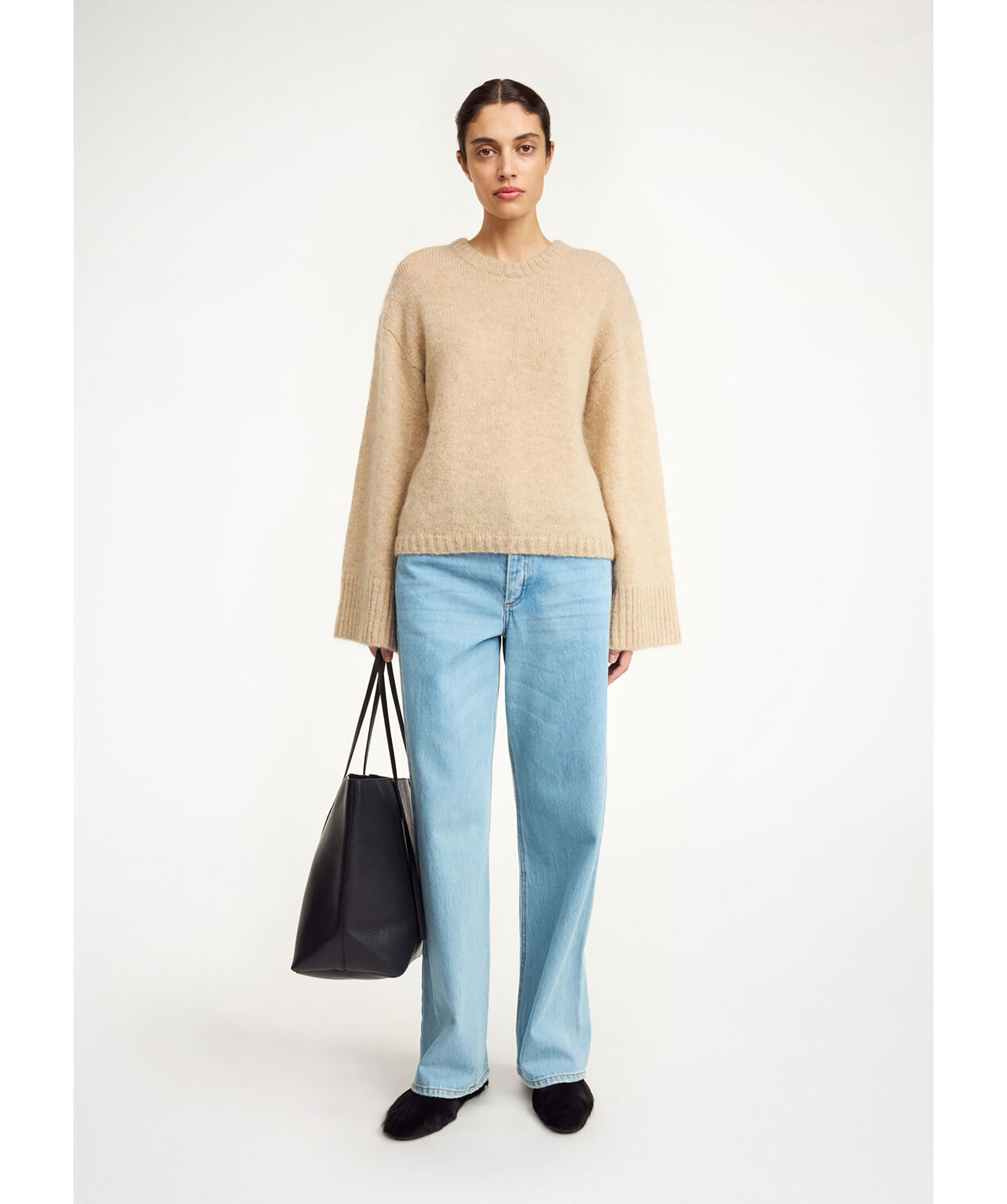 Beige stickad tröja från By Malene Birgrer. Tillverkad av en blandning av mohair och ull, den suveräna mjukheten hos Cierra-tröjan matchas av dess moderna dragningskraft. Plagget har ribbade kanter längs sin runda halsringning och vida ärmar, och är formad med tappade axlar som bidrar till dess lätt strukturerade form. Lös passform.