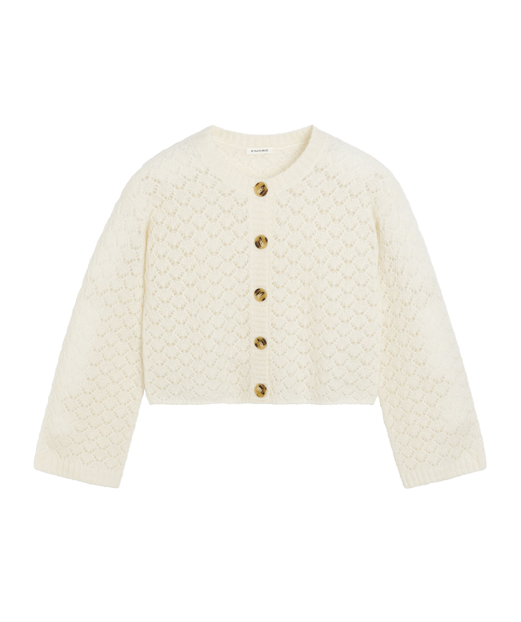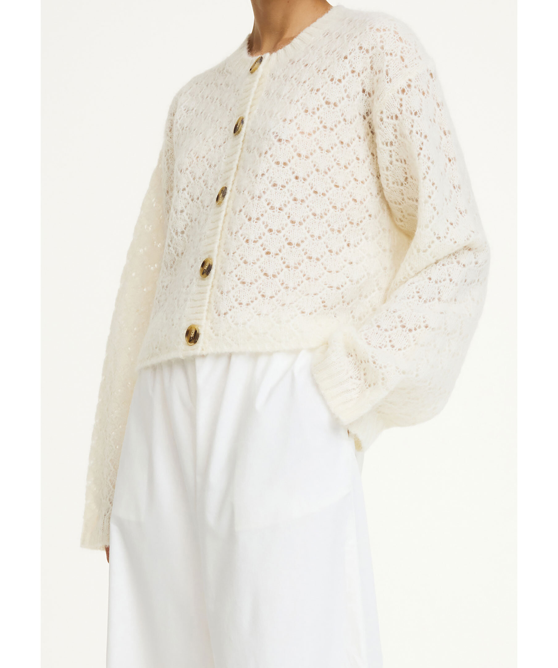 Krämvit hålstickad kofta från By Malene Birger. Koftan har ribbstickade detaljer och stängs med knappar. Tillverkad i en ullblandning.