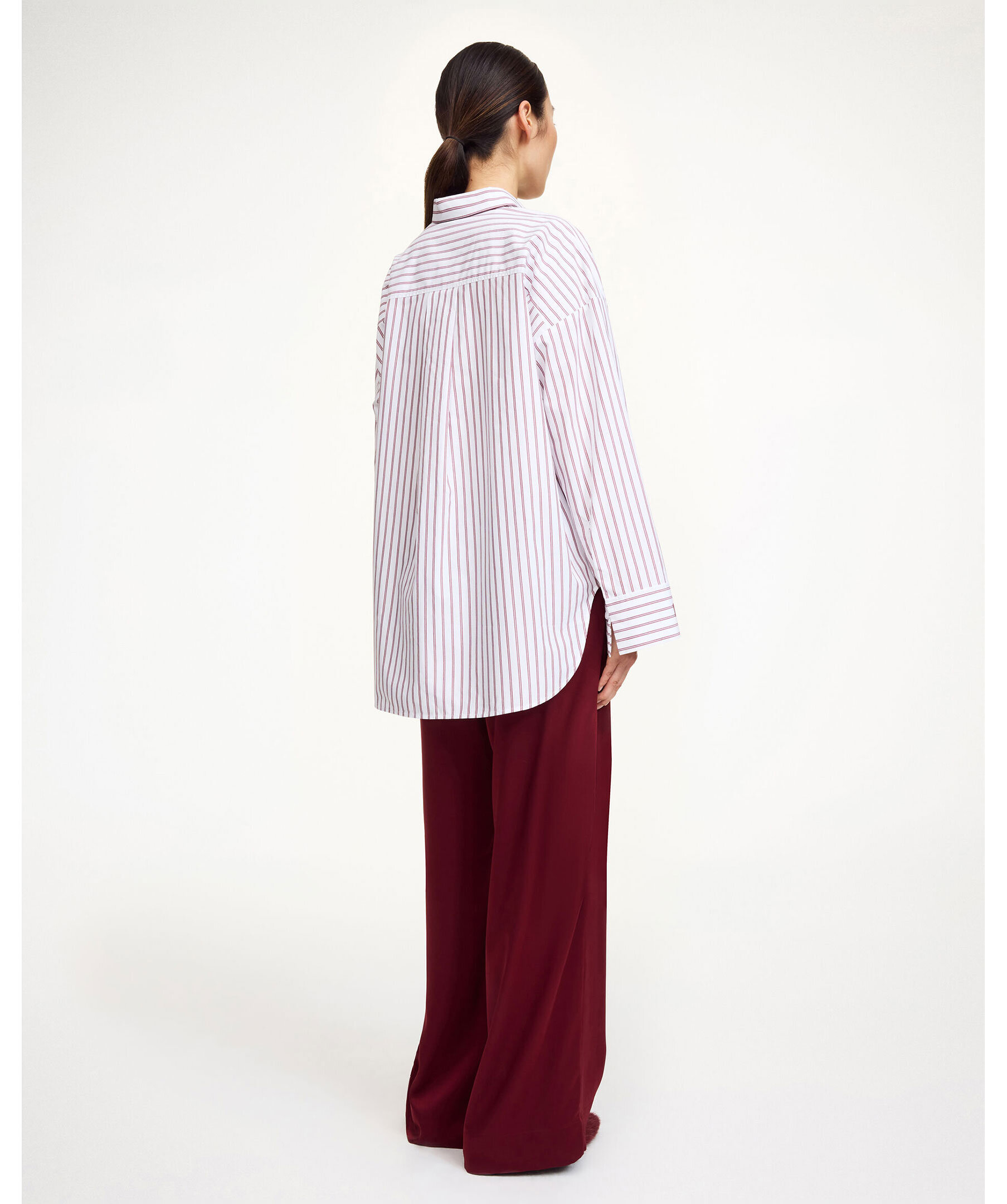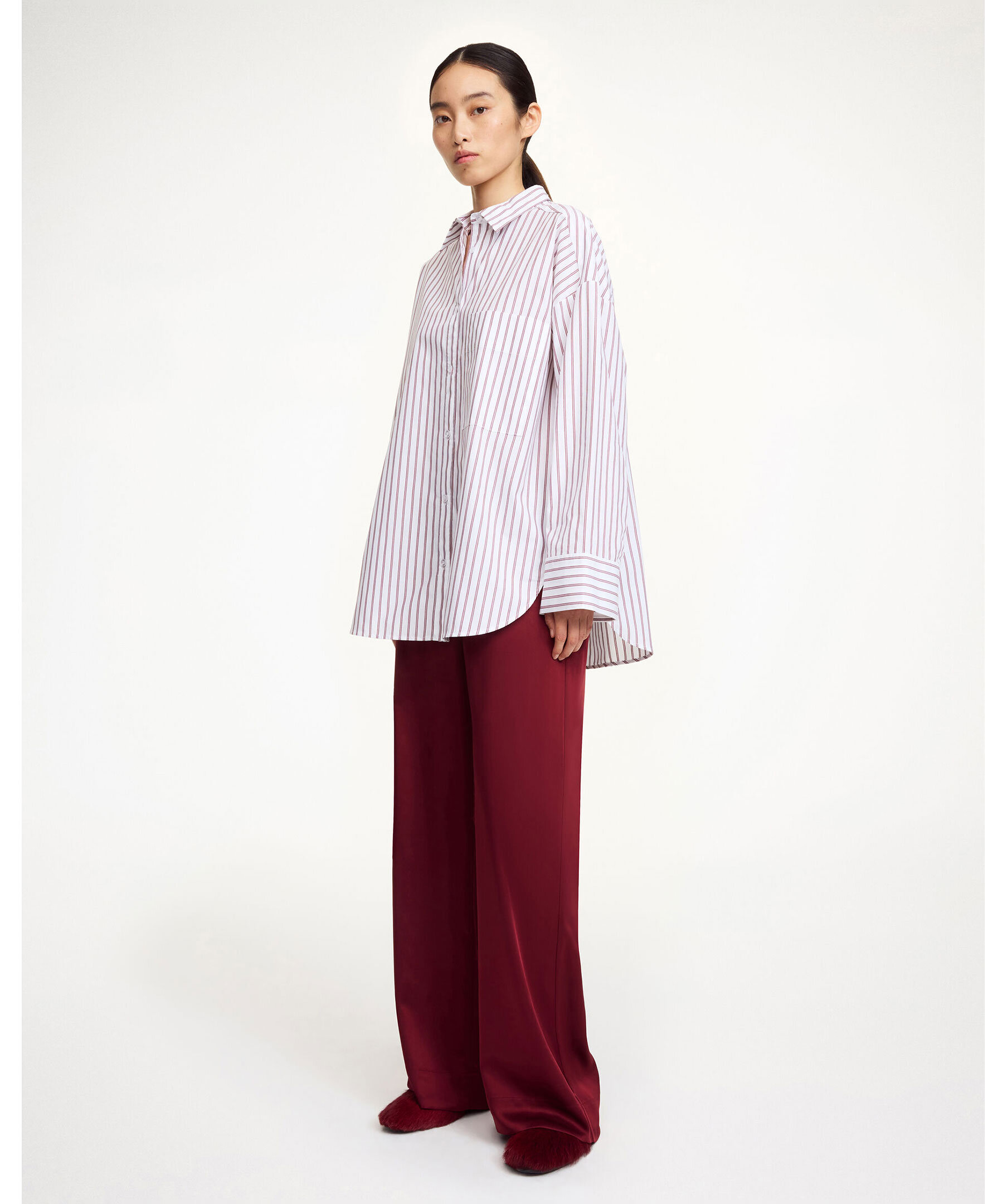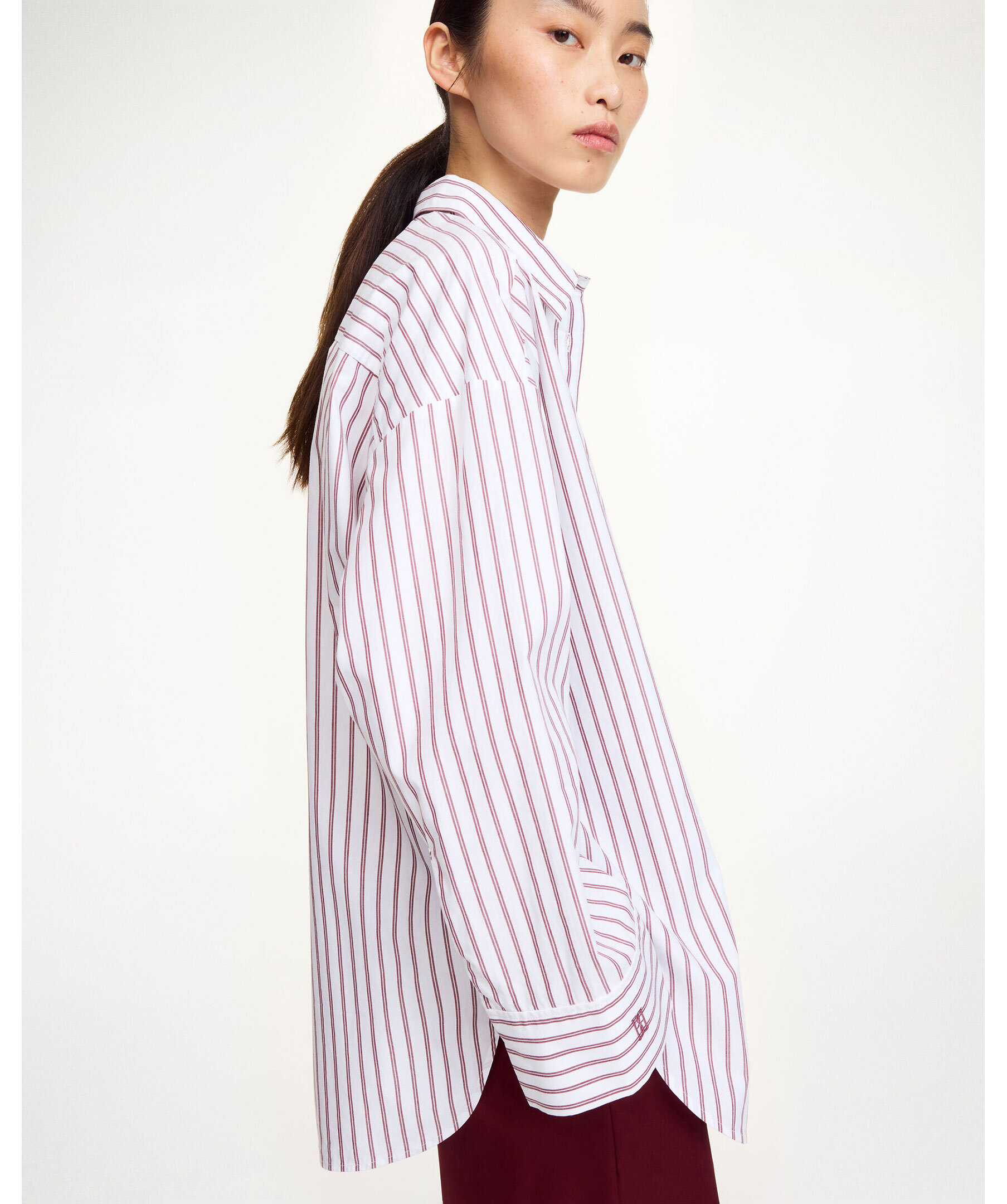 En tidlös randig skjorta från By Malene Birger, tillverkad i mjuk ekologisk bomull. Den klassiska designen med hel knäppning framtill och en elegant skjortkrage gör den till ett mångsidigt plagg som passar både till vardags och arbete. Bär den instoppad i skräddarsydda byxor för en sofistikerad look, eller öppen över boyfriend-jeans för en avslappnad men stilren känsla