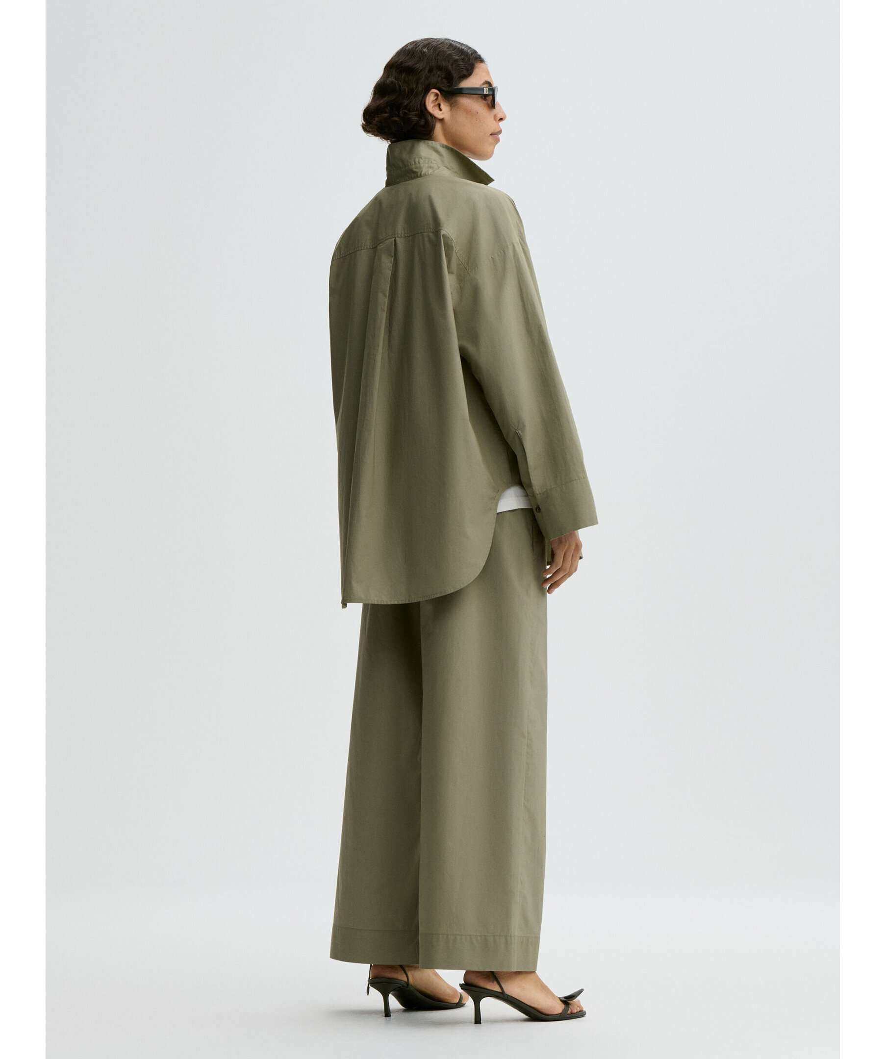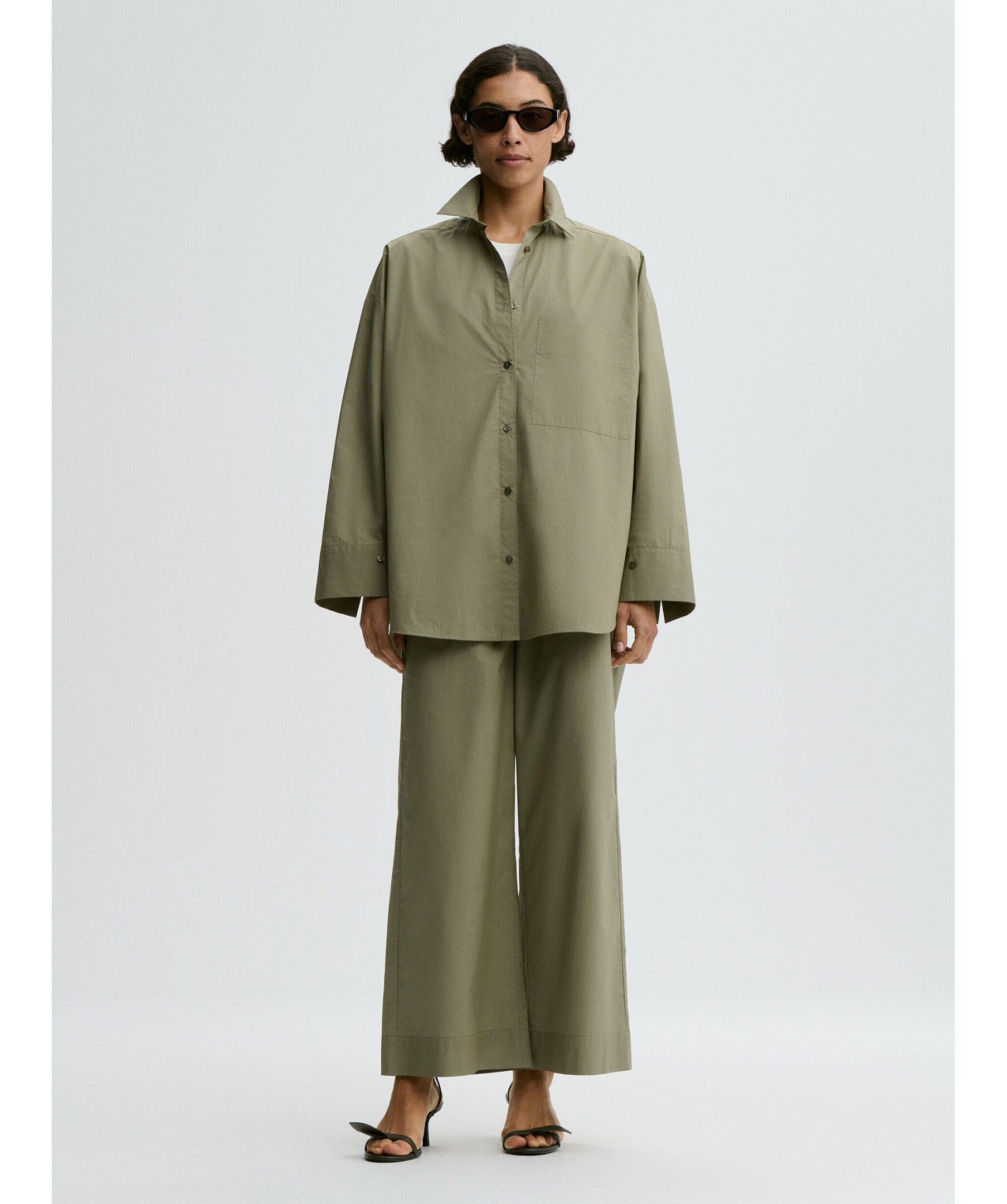 Grön oversized Derris Organic Cotton Shirt från By Malene Birger. Skjortan har klassisk skjortkrage, hel knappslå framtill, rundade fållar och en bröstficka, gjord i mjuk och krispig ekologisk bomull som ger en avslappnad och tidlös look – perfekt att bära över jeans eller till skräddade byxor.