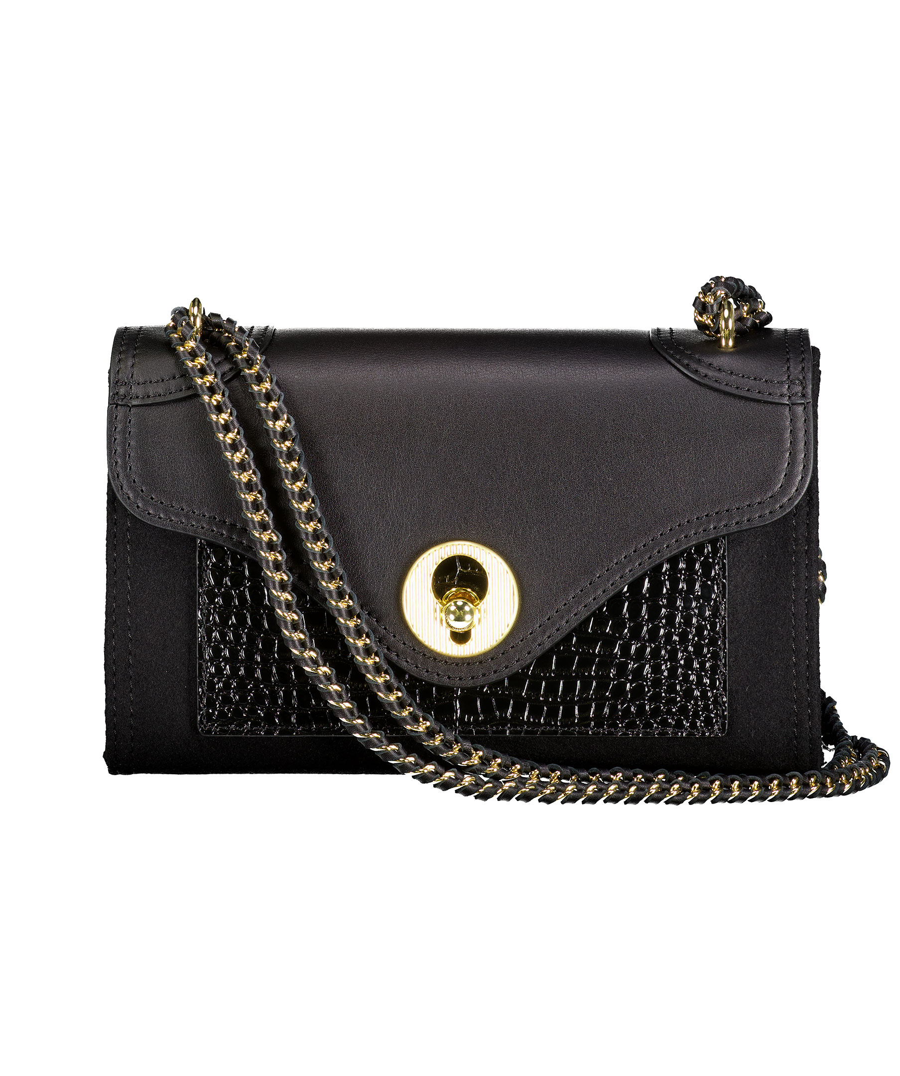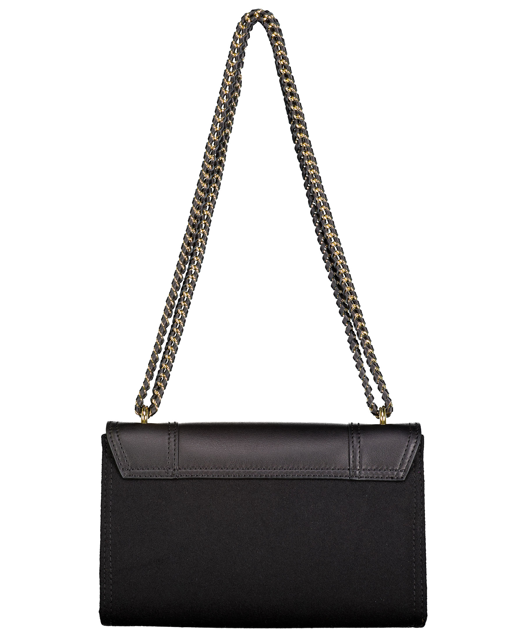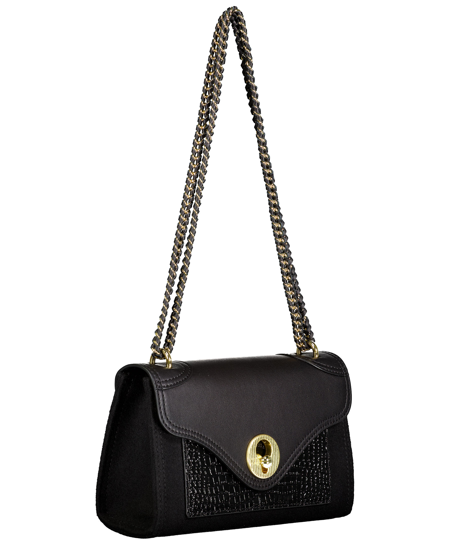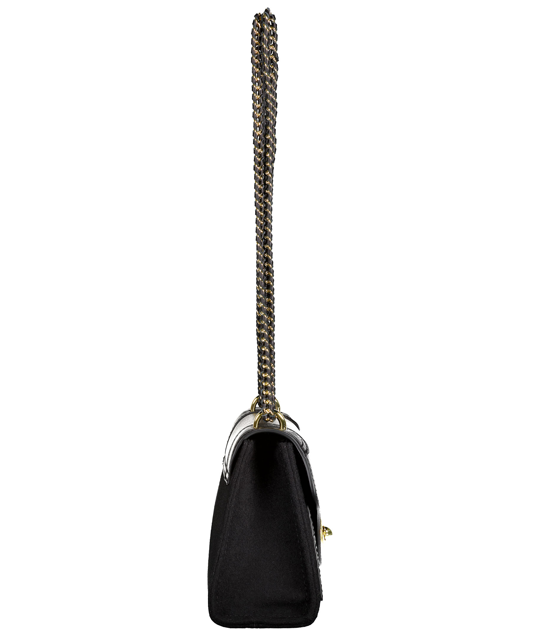 Svart, liten handväska från By Malene Birger. Ett fack med en ficka invändigt och ficka på framsidan i glansigt ormskinnsmönster. Väskan stängs med ficklock och låsanordning, under ficklocken finns en liten guldfärgad logotyp. Ficklocket är tillverkat i svart läder och resterande väska är i svart ull. Axelband i kedjor som är inflätade med läder som går att ha i två lägen. Guldfärgade detaljer.