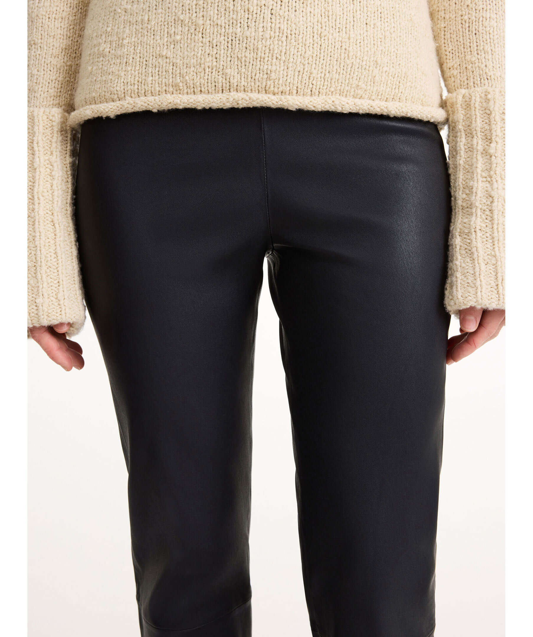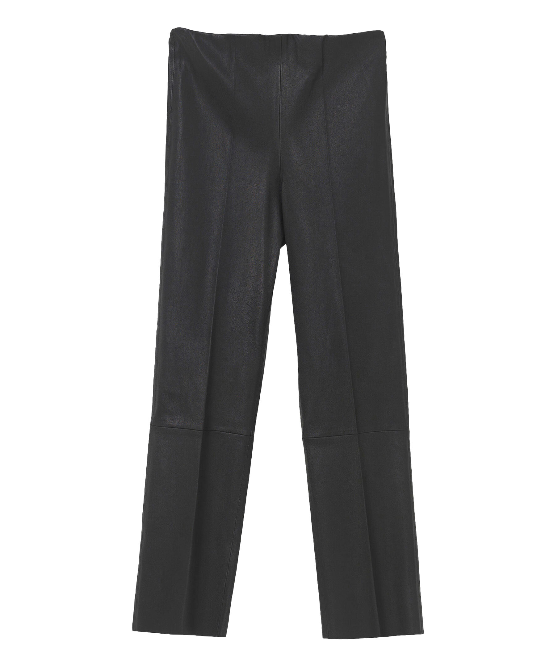 Svarta ankellånga läderbyxor från By Malene Birger. Byxorna har en flexibel, elastisk midja och raka ben. Byxorna har pressade sömmar längs framsidan och sitter bekvämt i midjehöjd. Kombinera dem med allt från skjortor till stickade plagg för en stilren look.