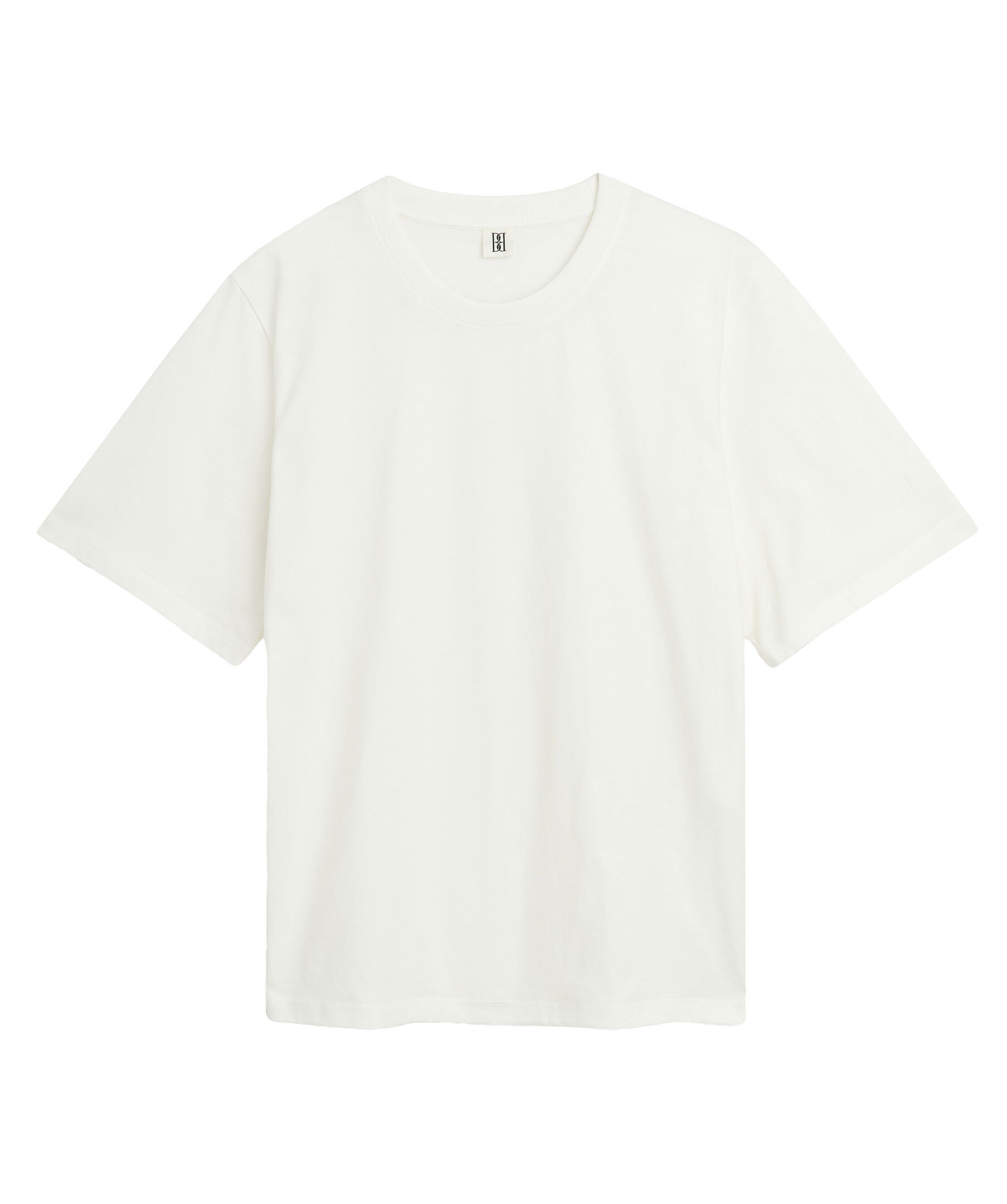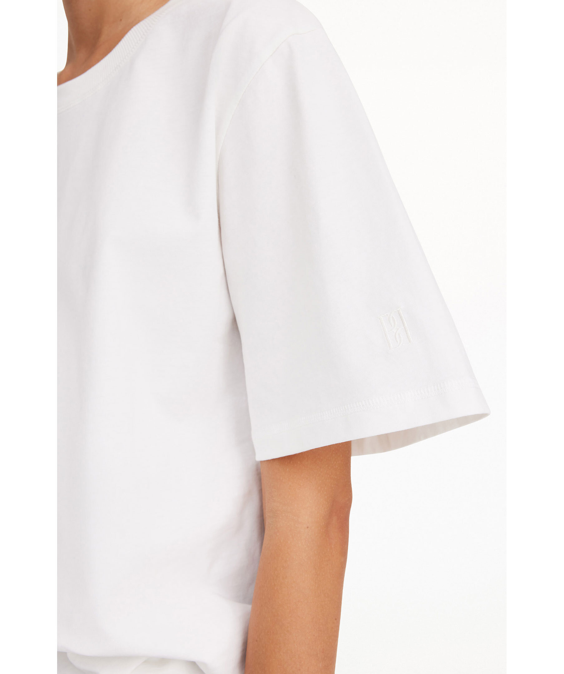 Vit t-shirt från By Malene Birger med minimalistisk design. T-shirten har en löst sittande passform med en rund halsringning, perfekt för lager på lager. Den har en diskret, ton-i-ton broderad logotyp på ena ärmen. Tillverkad i 100% ekologisk bomull.