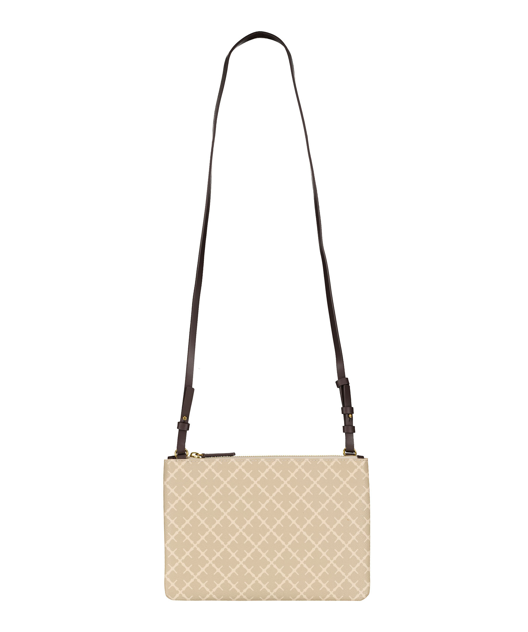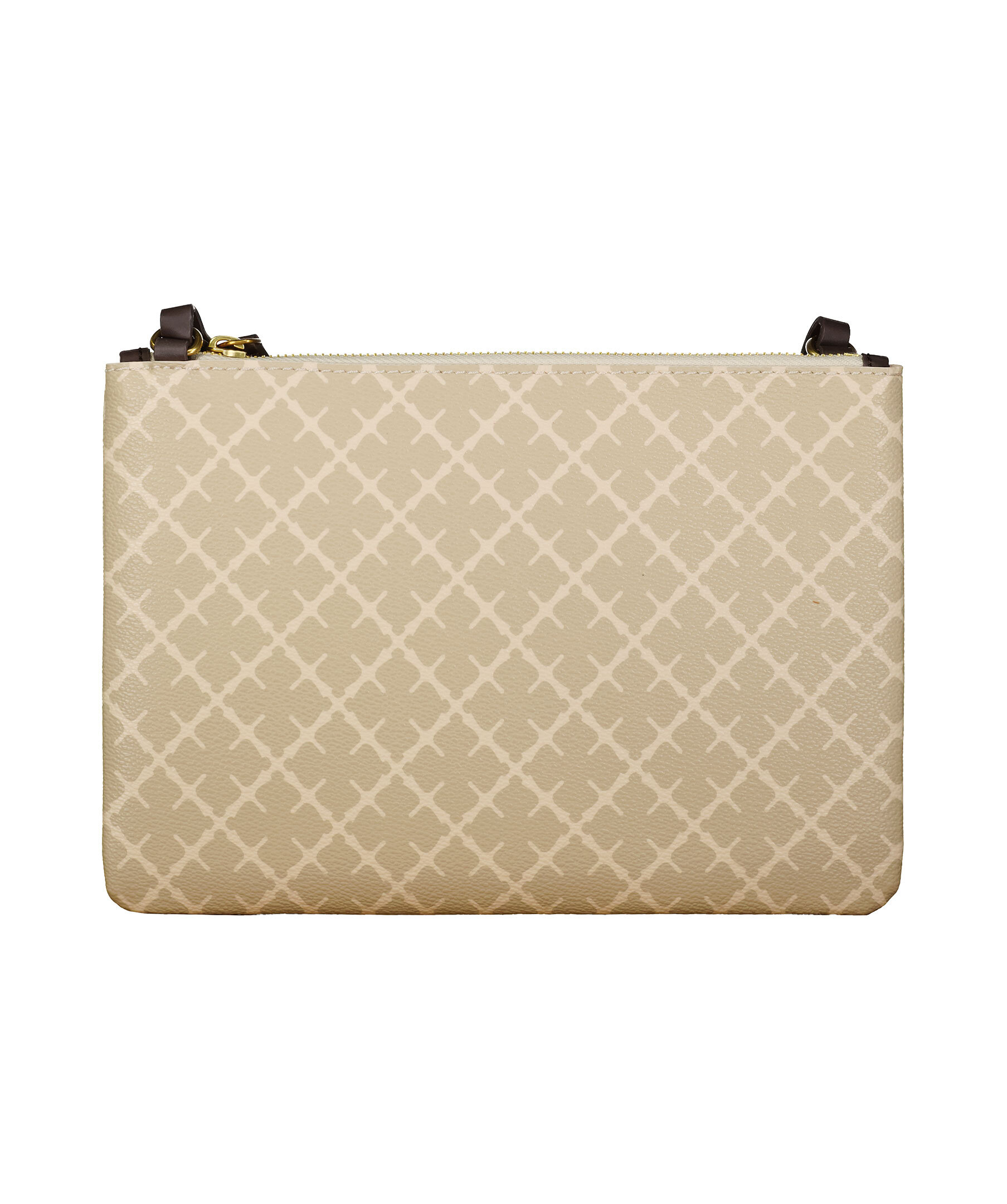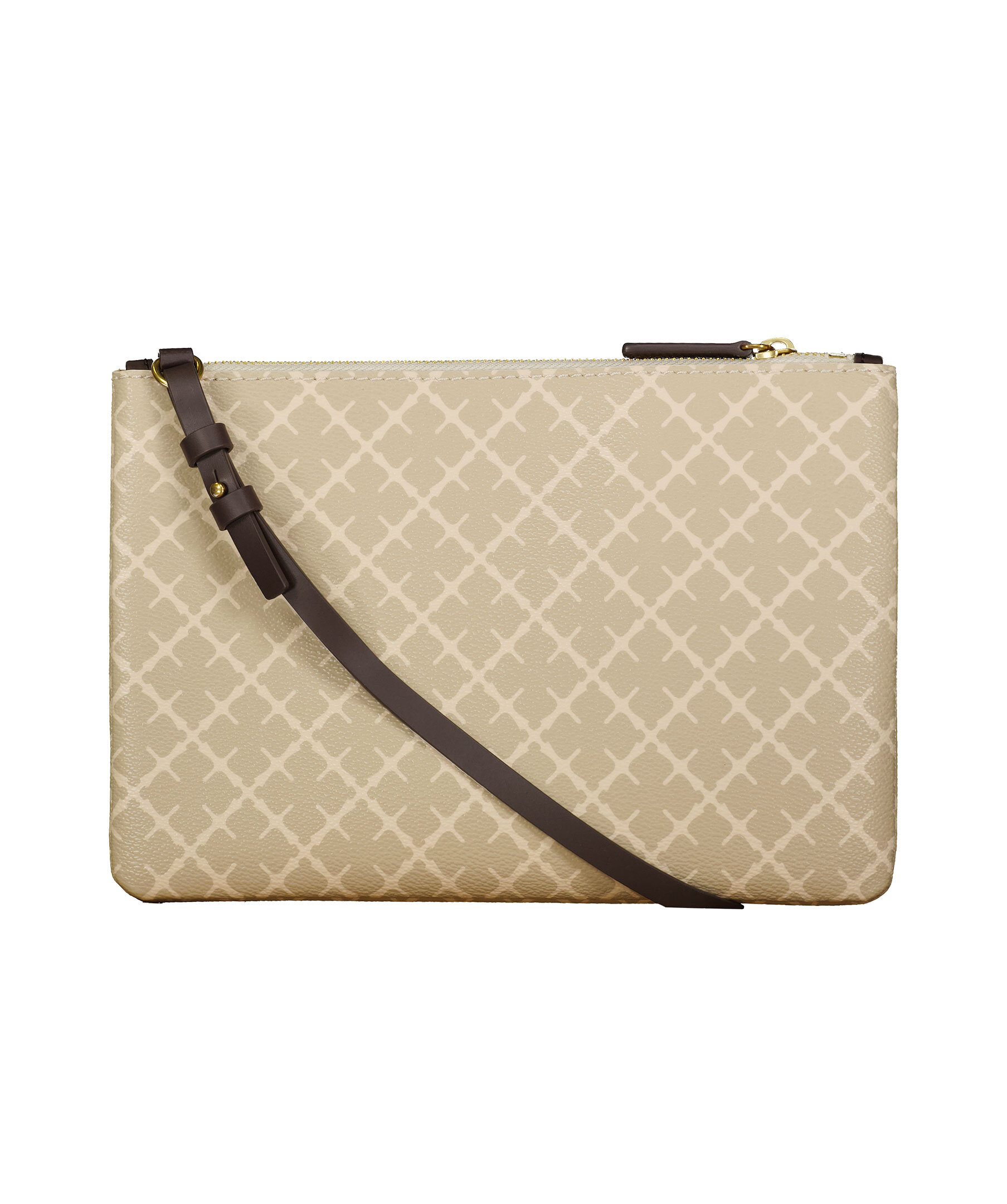 Beige, liten handväska från By Malene Birger med deras signatur monogrammönster. Ivy-väskan är ett snyggt sätt att bära med sig vardagssaker. Designen har en fyrkantig siluett och en smal justerbar, avtagbar rem. Bär den över axeln eller i handen. Stängs med dragkedja. Mått: 25cm x 17cm