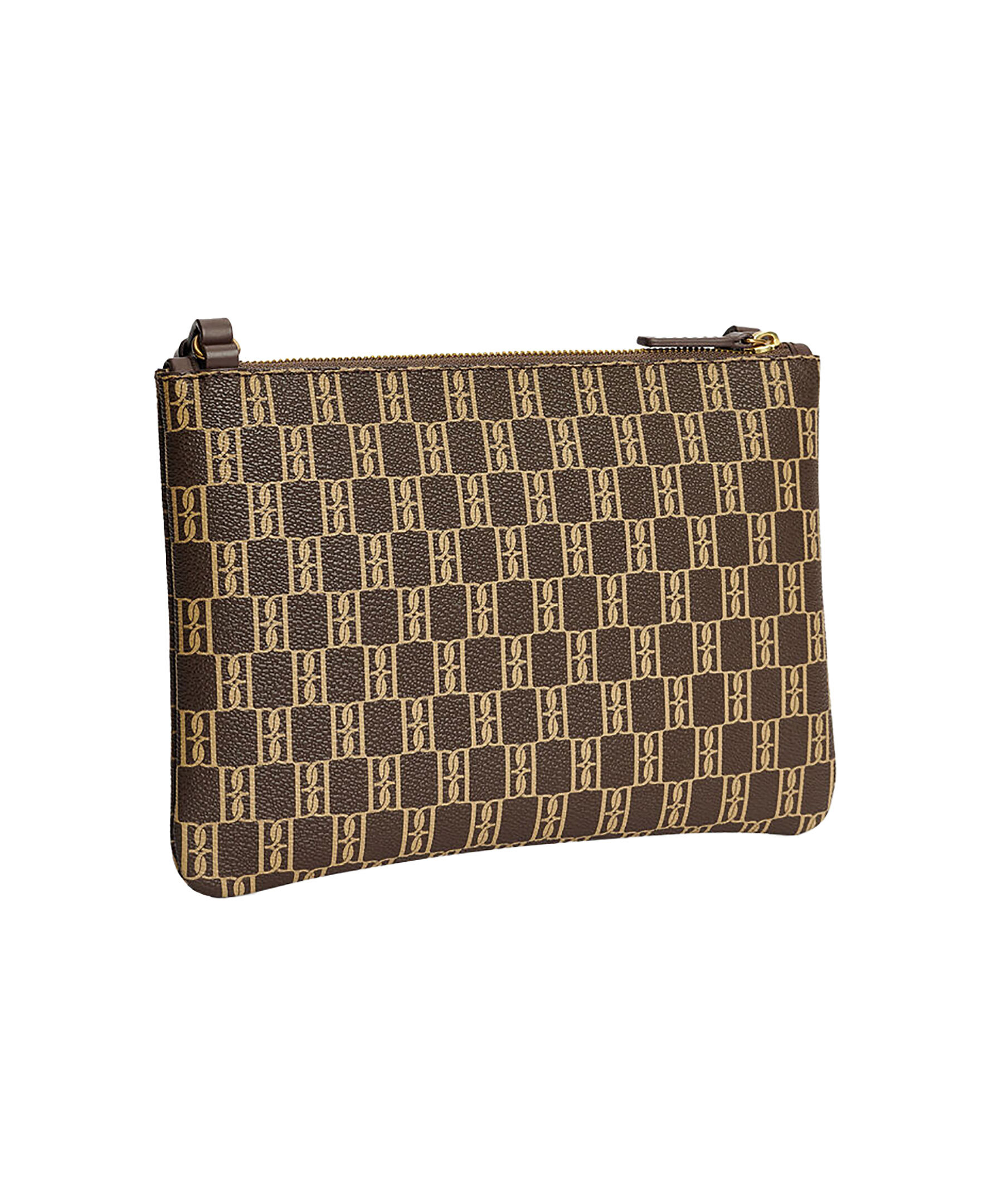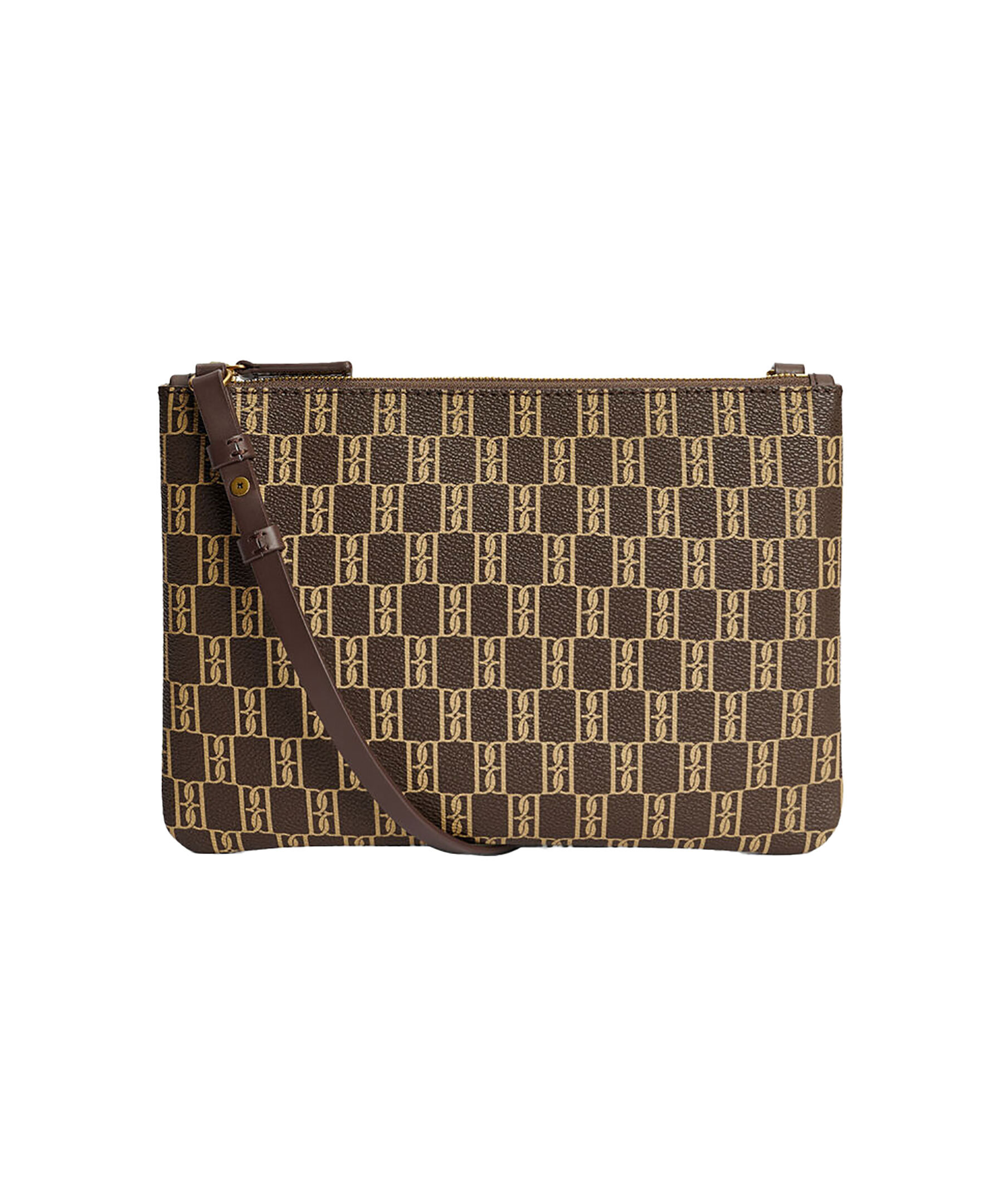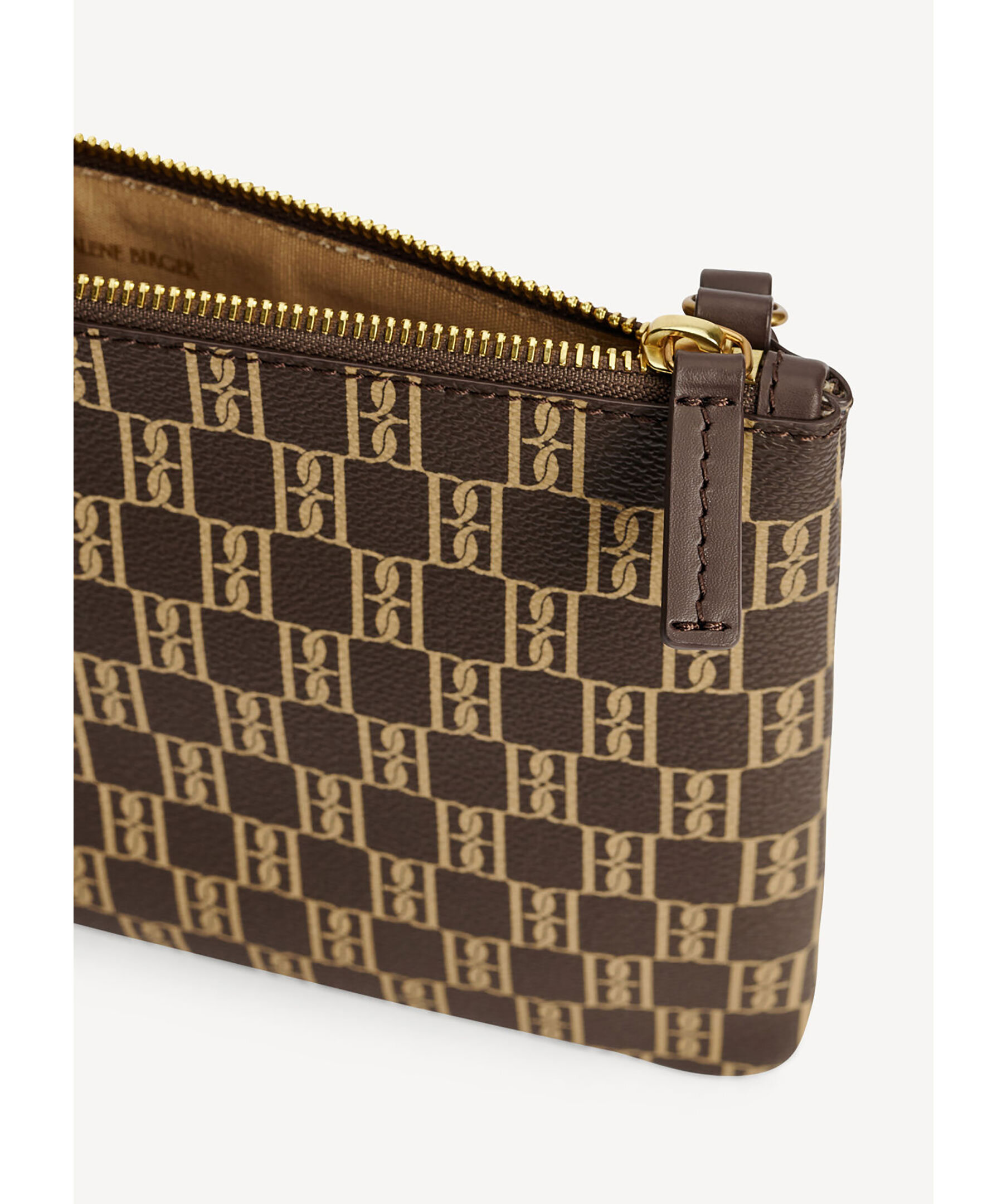 Brun väska med monogramtryck från By Malene Birger. Väskan har en smal, avtagbar rem vilket gör att den funkar både som en crossbody-väska och en clutch. Stängs med dragkedja. Mått: B: 25,5cm, H: 18cm.