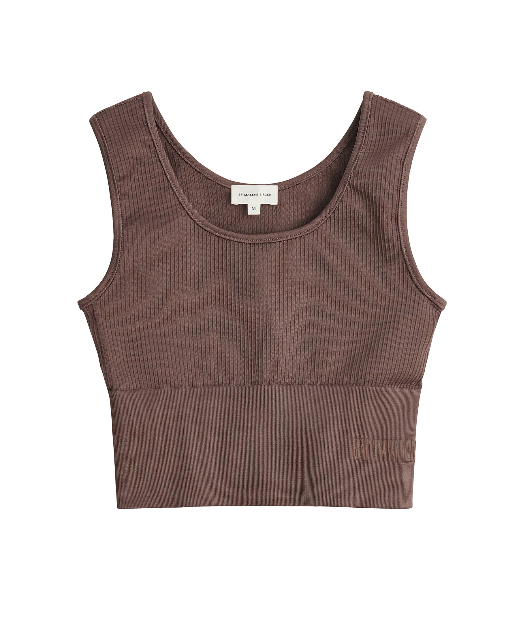 Brun ribbad cropad sporttop från By Marlene Birger. Breda axelband och rundad halsringning. Bred mudd vid plaggslut med stickad logotyp på ryggen. Produkten är liten i storlek så vi rekommenderar att gå upp en från din vanliga. Modellen är 175 cm lång och har på sig storlek M.