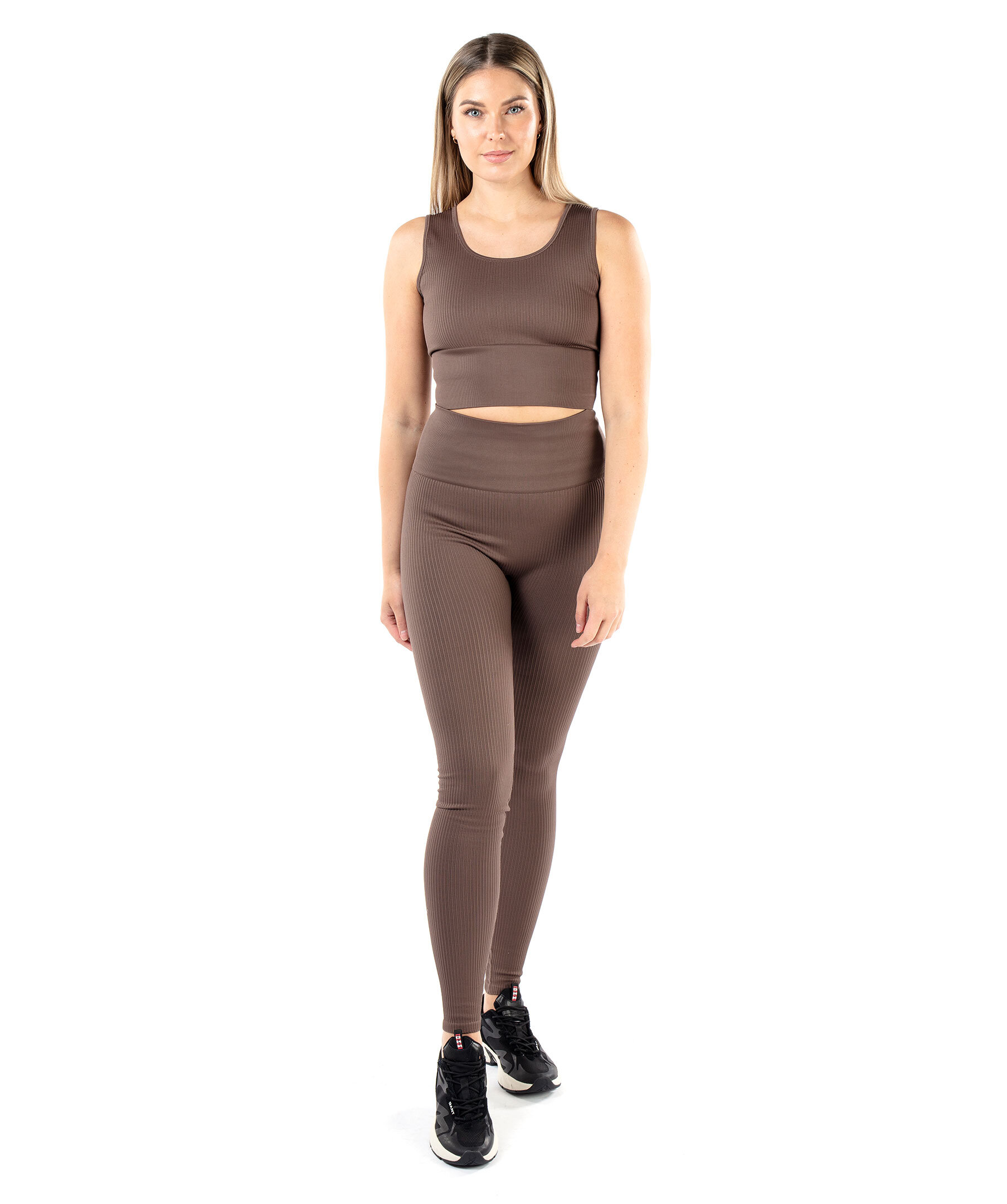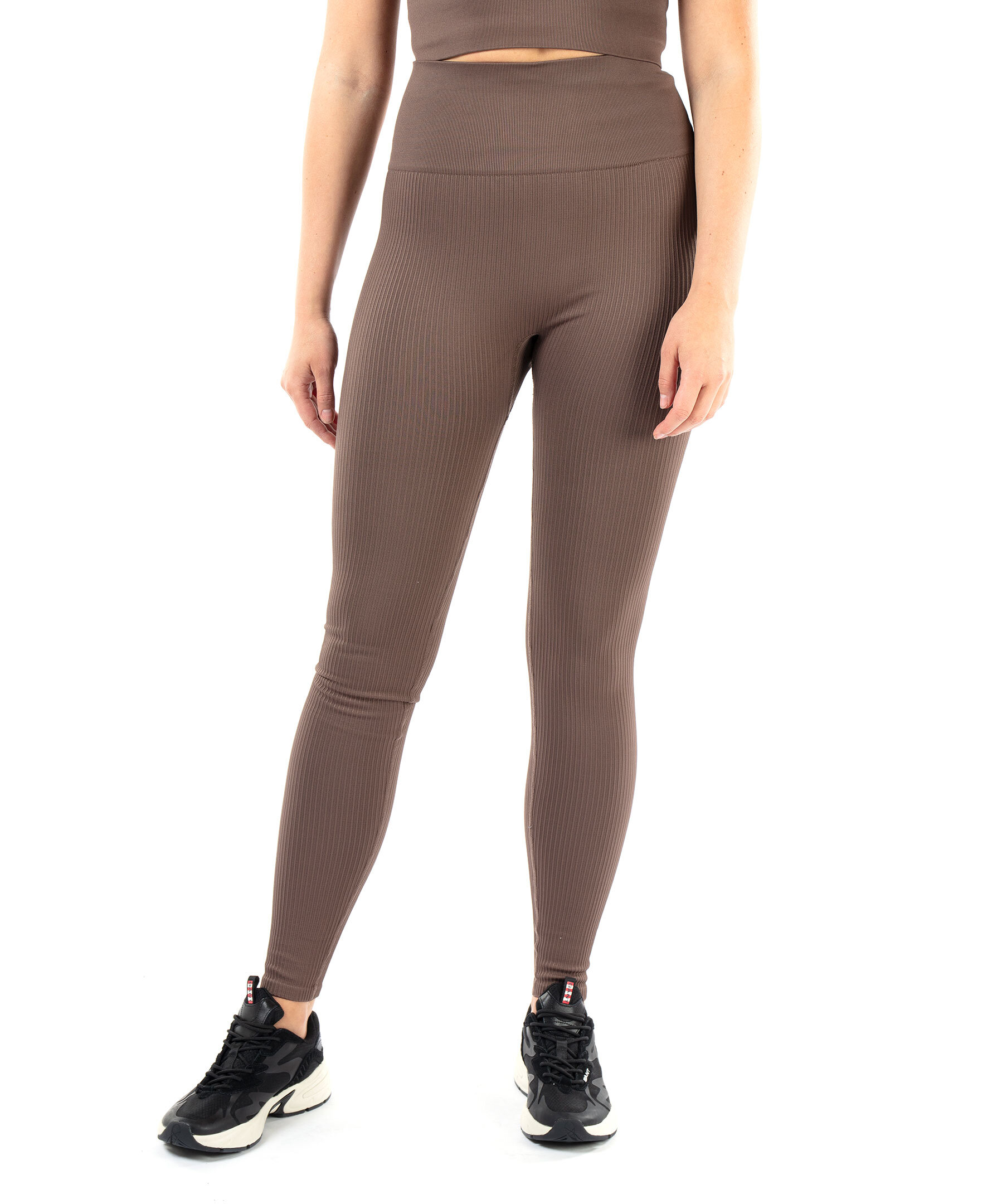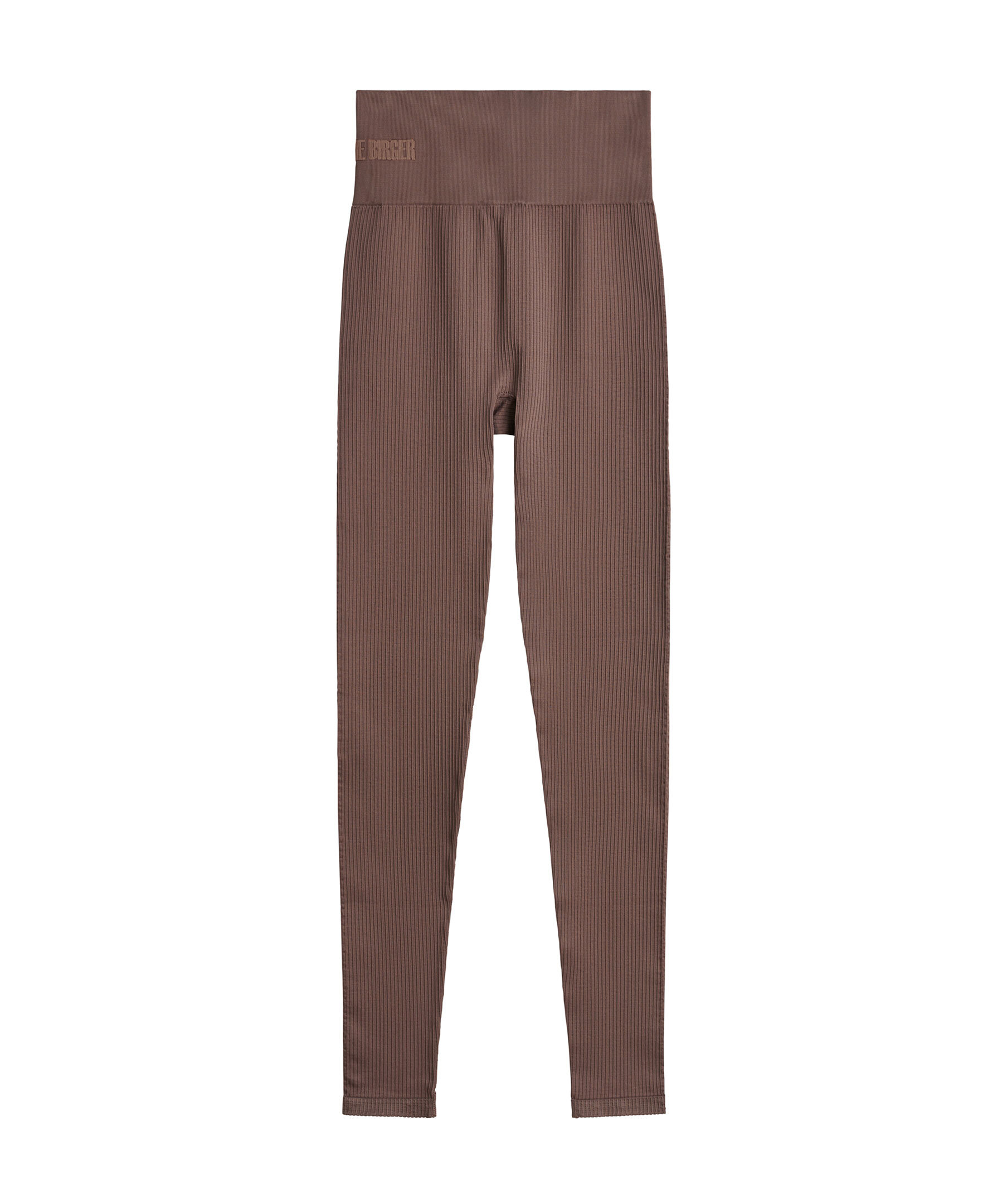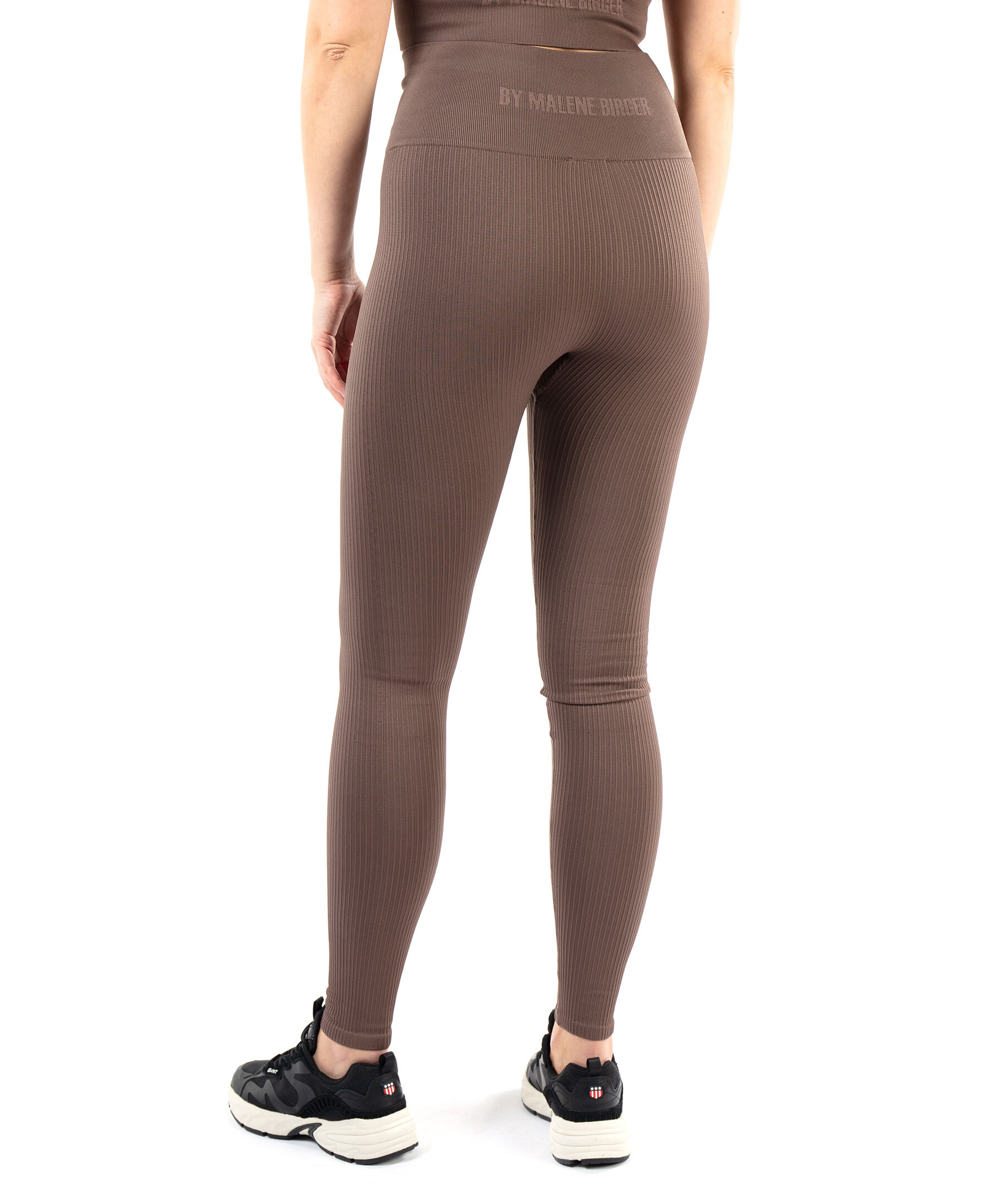 Bruna ribbade träningstights från By Malene Birger. Högmidjade med bred resår i midjan. Stickad logotyp i svanken. Produkten är liten i storlek så vi rekommenderar att gå upp en från din vanliga. Modellen är 175 cm lång och har på sig storlek M.