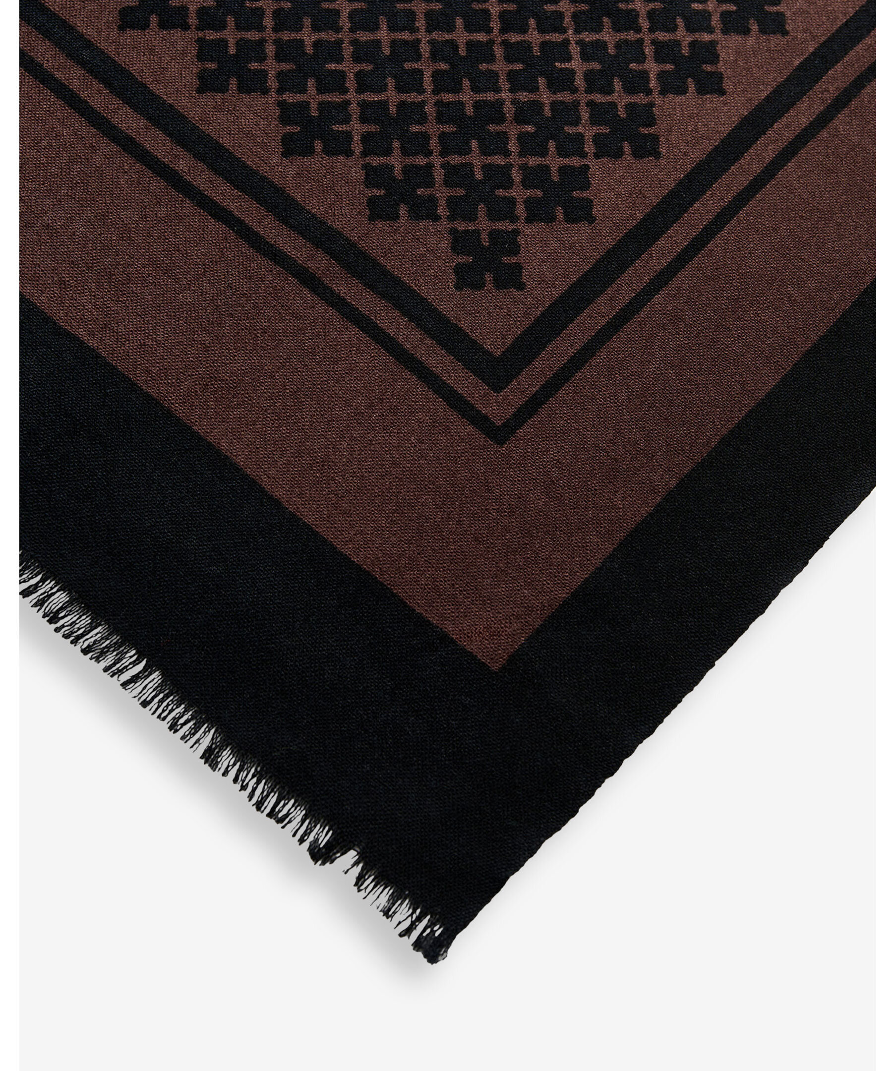 Brun scarf med svart mönster från By Malene Birger. Scarfens rektangulära siluett är utsmyckad med Malene Birgers signatur blommönster och fransar. Tillverkad i 100% ull. Mått: 100x 200 cm.