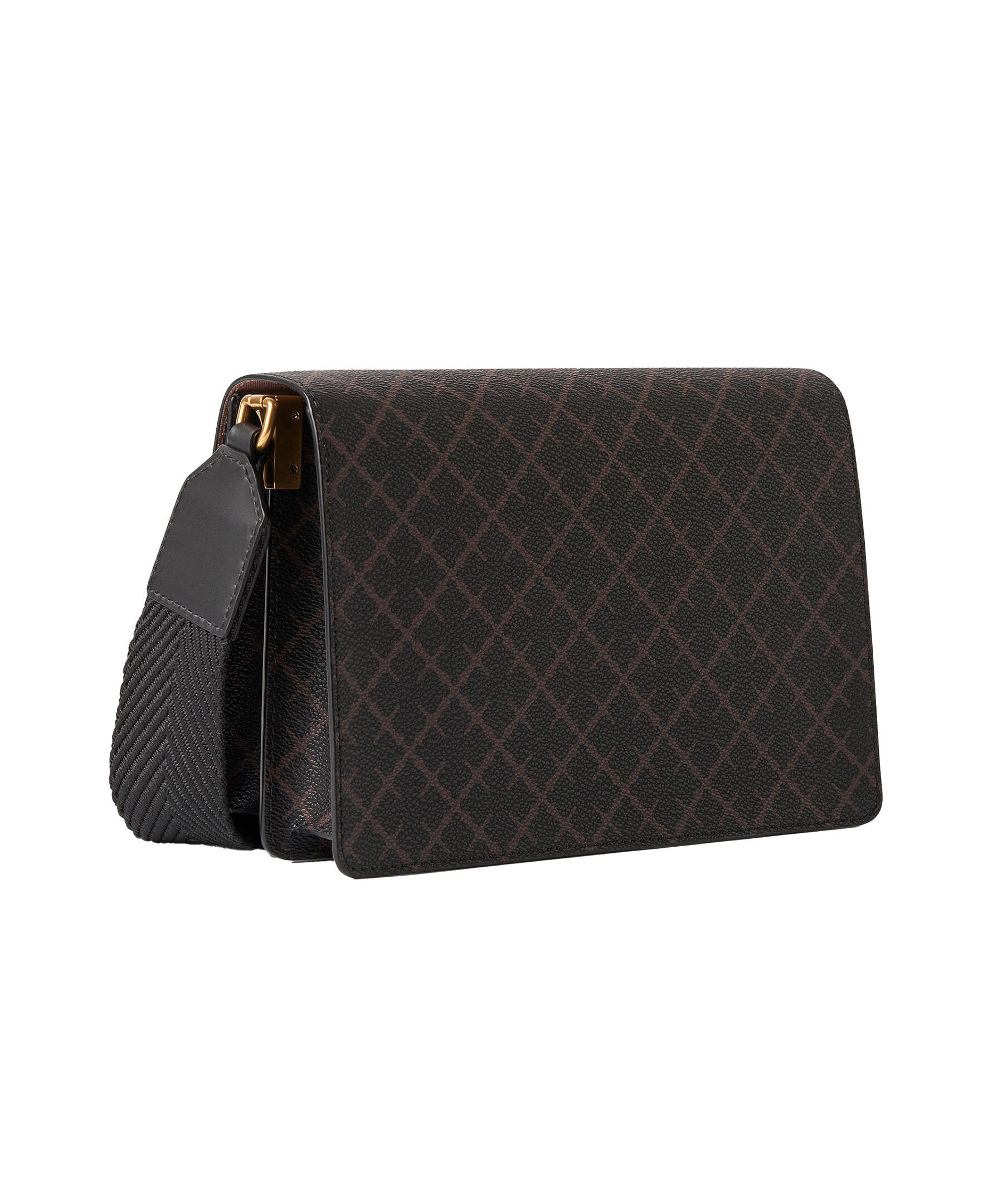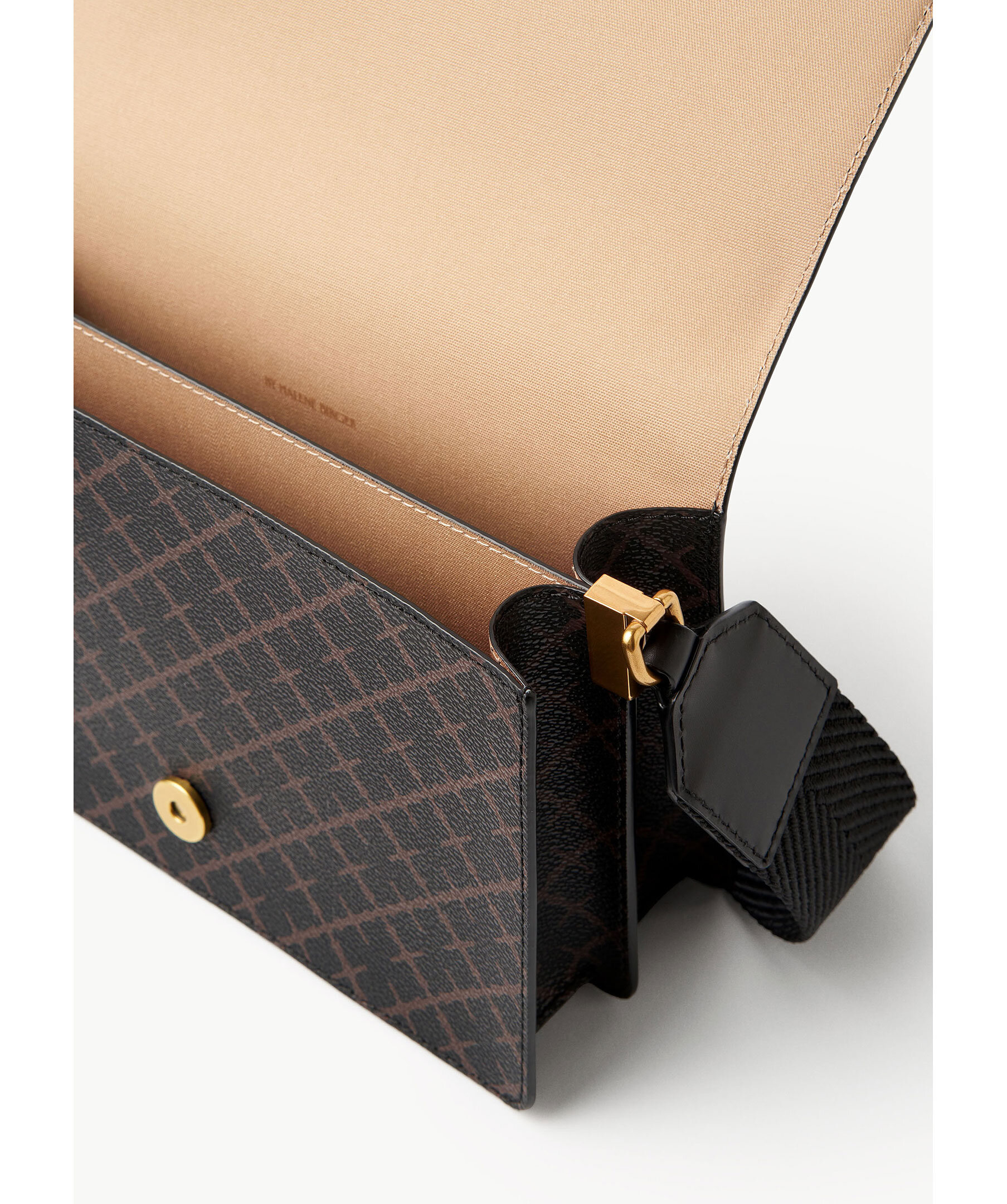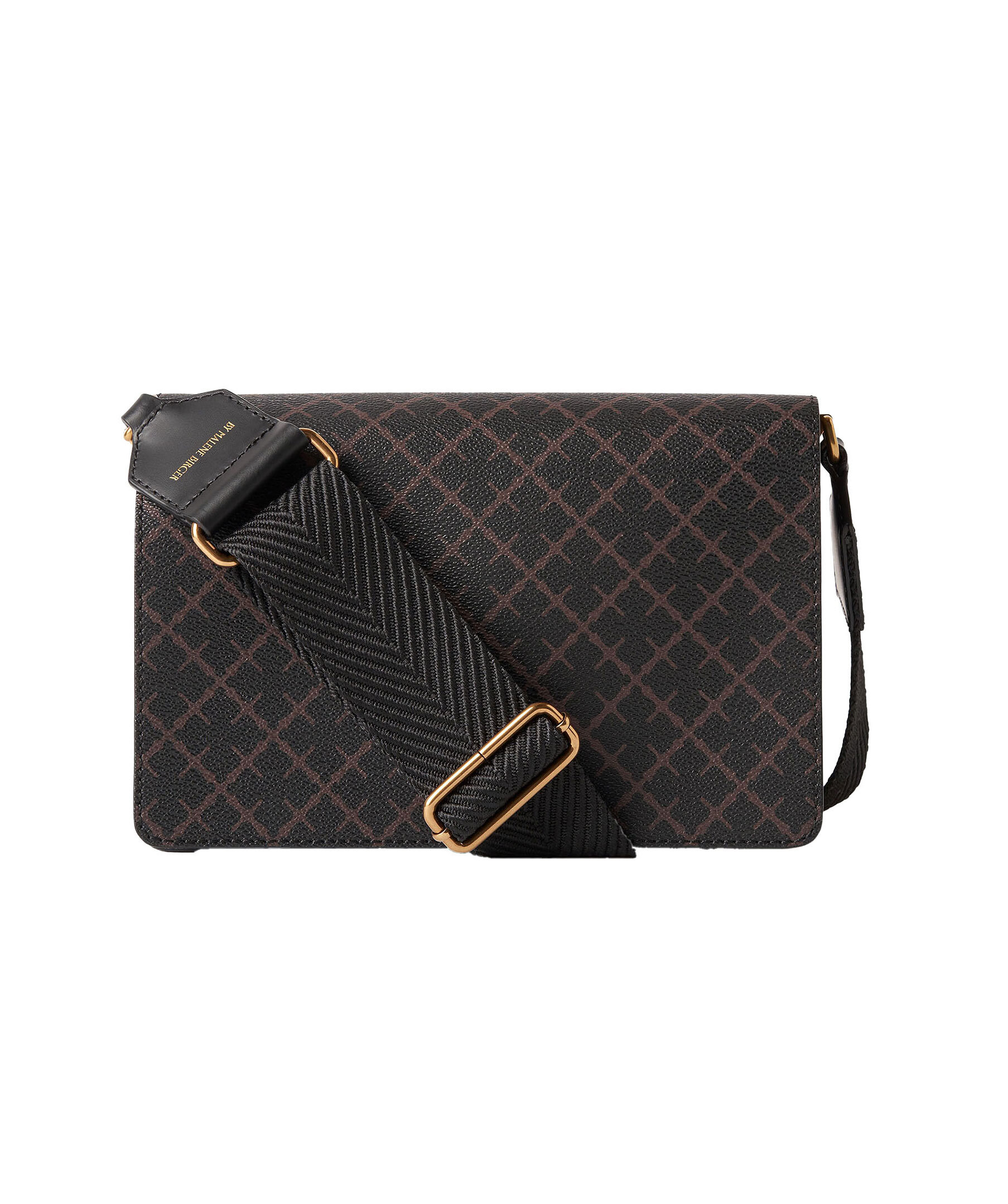 Svart och brun mönstrad väska från By Malene Birger. Locket stängs med magnetlås. Justerbar axelrem med detaljer i läder. Guldfärgade detaljer i metall. Väskan har två fack. Väskans mått: L 24cm x H 17 cm x 8.5 cm. Axelremmen är 109 cm lång.