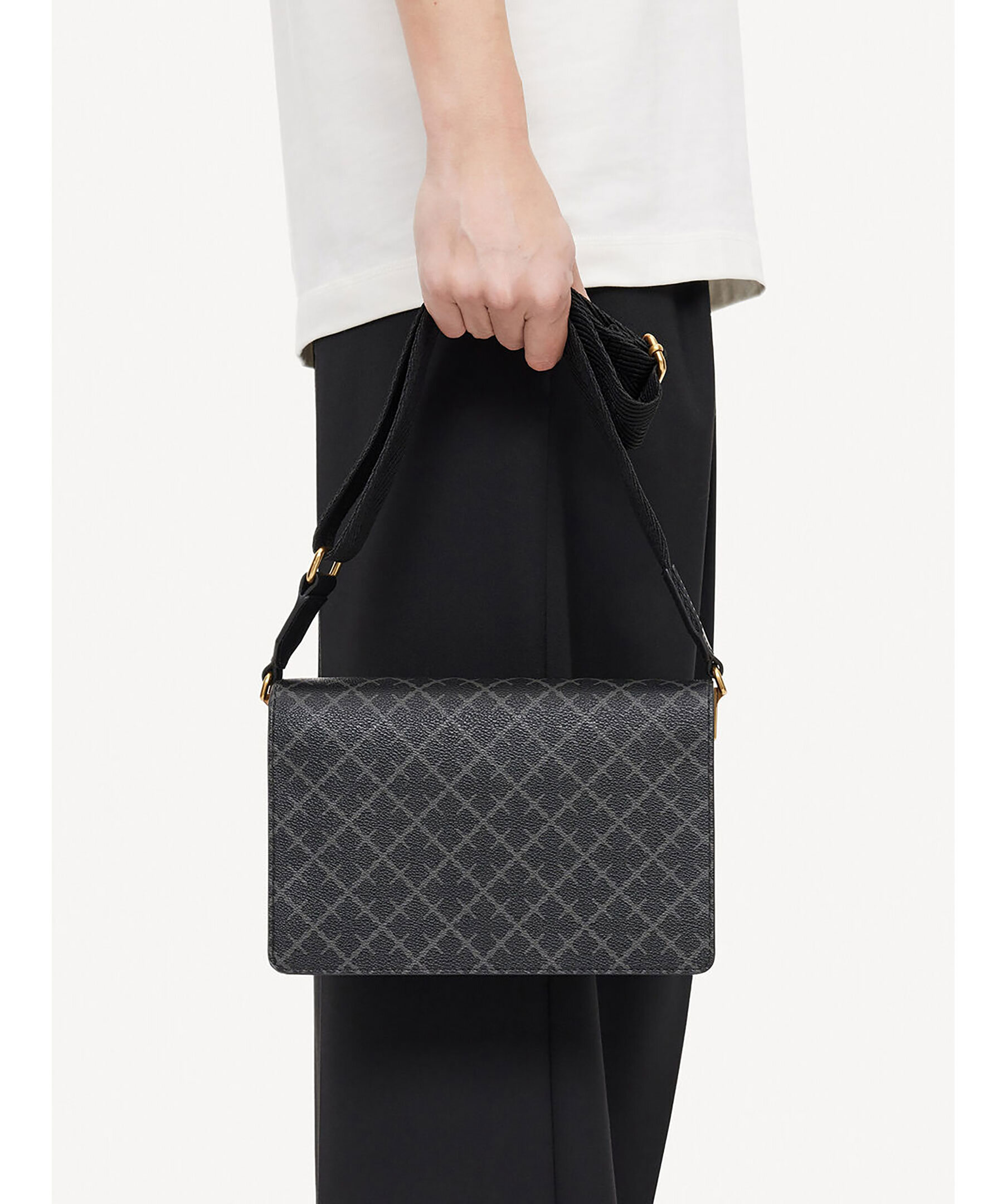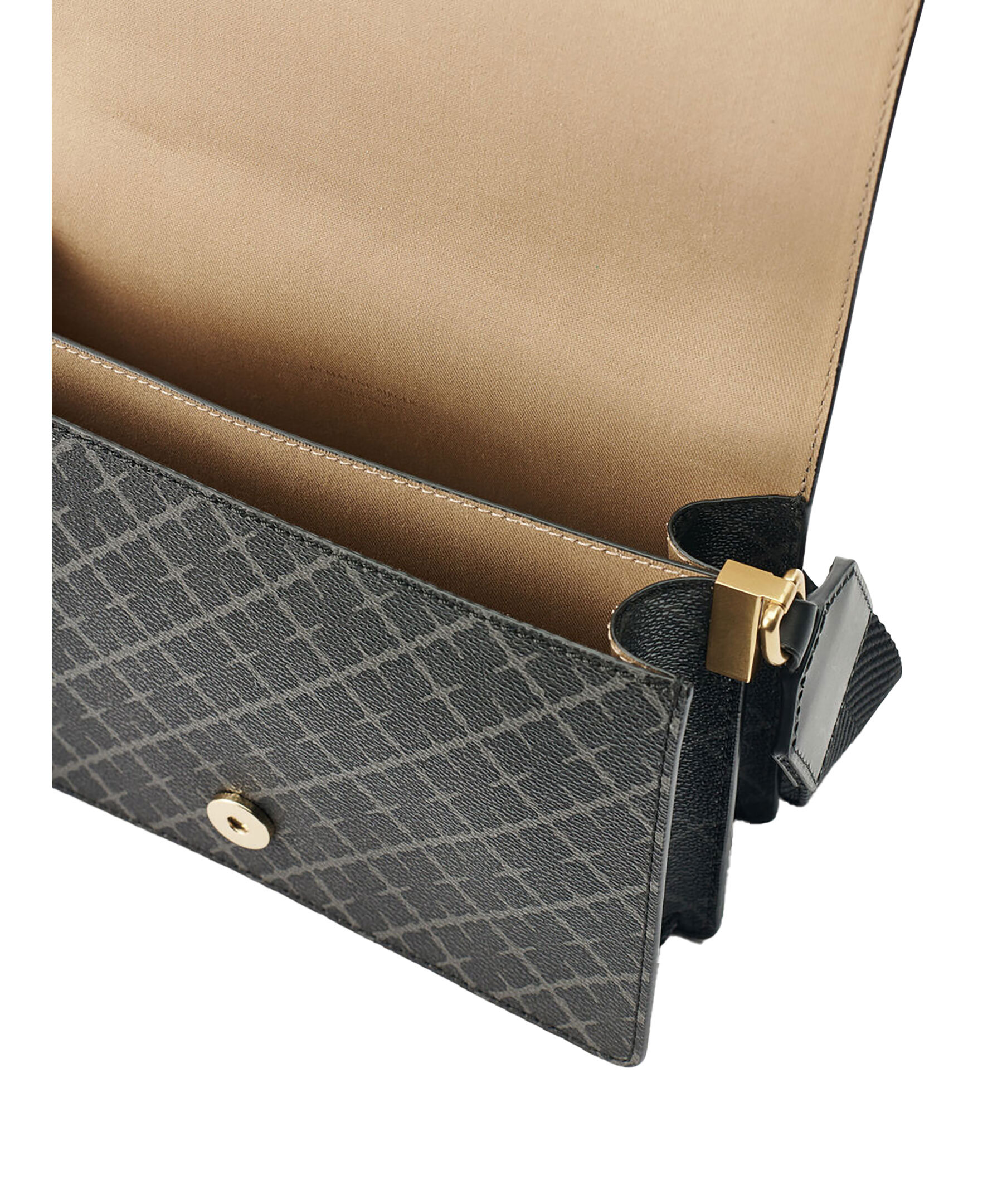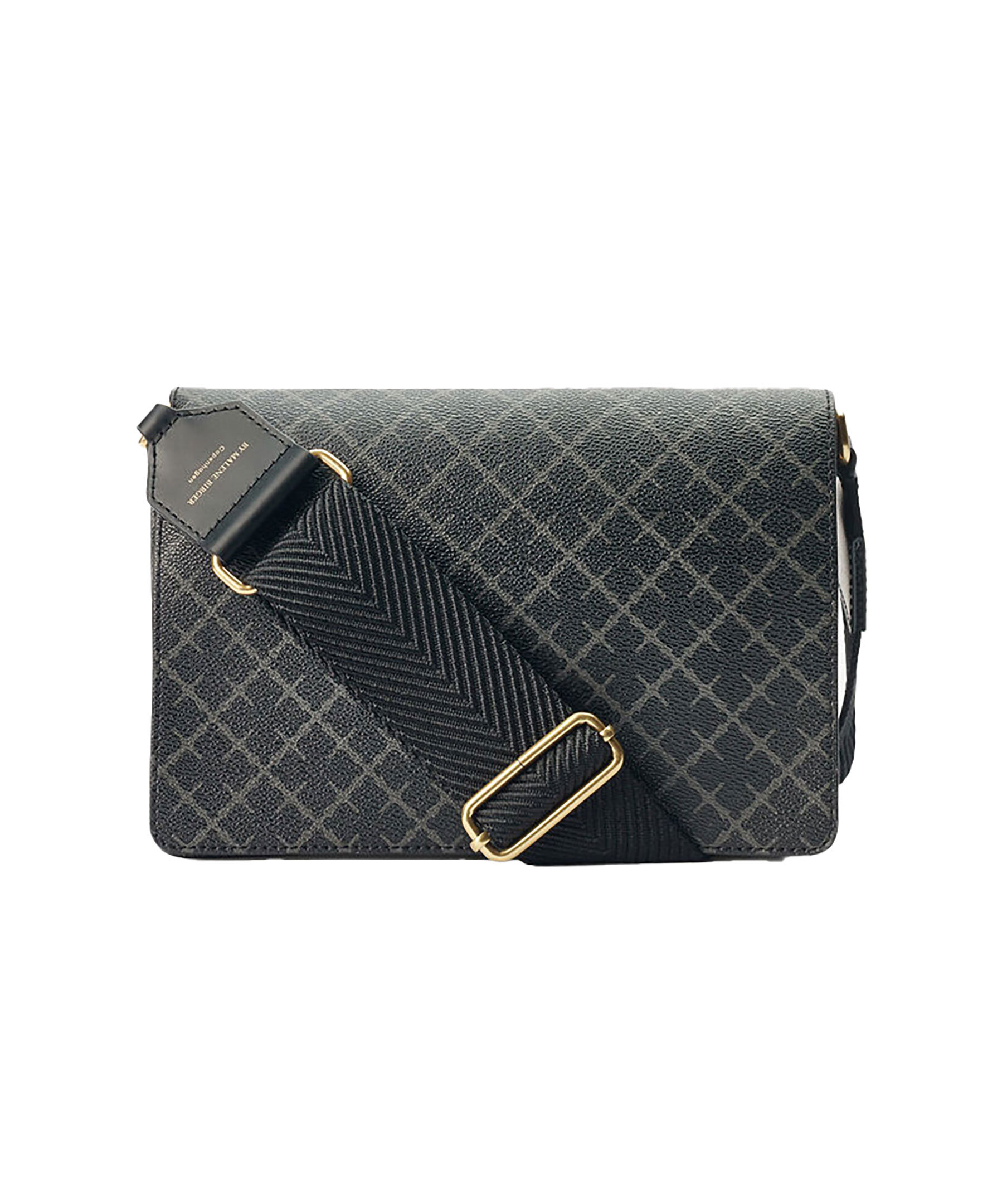 Mönstrad väska i grått och svart från by Malene Birger. Gjord av slitstarkt tyg tryckt med deras by Malene Birgers signatur blom-motiv, stämplad med logotyp på remmen och kantad med läder. Den har en justerbar rem i bomullsband för att säkerställa perfekt passform. Magnetisk flikstängning och guldfärgade detaljer.