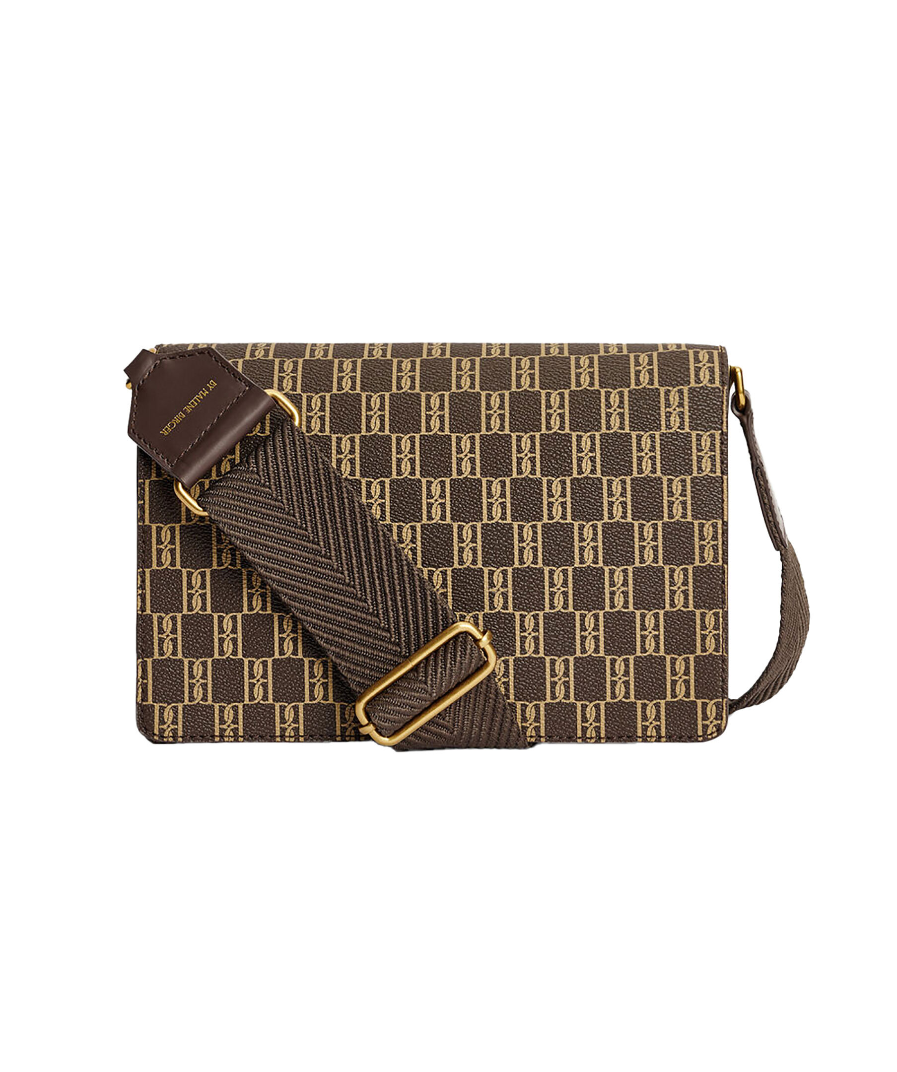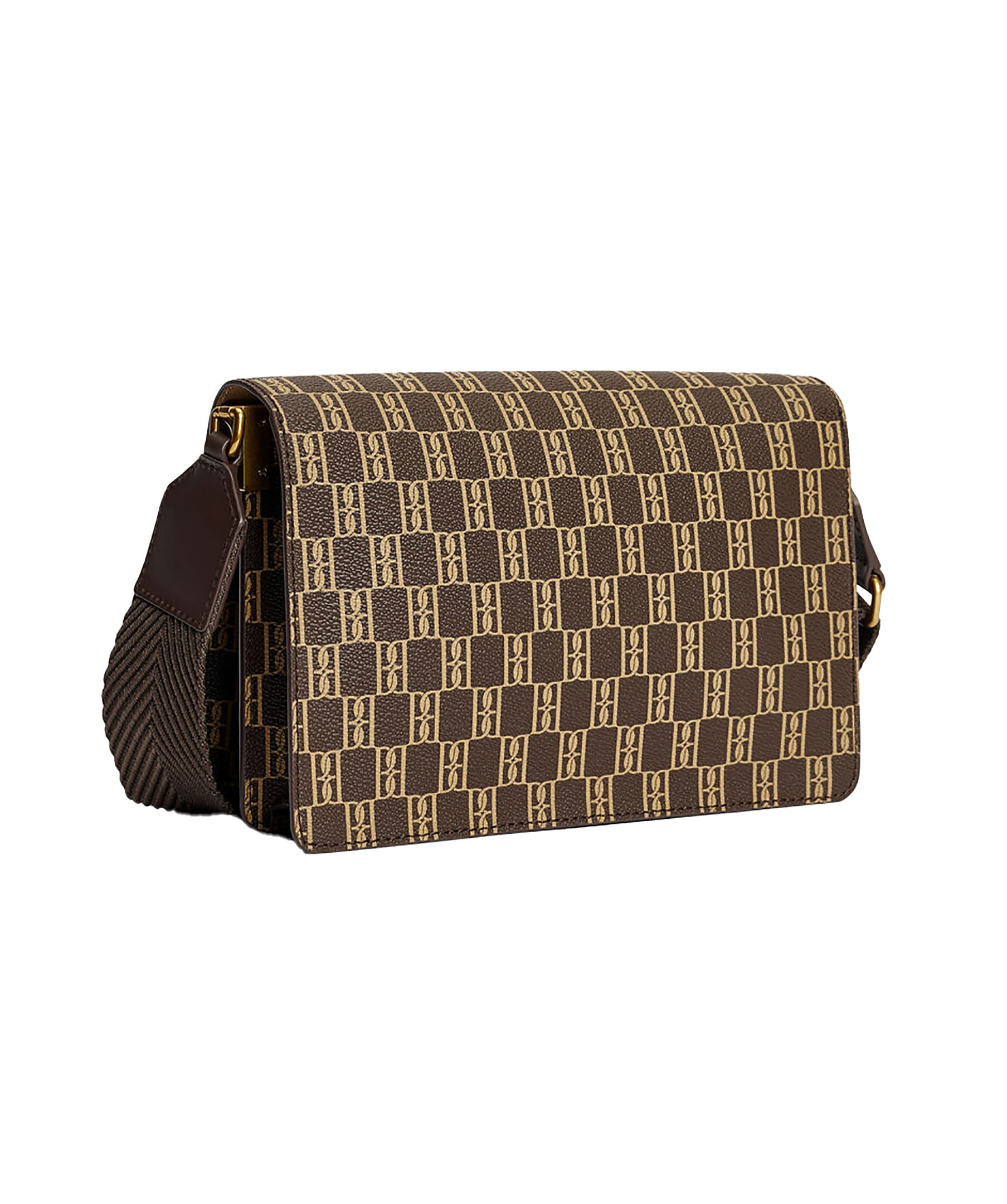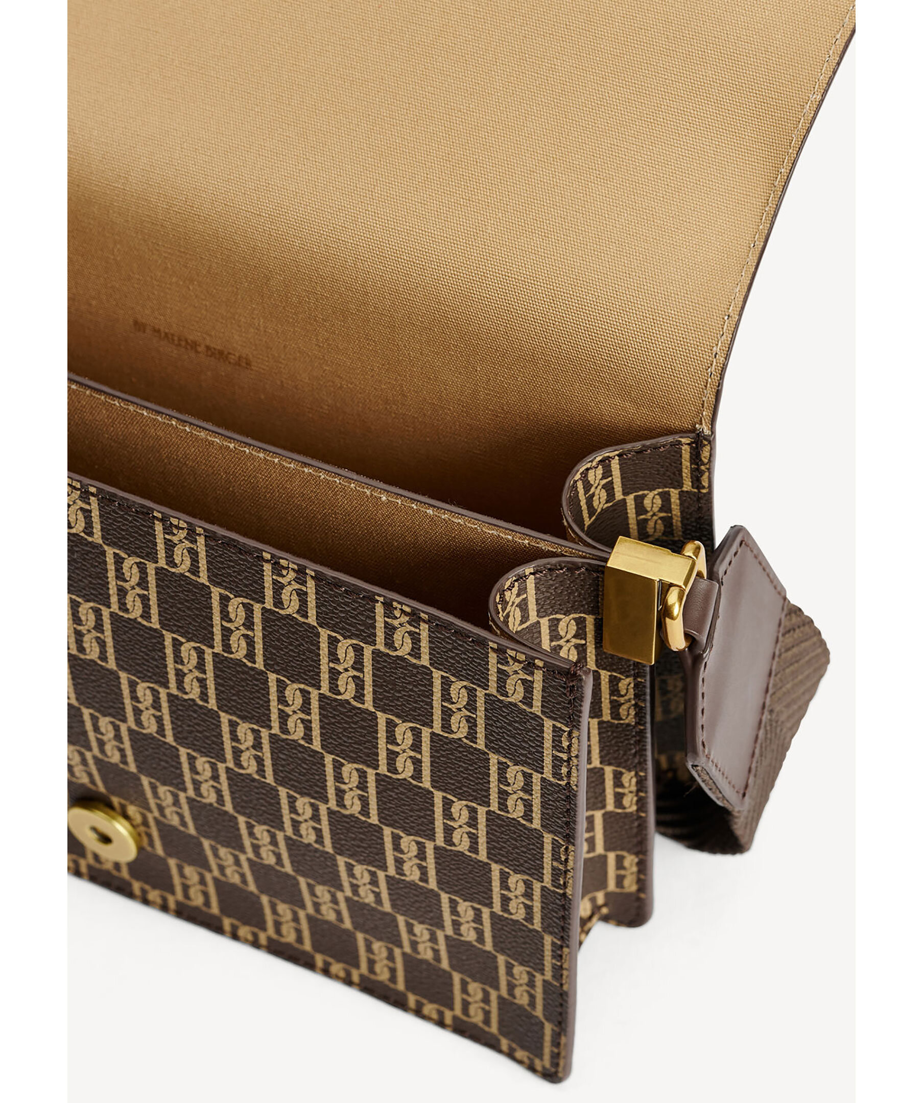Brun väska med monogramtryck från By Malene Birger. Locket stängs med magnetlås. Justerbar axelrem med detaljer i läder. Guldfärgade detaljer i metall. Väskan har två fack. Väskans mått: L 24cm x H 17 cm x 8.5 cm. Axelremmen är 109 cm lång.