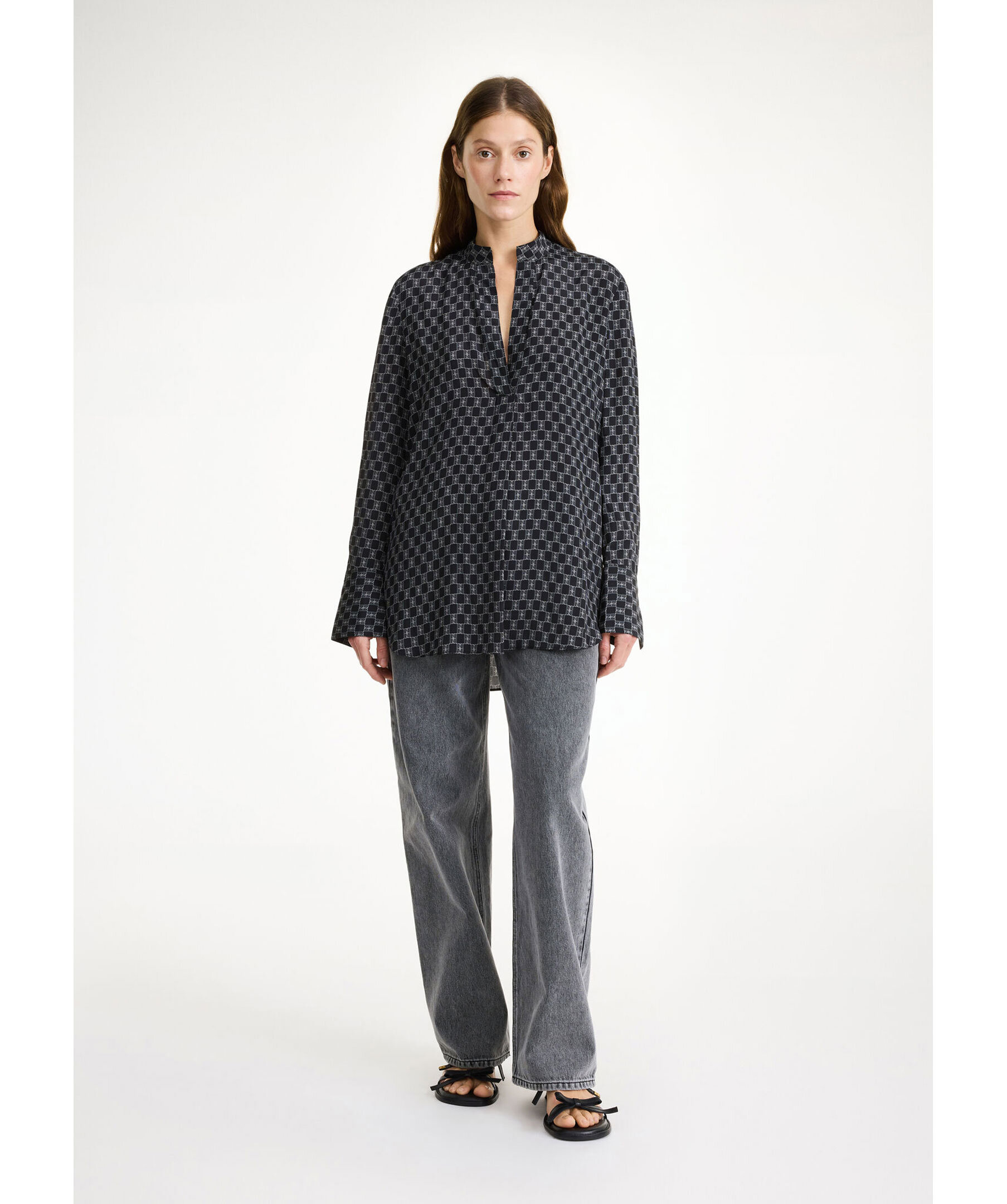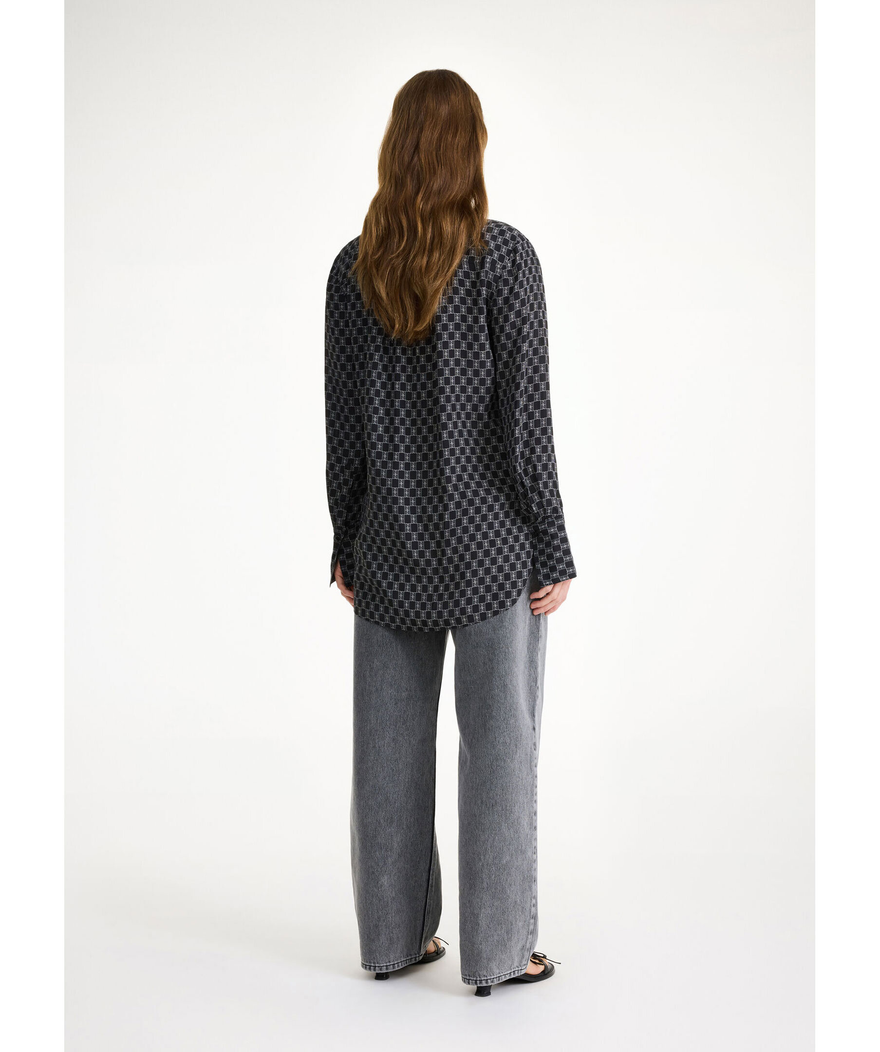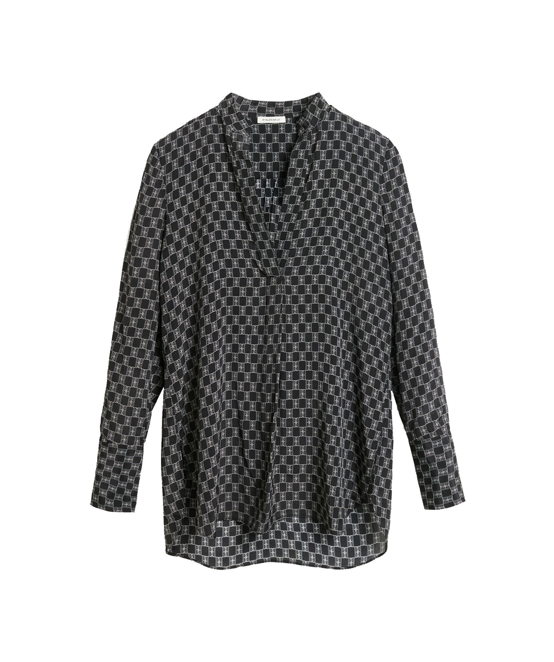 Svart och gråmönstrad blus från By Malene Birger. Dekorerad med By Malene Birgers eleganta monogramtryck. Tillverkad i en viskosblandning.