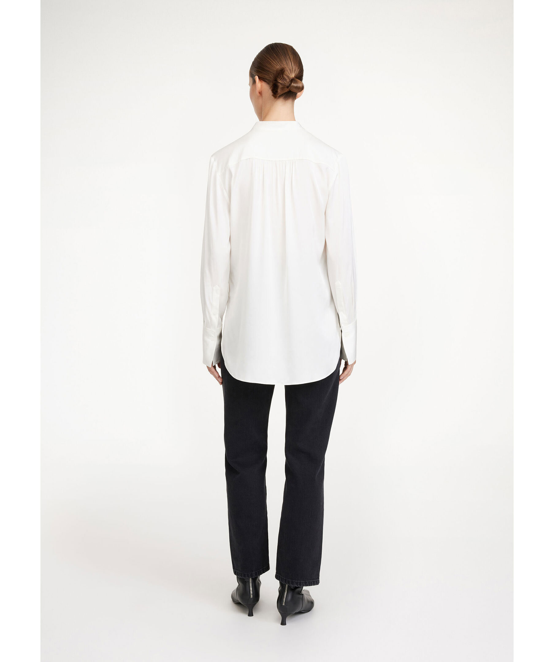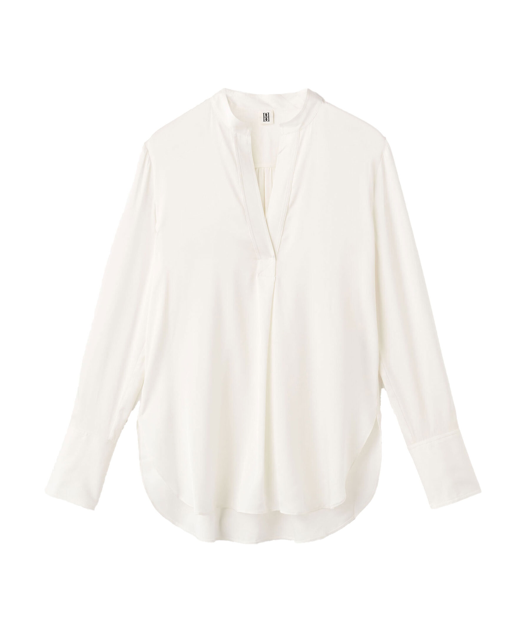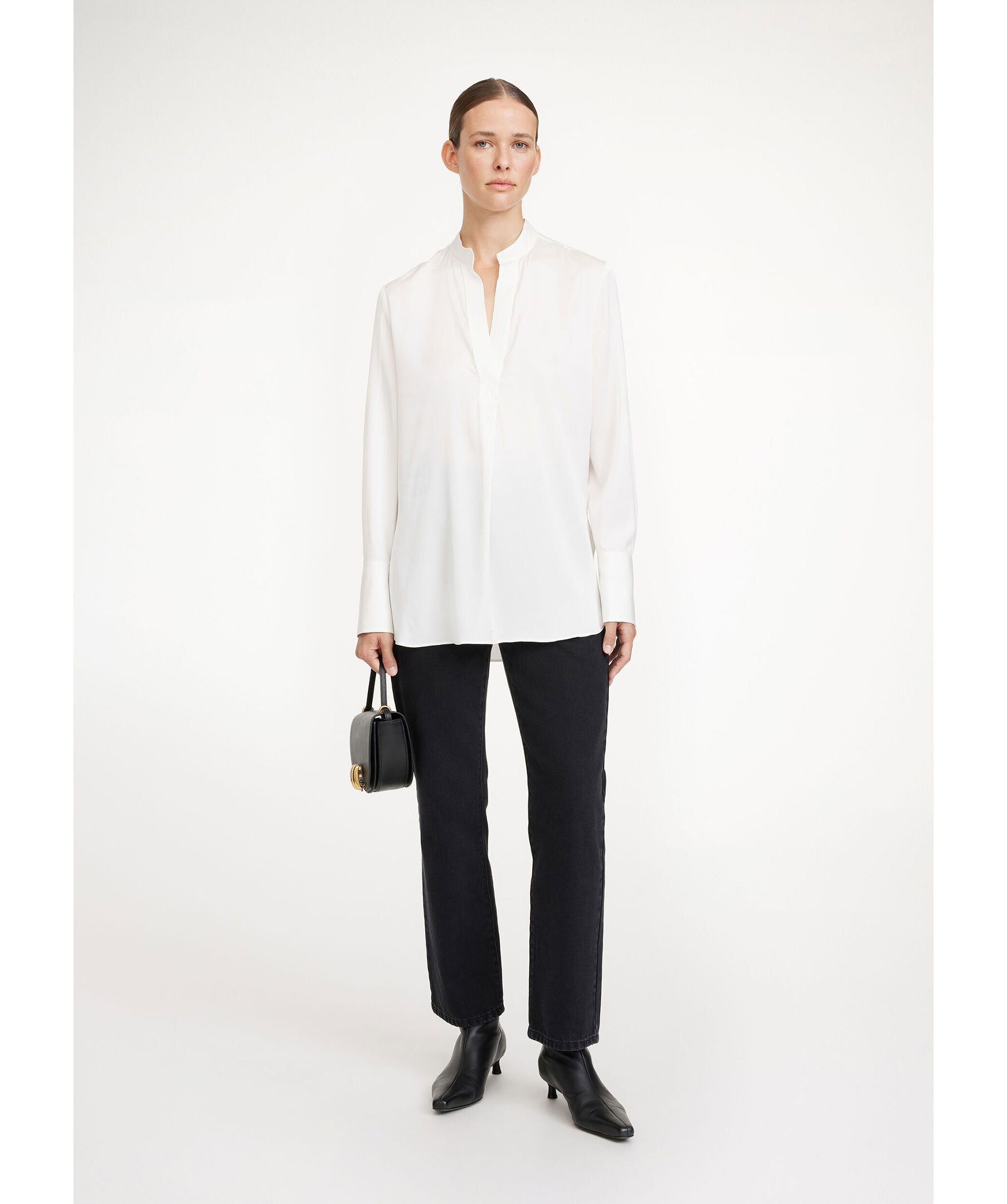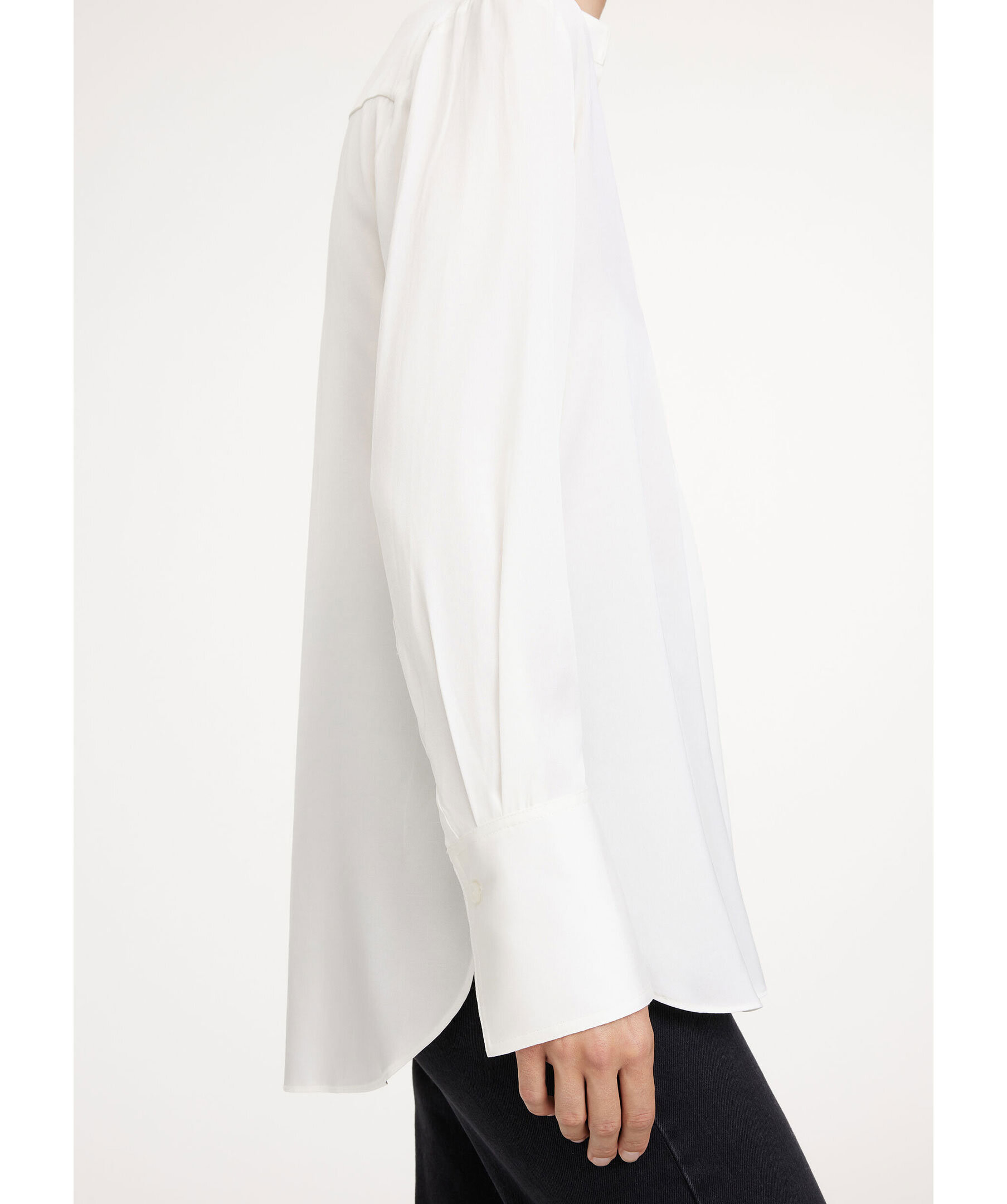 Vit blus från By Malene Birger. Gjord i en mjuk silkeblandning som passar för alla tillfällen. Den tidlösa designen har en normal passform och kännetecknas av en öppen halsringning med ståkrage, förlängda manschetter och en rundad fåll med markerade sidoslitsar. Bär den med allt från kostymer till jeans för en elegant look. Modellen är 178cm lång och har på sig strl 36.
