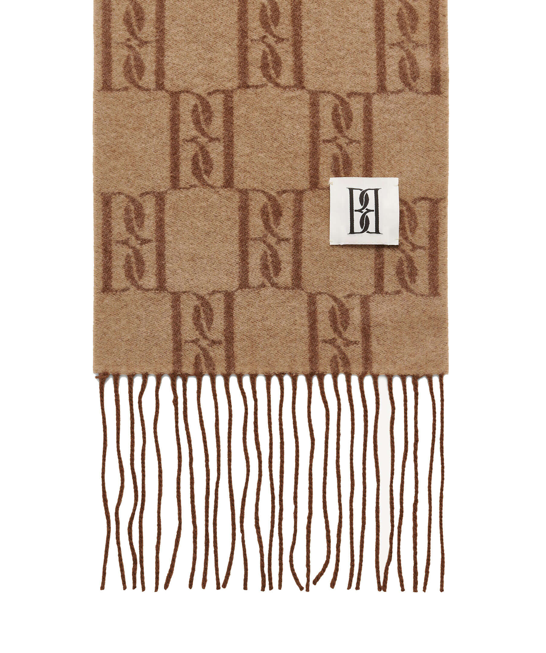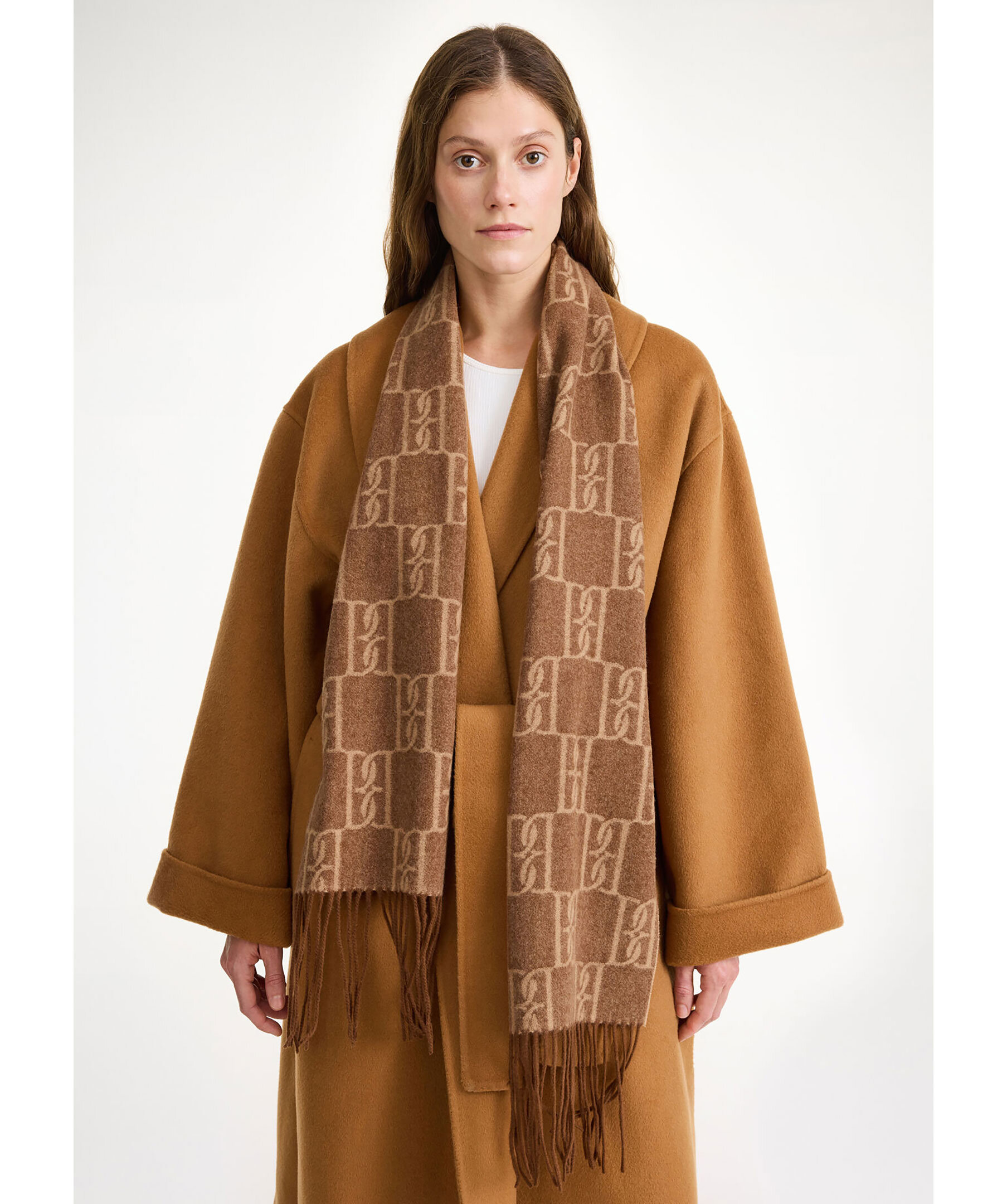 Beige halsduk från By Malene Birger. Halsduken har monogramtryck och fransar i båda ändar. Tillverkad av en ull och kashmir blandning.