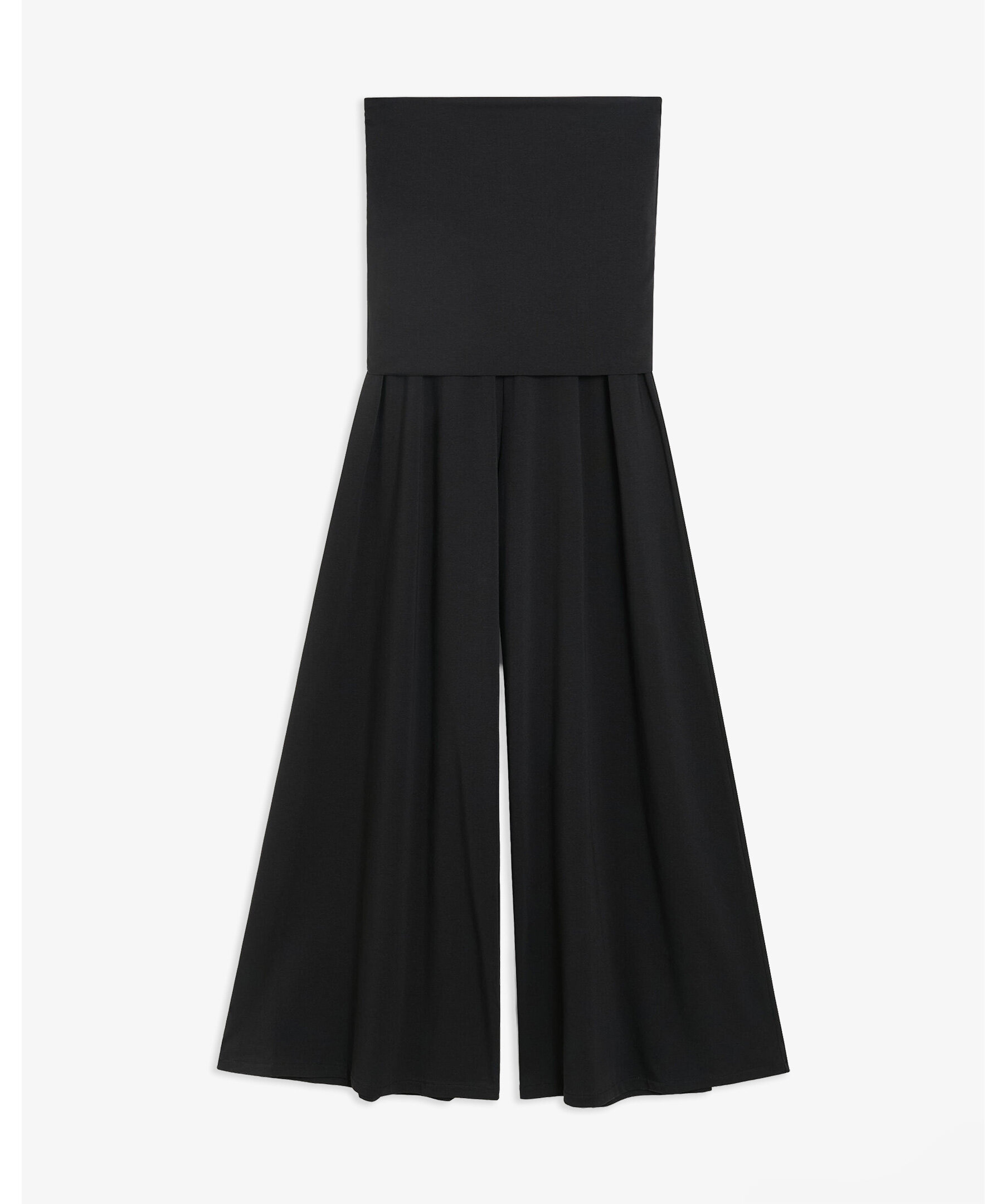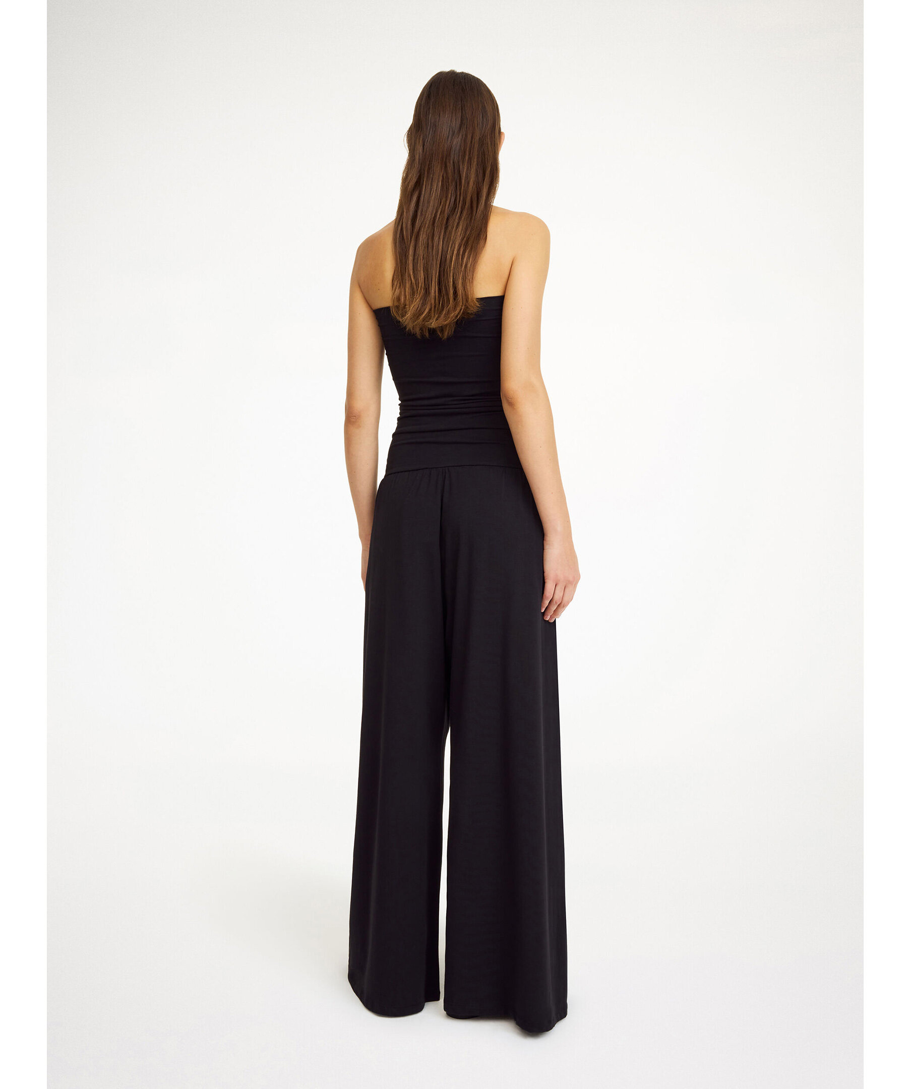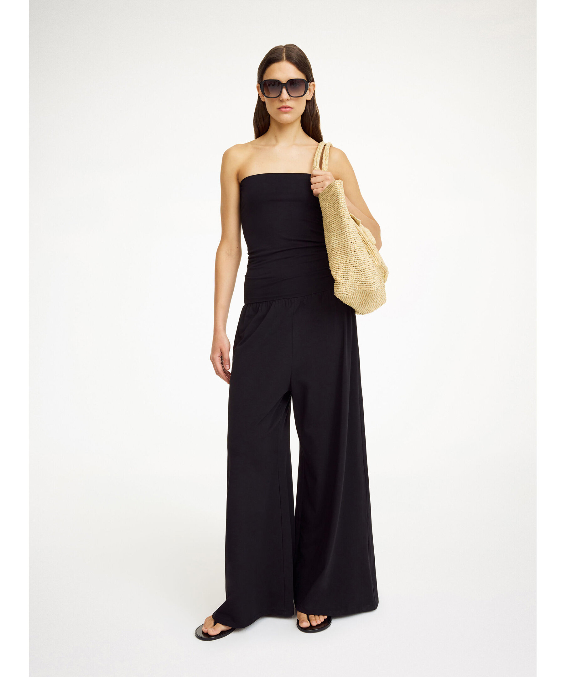 Svart Marciel Jumpsuit från By Malene Birger. Jumpsuiten kombinerar en tajt, figurnära överdel med voluminösa, utsvängda ben för ett elegant och balanserat uttryck, och är i ett mjukt stretchigt material som ger både komfort och rörelsefrihet. Den är ärmlös med rak halsringning, vilket gör att den fungerar lika bra till vardags som till festliga tillfällen – bär den gärna med en stickad tröja eller kavaj för flera säsonger.