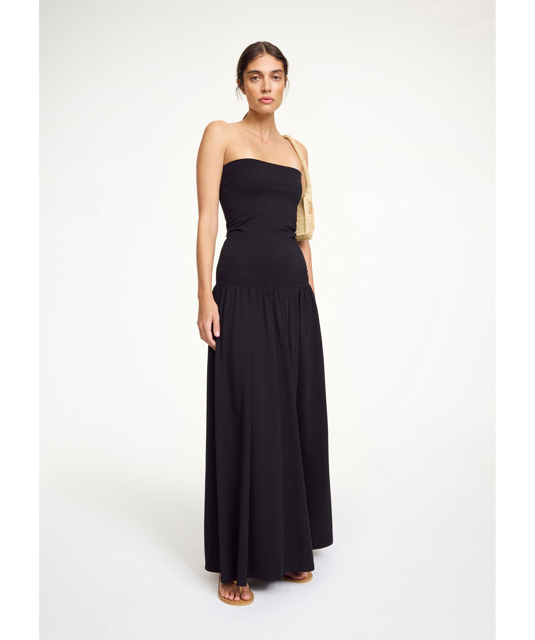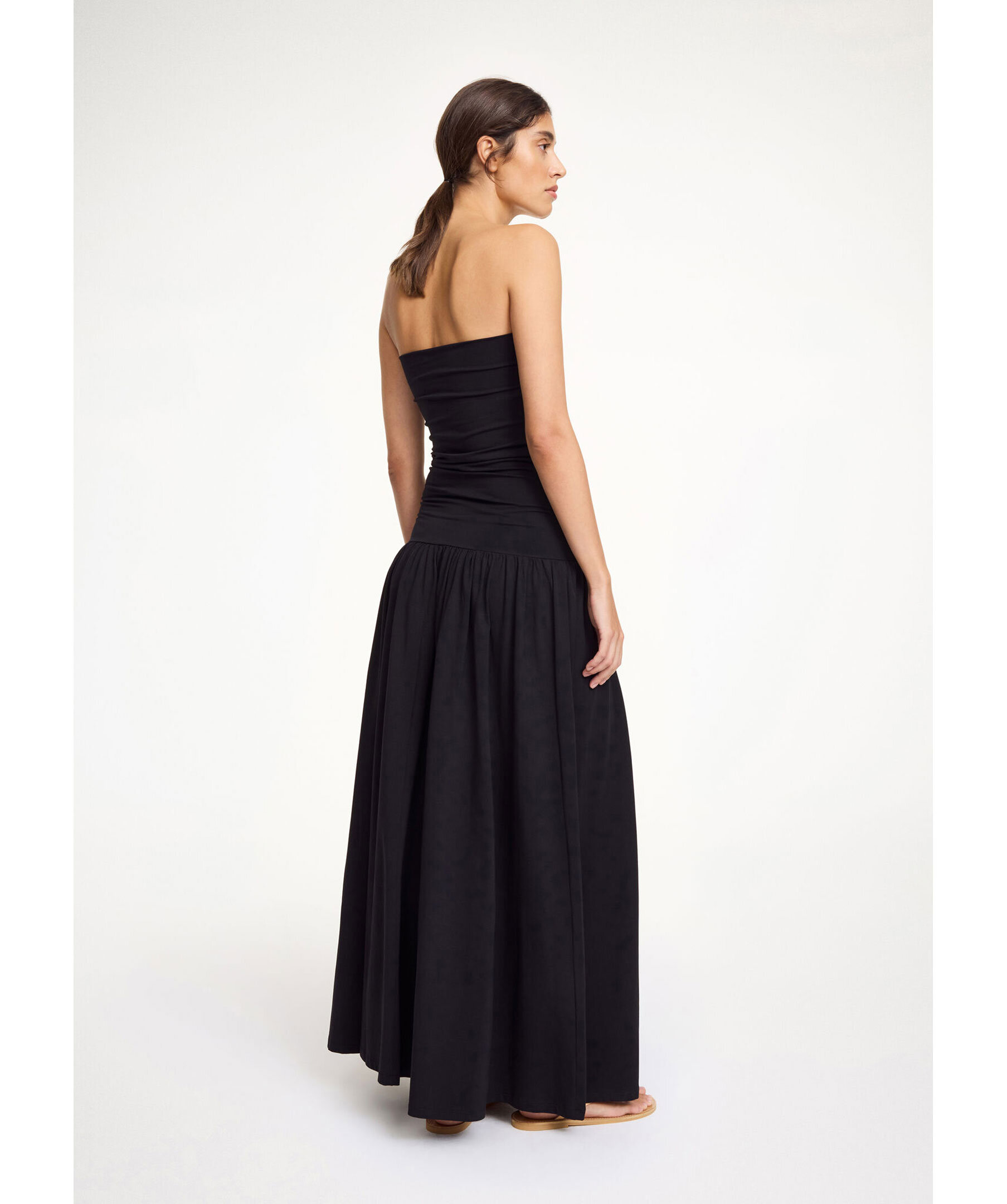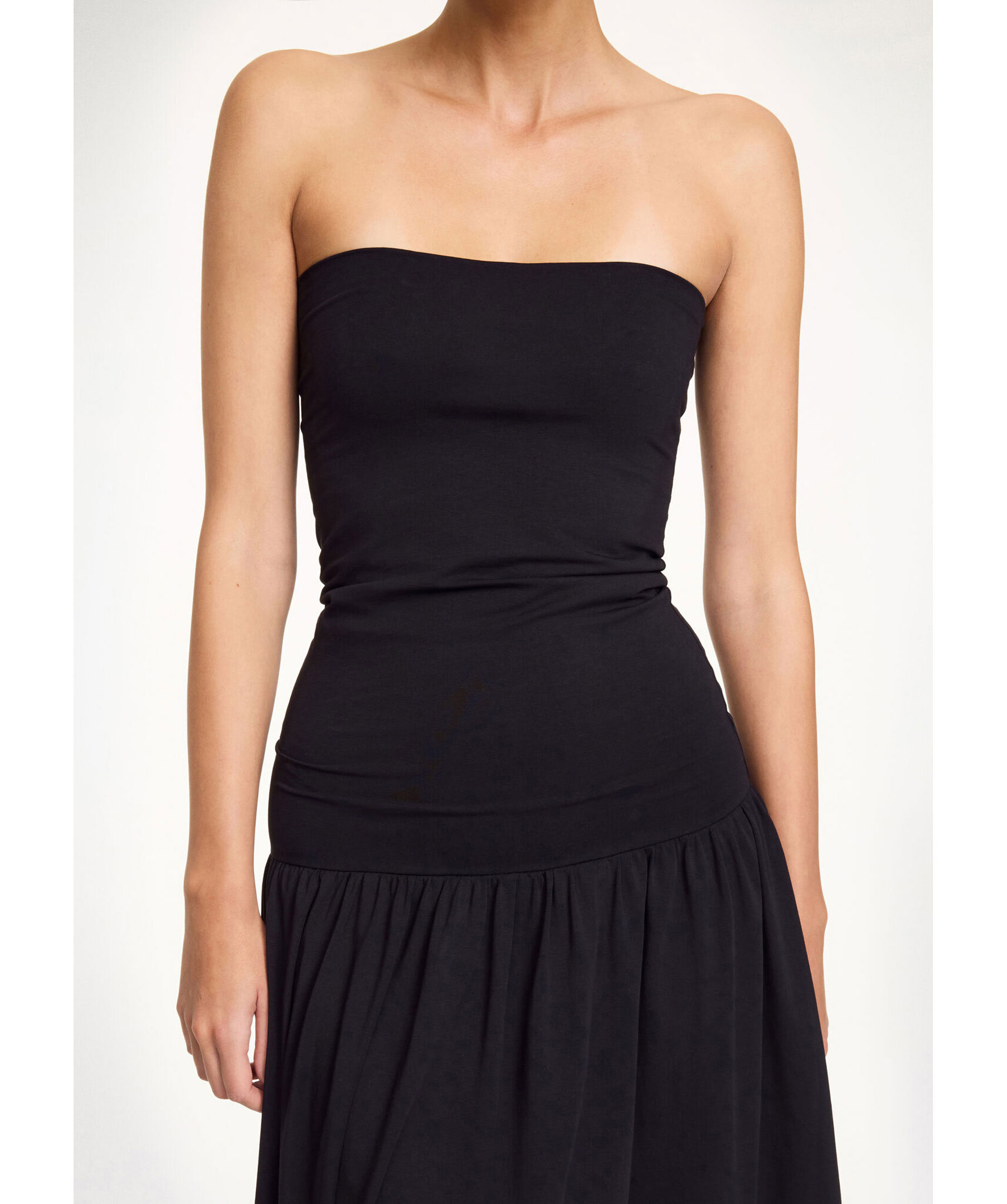 Svart klänning från By Malene Birger. Denna maxiklänning har en svart tajtare elastisk överdel, följt av en lösare lite draperad underdel. Tillverkad av en bomullsblandning.