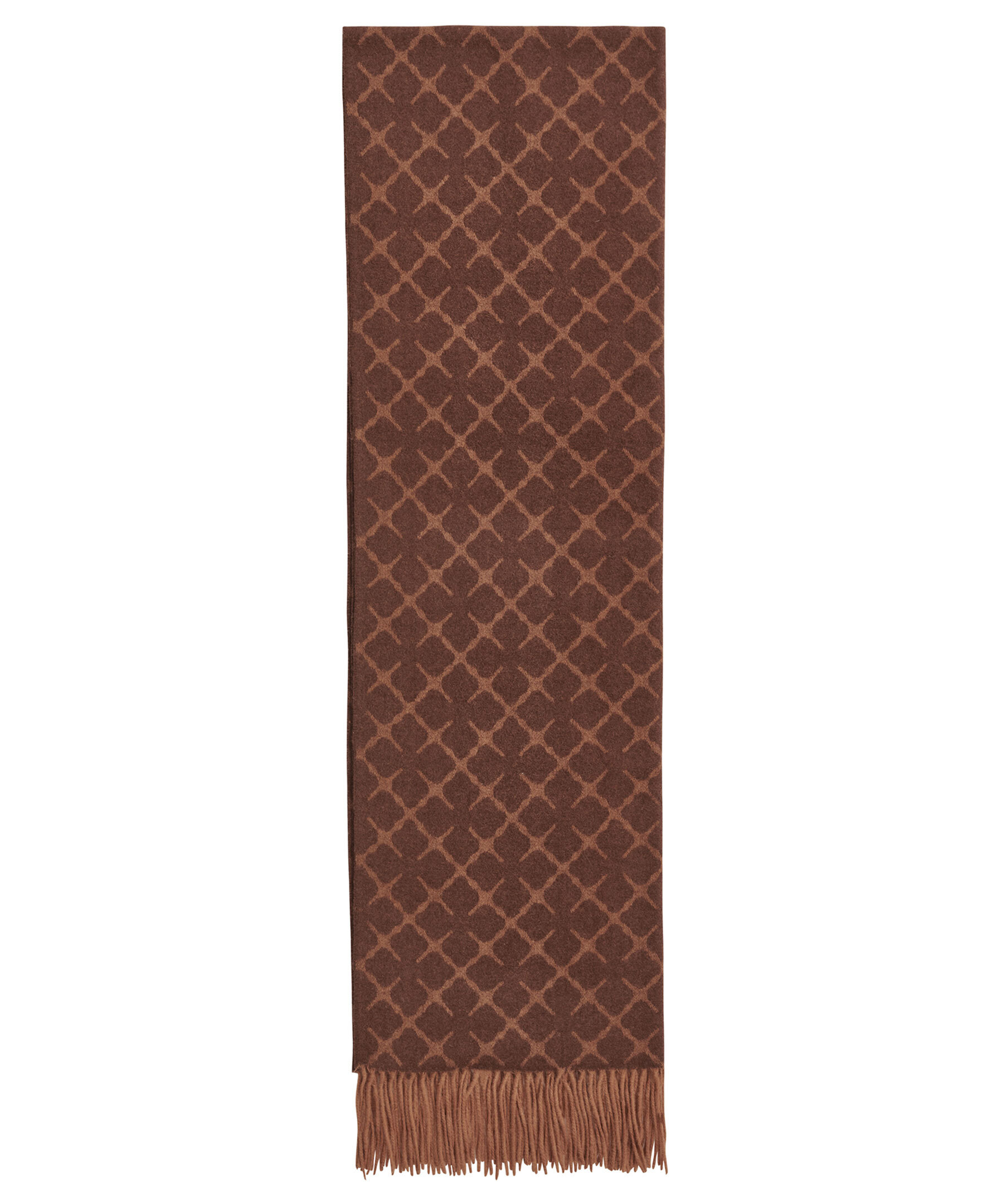 Brun, tjock halsduk i ull- och kashmirblandning från by Malene Birger. Måtten är 60 x 200 cm. Fransar i kortändorna och fint mönster på båda sidor.
