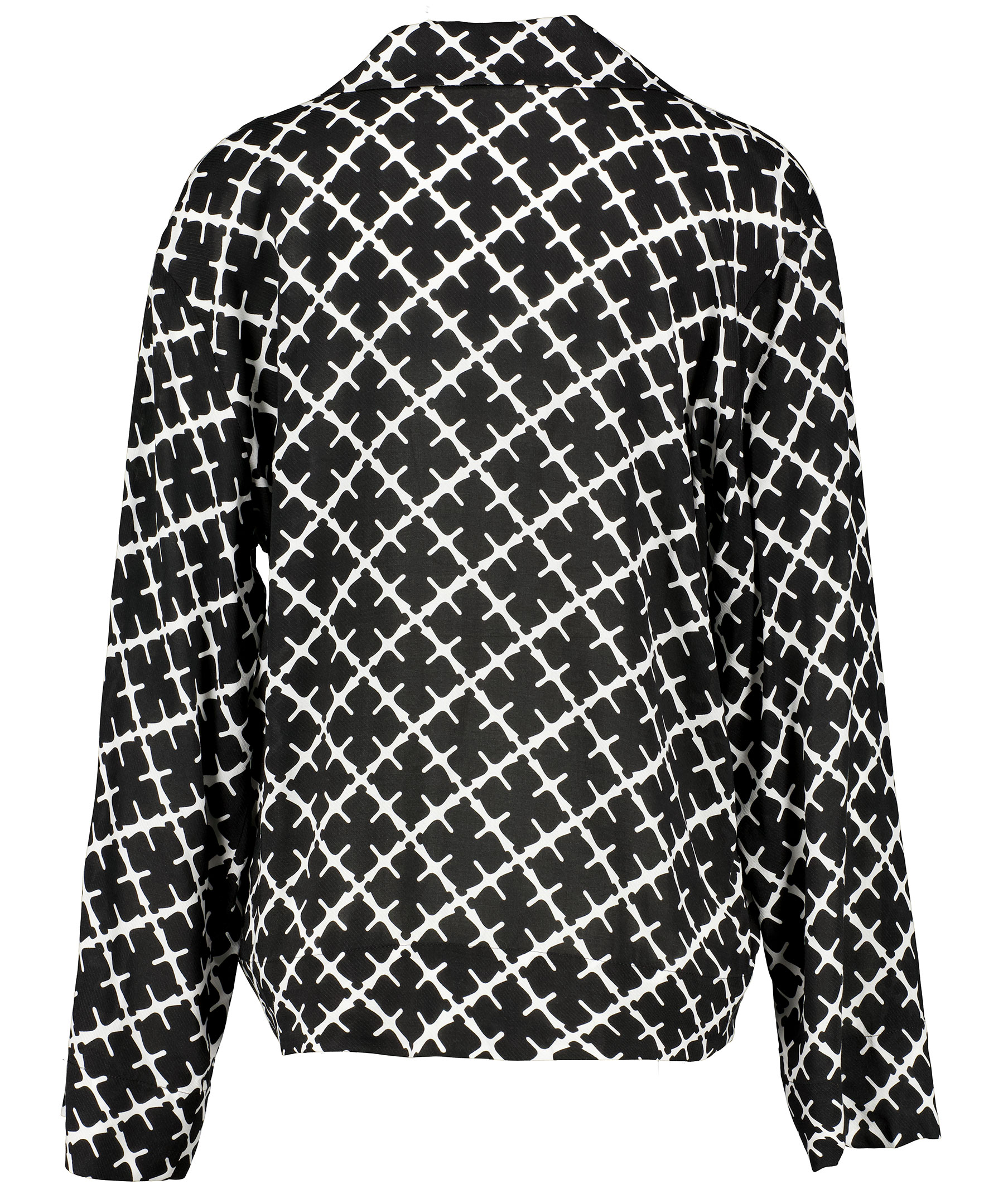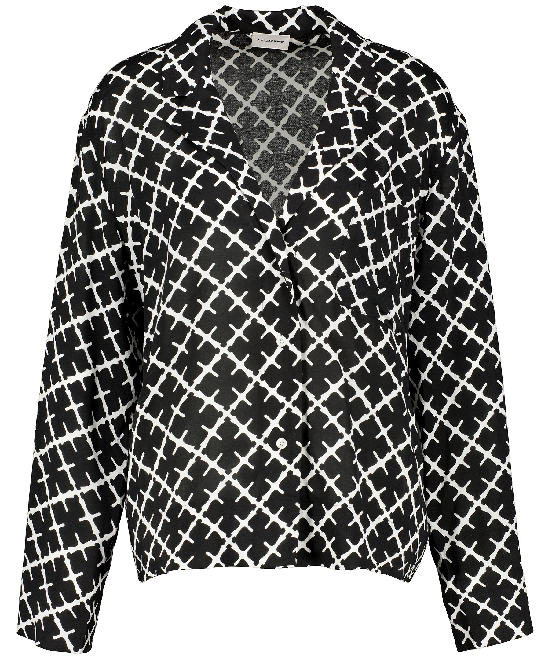Svart/vit mönstrad pyjamasskjorta från märket By Malene Birger. Avslappnad passform, knappar framtill, bröstficka. Tillverkad i mjuk och tunn viskos.