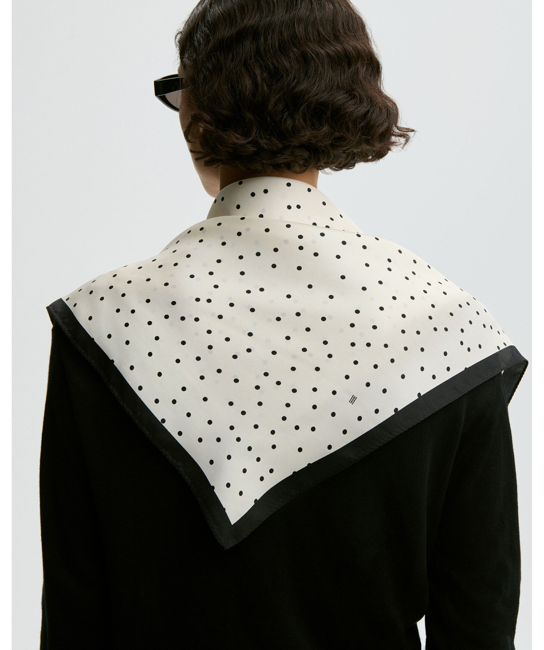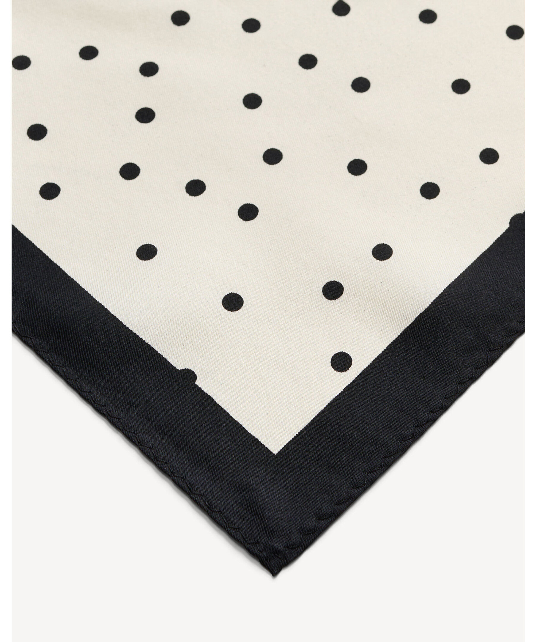 Mönstrad Poula Silk Scarf från By Malene Birger. Scarfen är fyrkantig med lekfulla polka dots och kontrastfärgad kant, tillverkad i lyxig 100 % siden som ger en elegant glans och mjuk känsla. Ett mångsidigt accessoarplagg som du kan knyta runt halsen, runt handleden eller på din väska för att ge outfiten en grafisk och stilfull detalj.