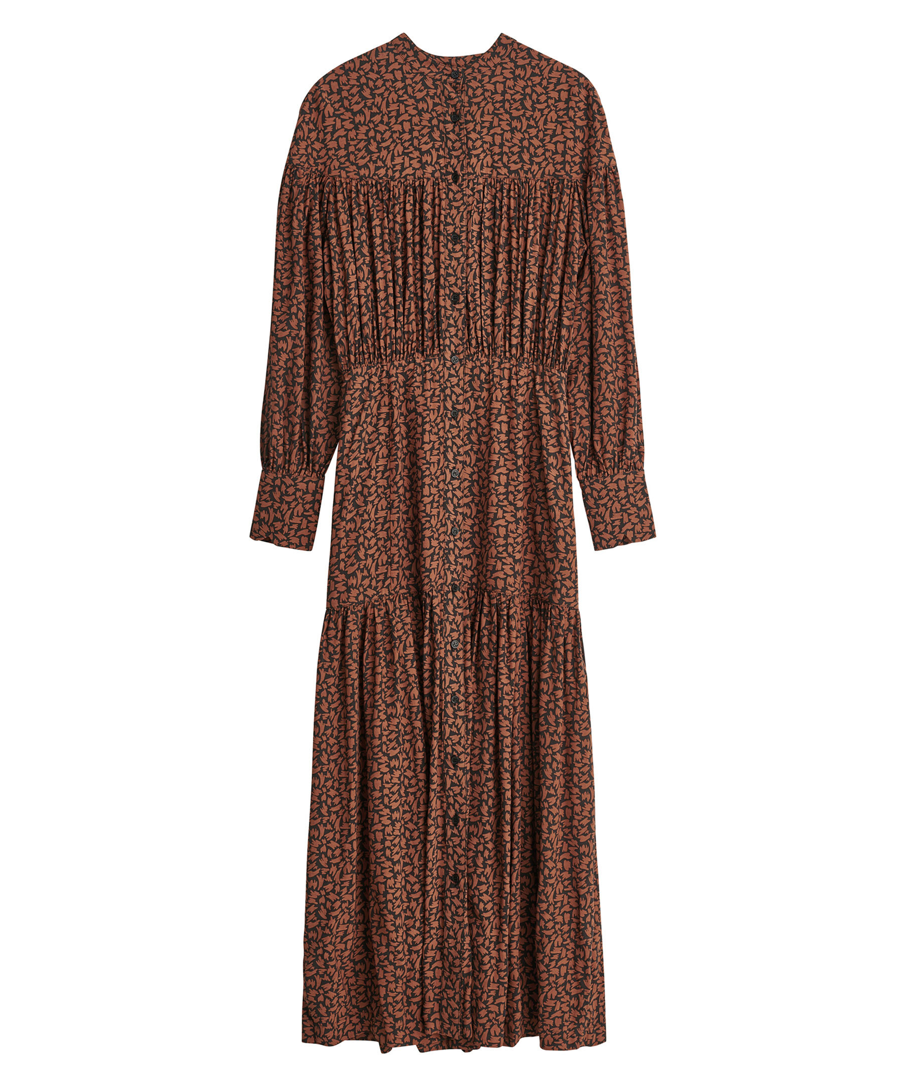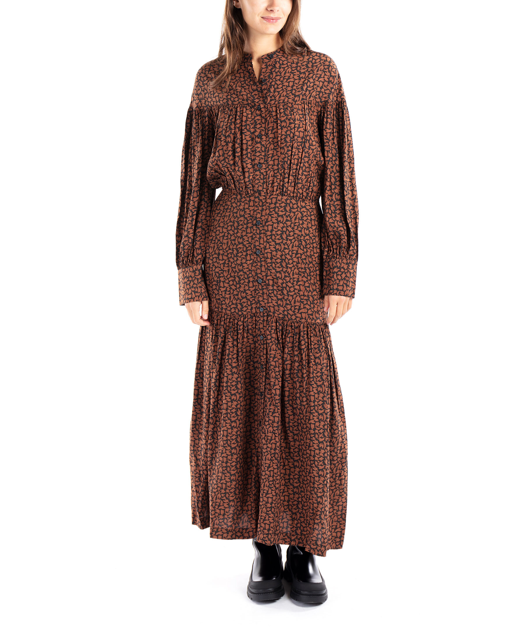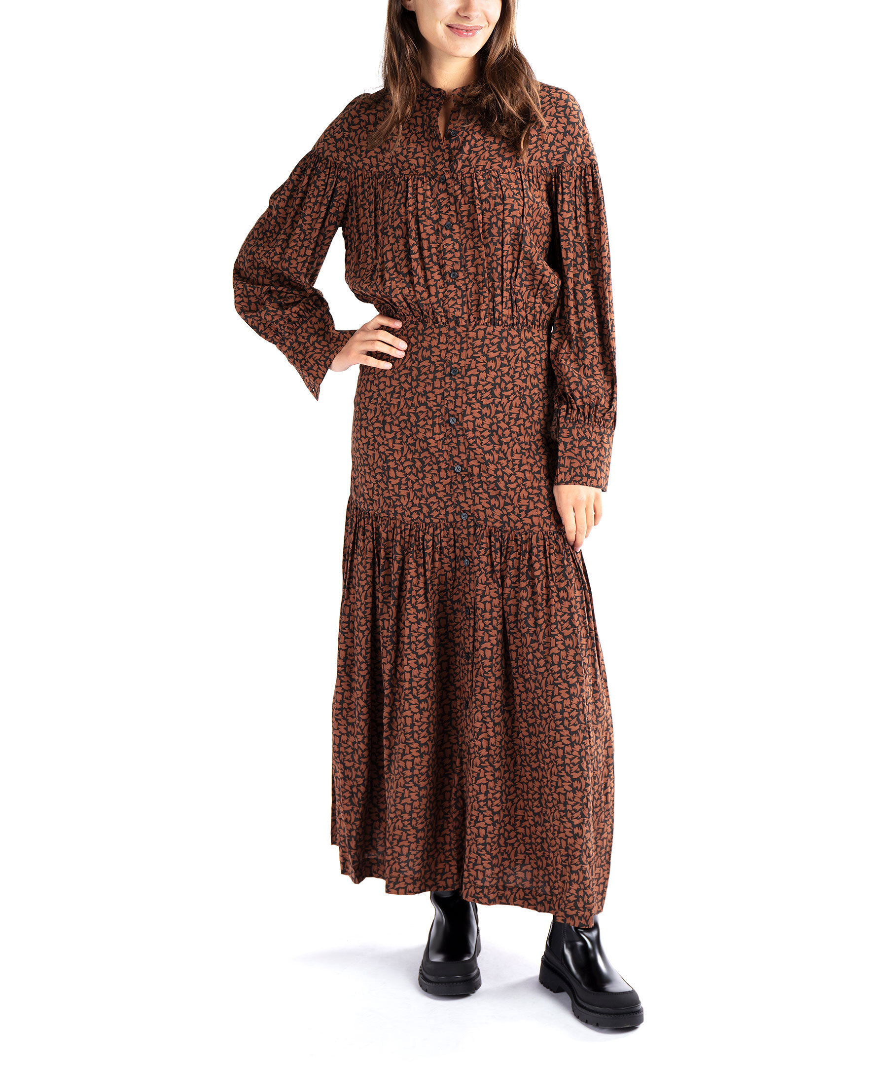 Svart och brun småmönstrad klänning från By Malene Birger. Stängs framtill med knappar. Plisserade detaljer vid manschett, bröst och i knähöjd. Murarkrage, dold dragkedja i sidan för att underlätta påtagning. Modellen är 178cm lång och har på sig storlek 36.