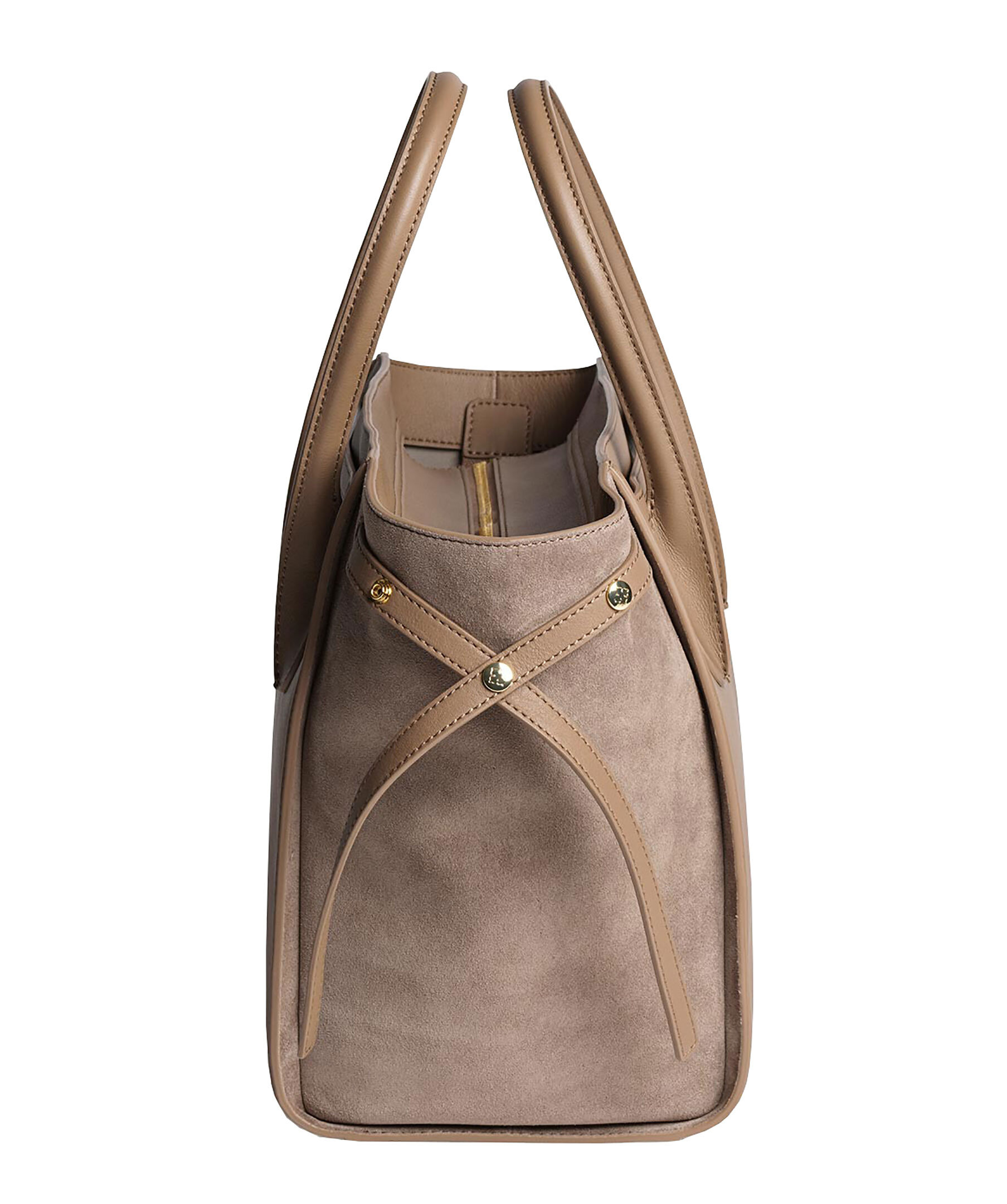 Beige handväska från By Marlene Birger. Väskan är gjord i äkta skinn med mocka detaljer på sidorna. Ett stort fack med en innerficka för mindre föremål. Stängs med dragkedja på toppen.