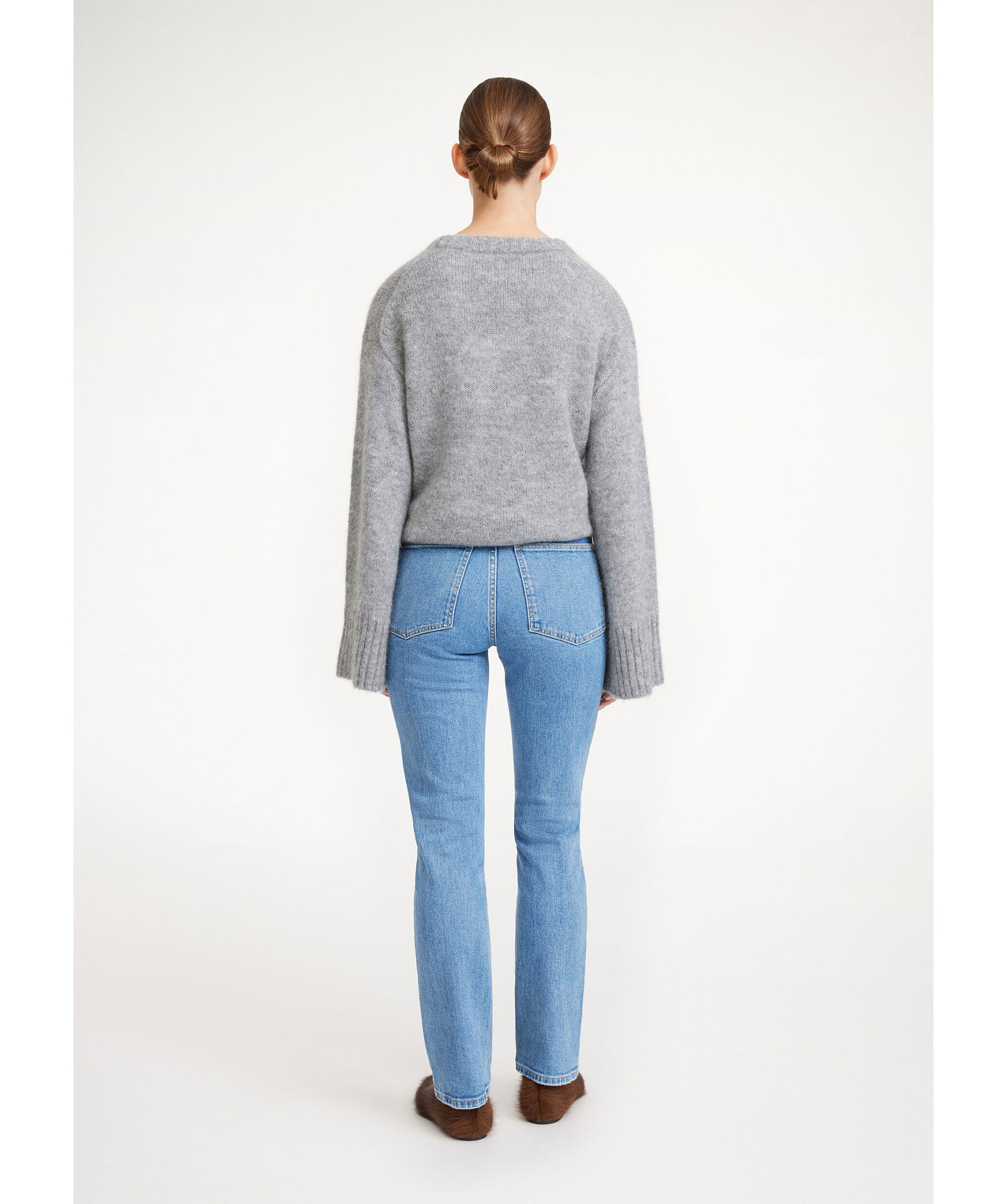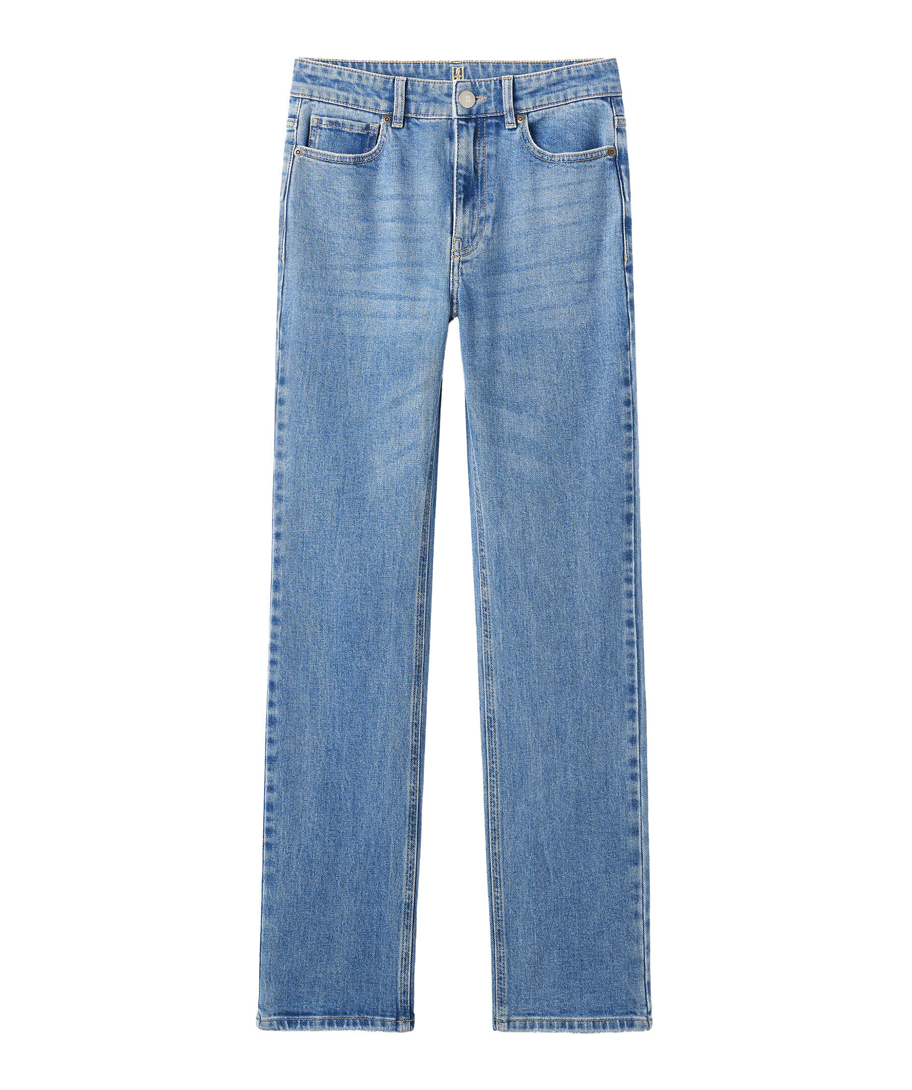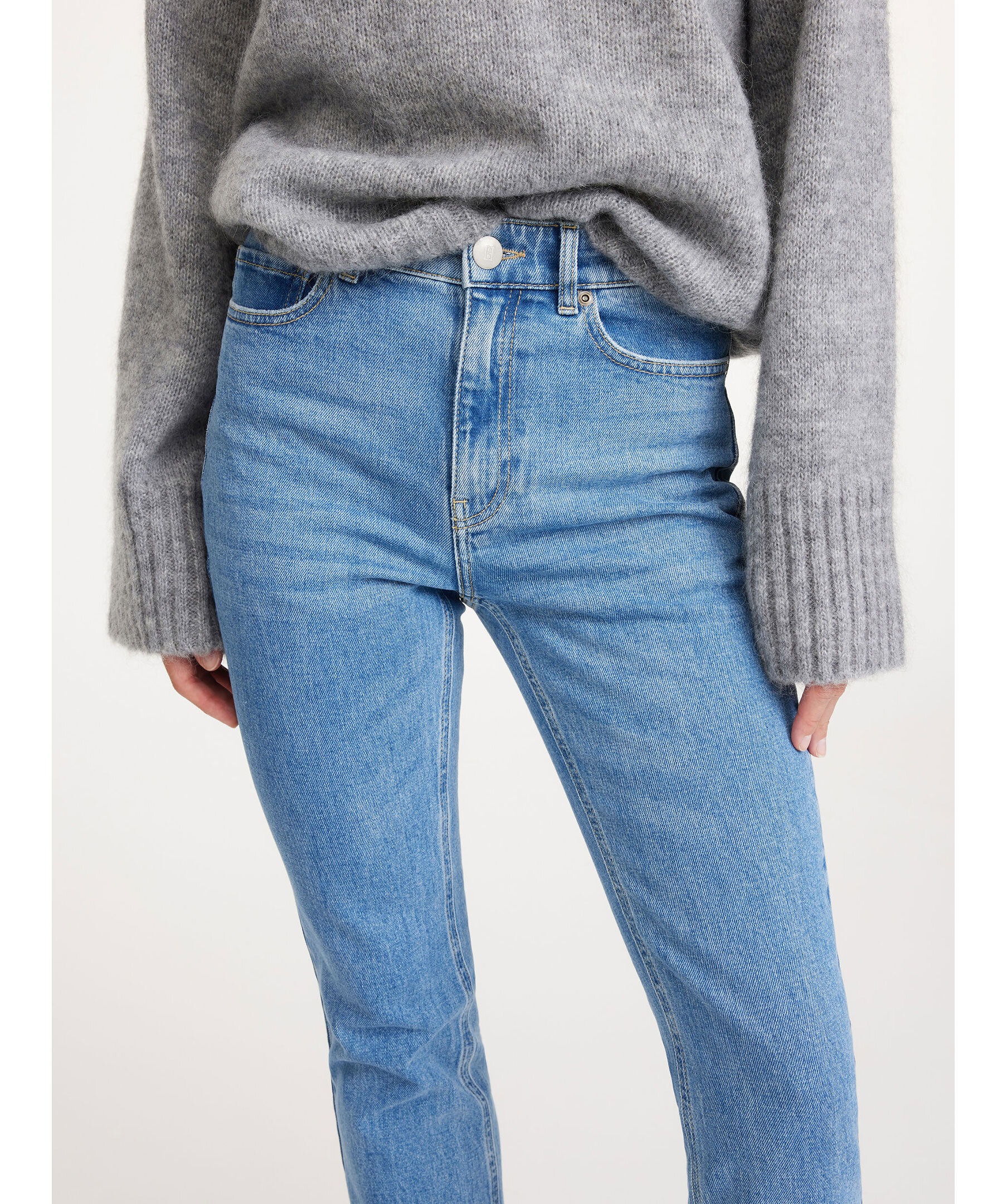 Blåa jeans med hög midja och stretch från By Malene Birger. Jeansen har en smal och rak passform. Dessa jeans är små i storleken så vi rekommenderar att du väljer en storlek större än vanligt. Modellen 178cm lång har på sig strl 27".