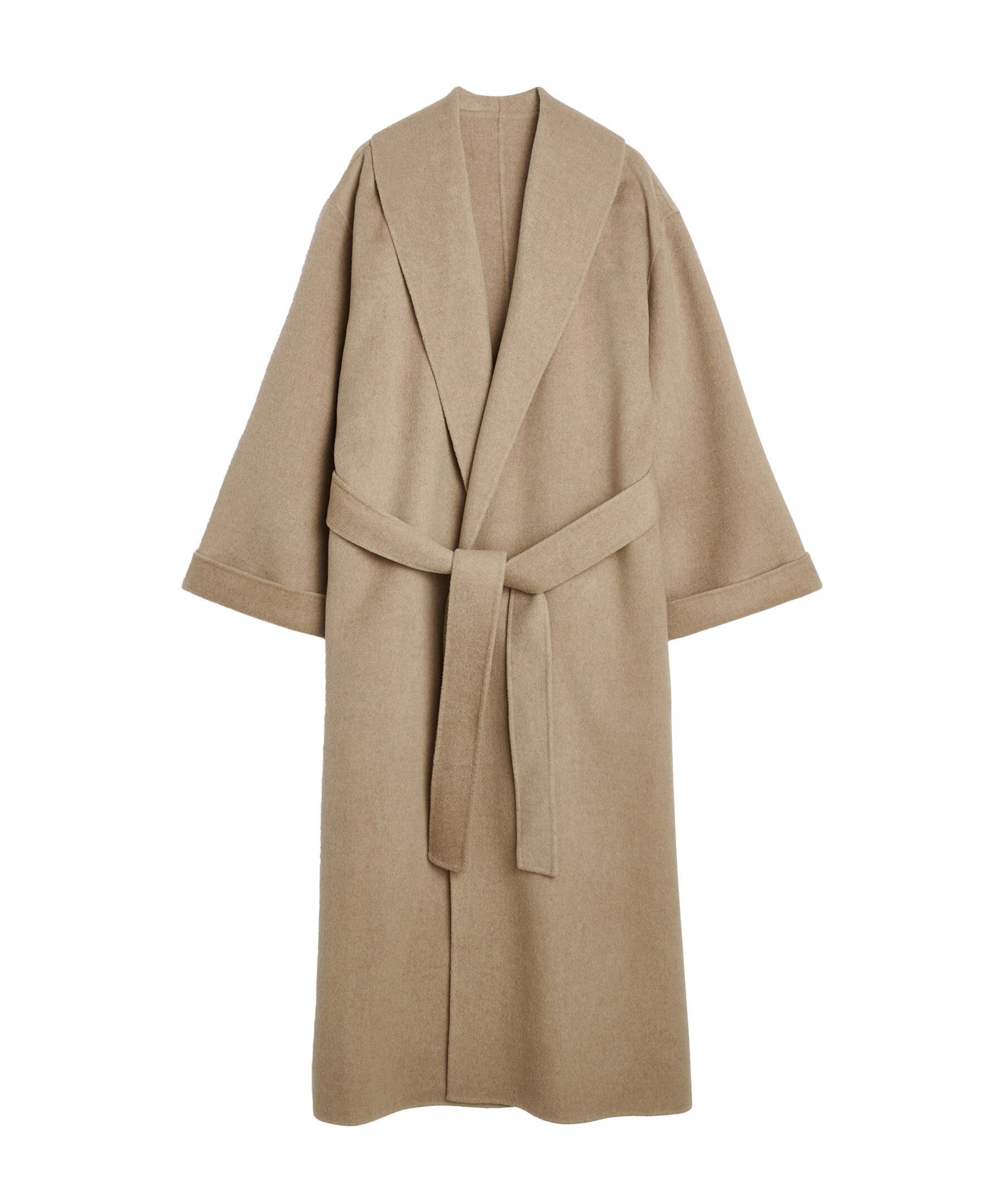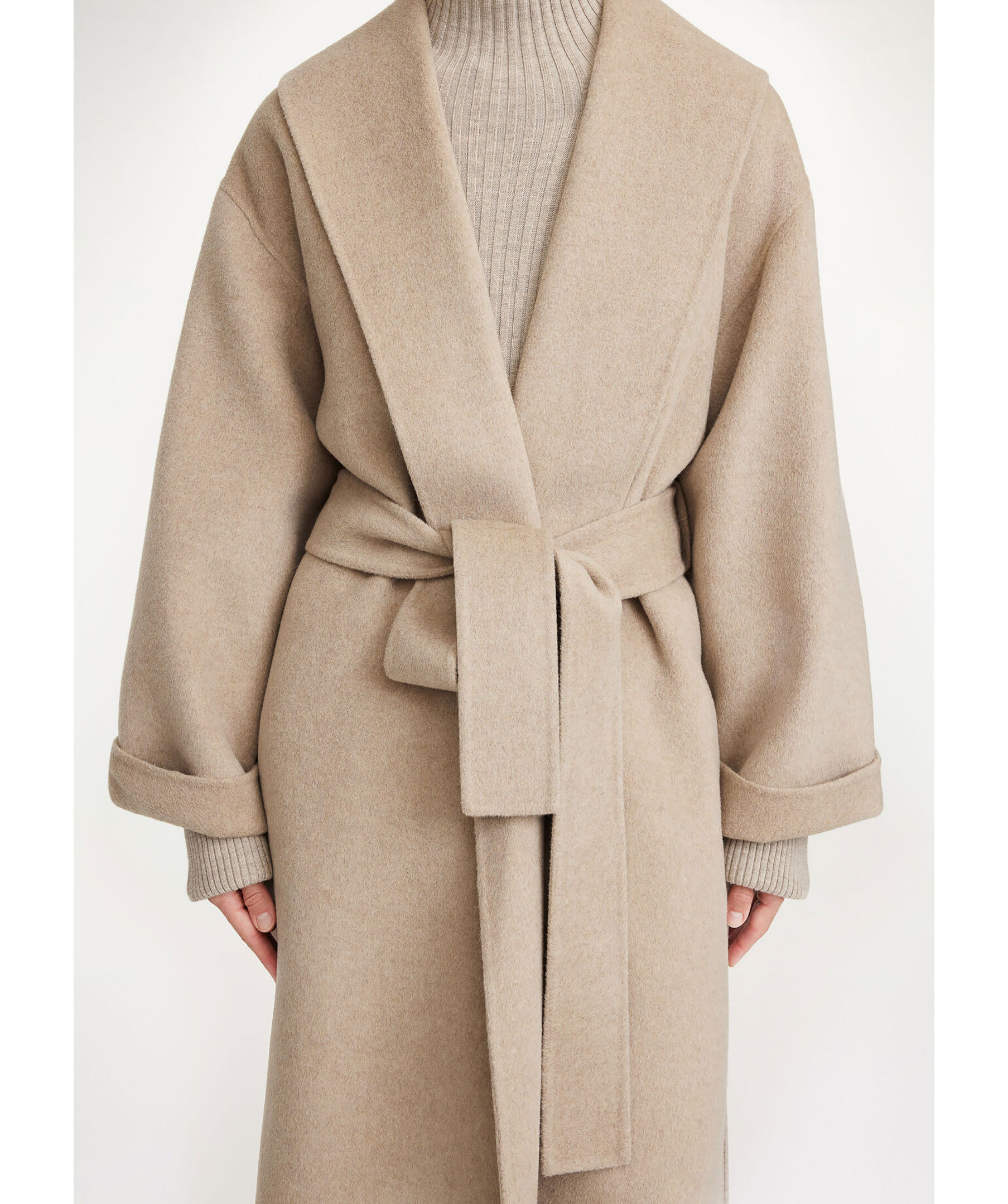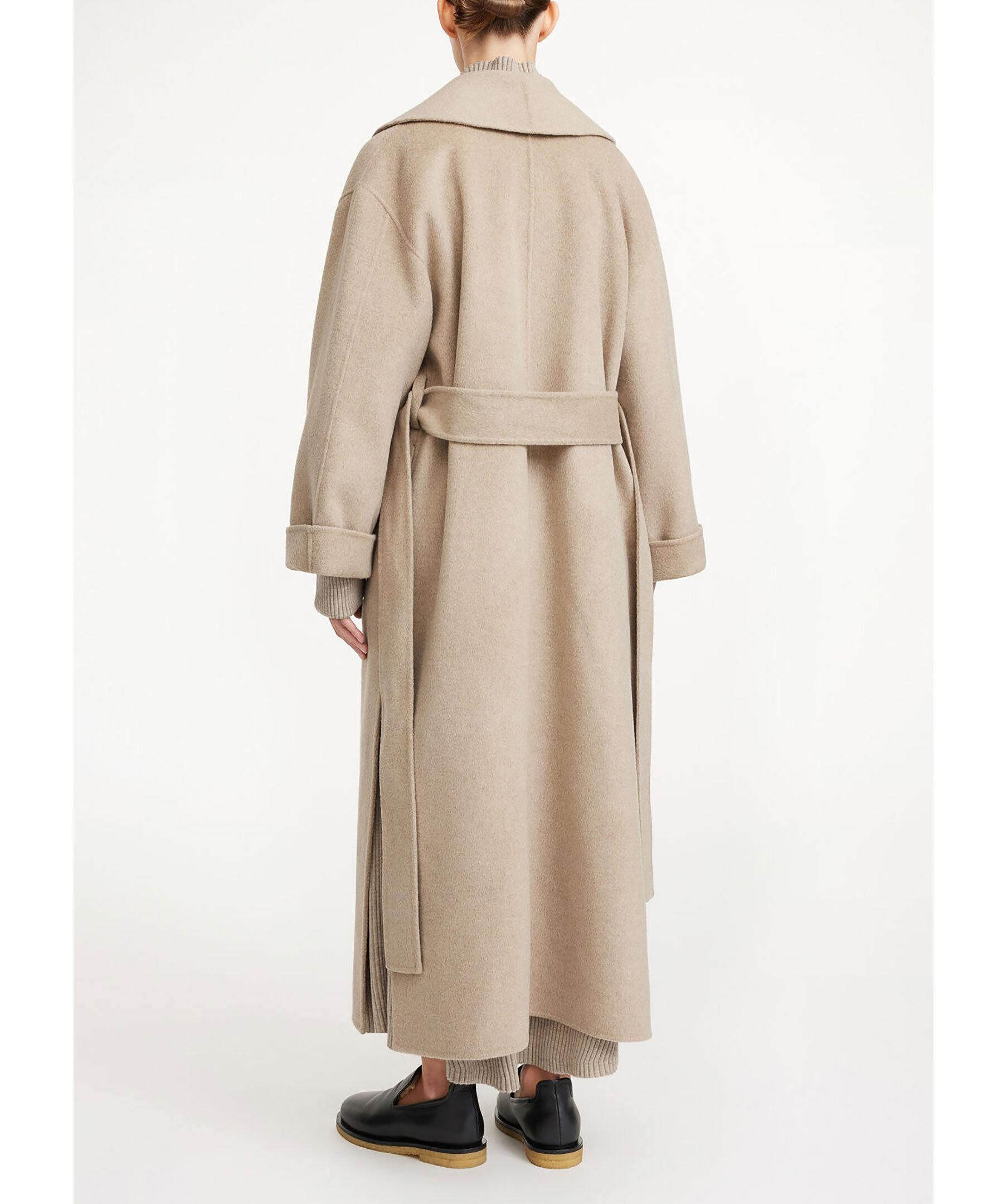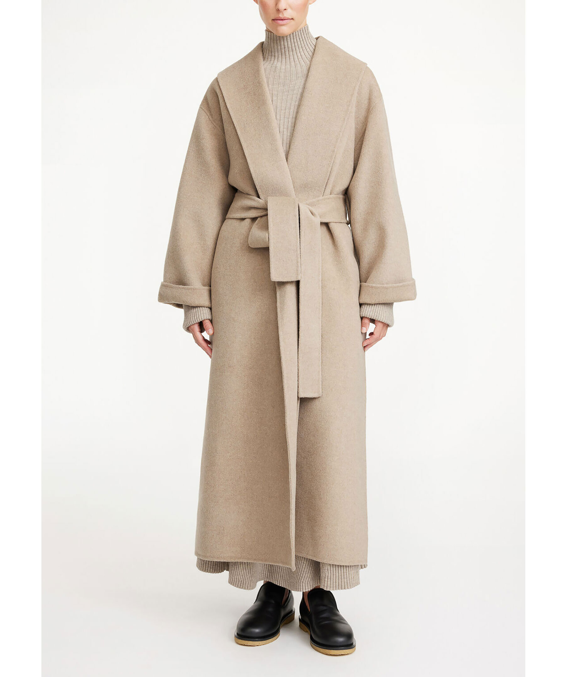 Beige, lång kappa från By Malene Birger. Tillverkad i 100% ull. Avslappnad passform, två sidfickor och bälte i midjan. Kappan har en subtil sjalkrage.