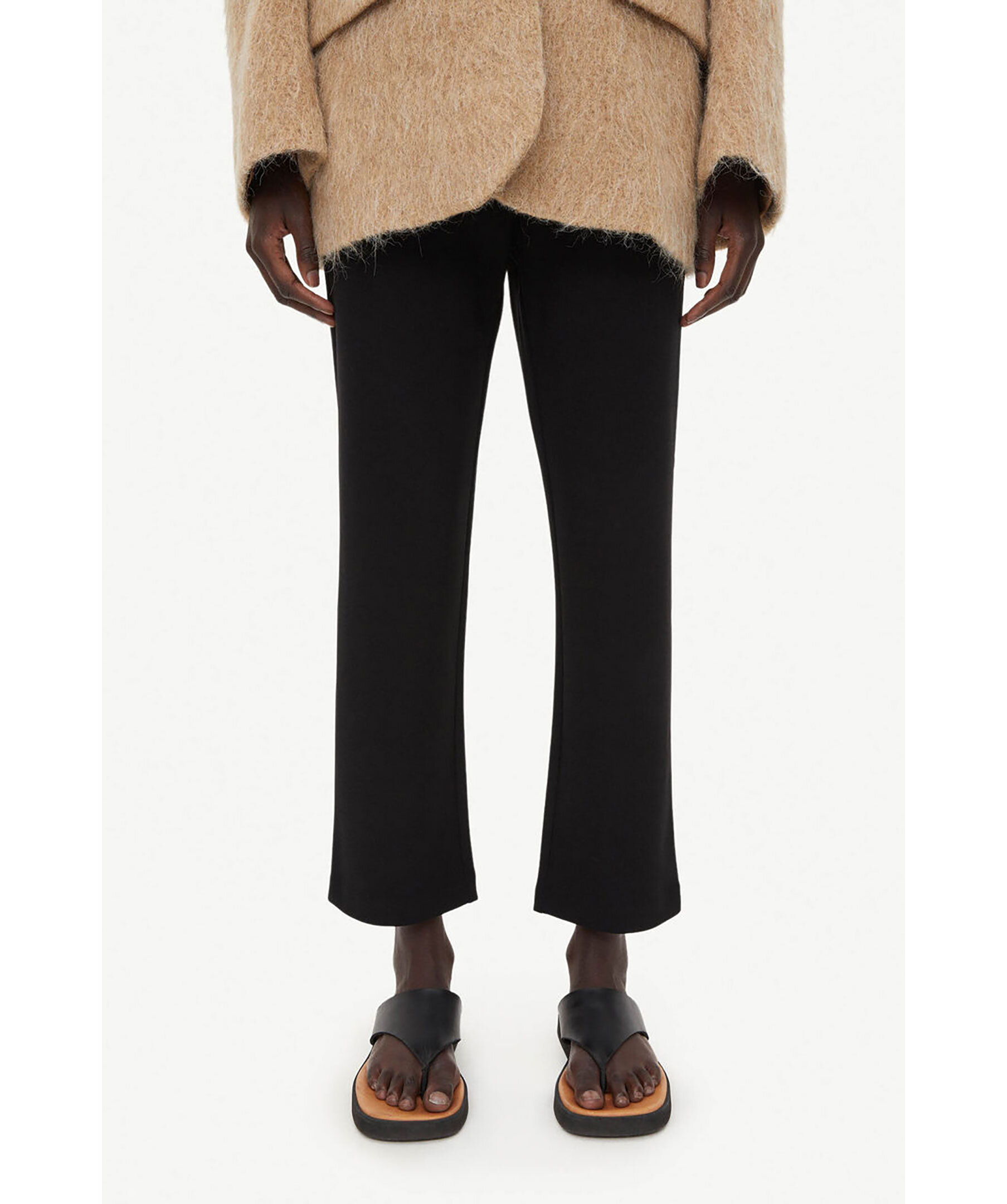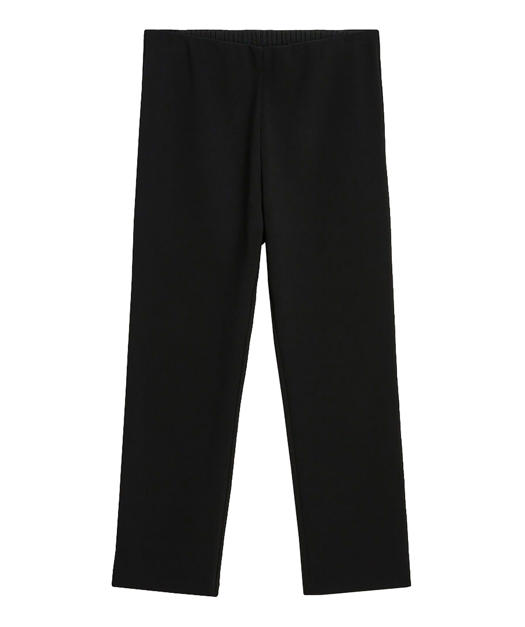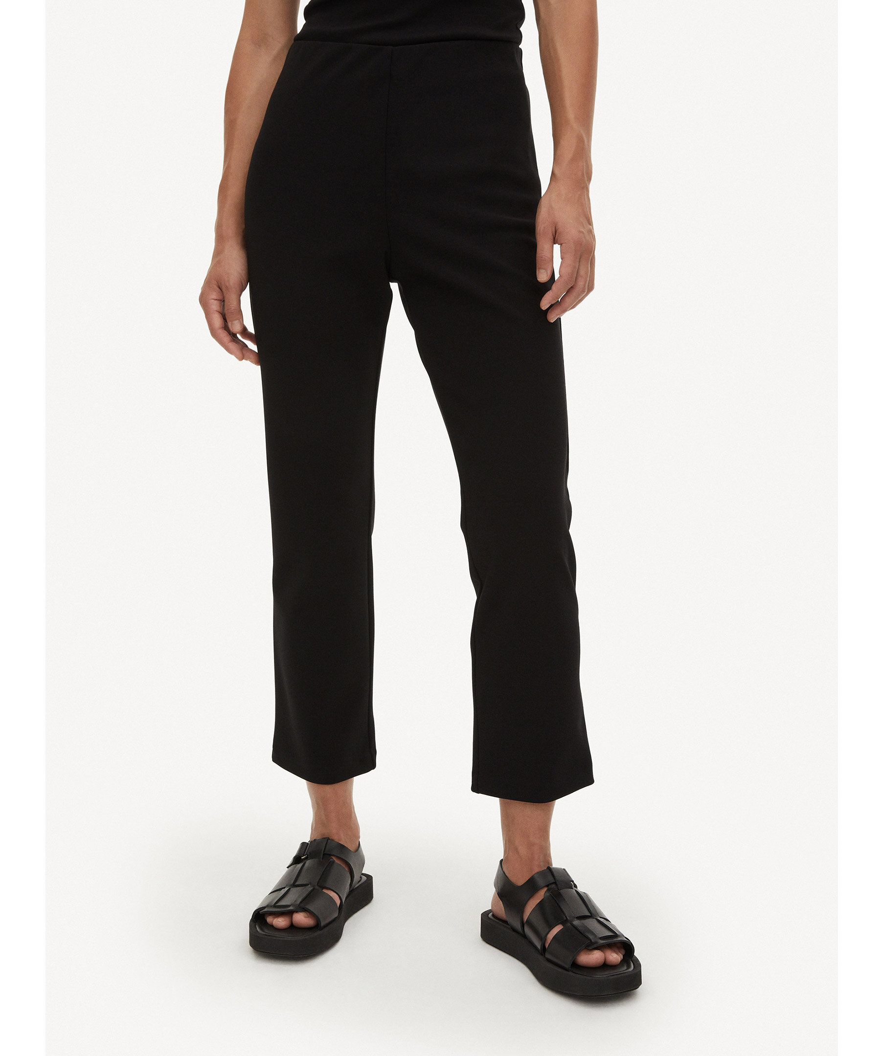 Svarta, raka och croppade byxor från by Malene Birger. Beskuren benlängd och resår i midjan. Mjukt och stretchigt material. Det rekommenderas att du går ner en storlek.