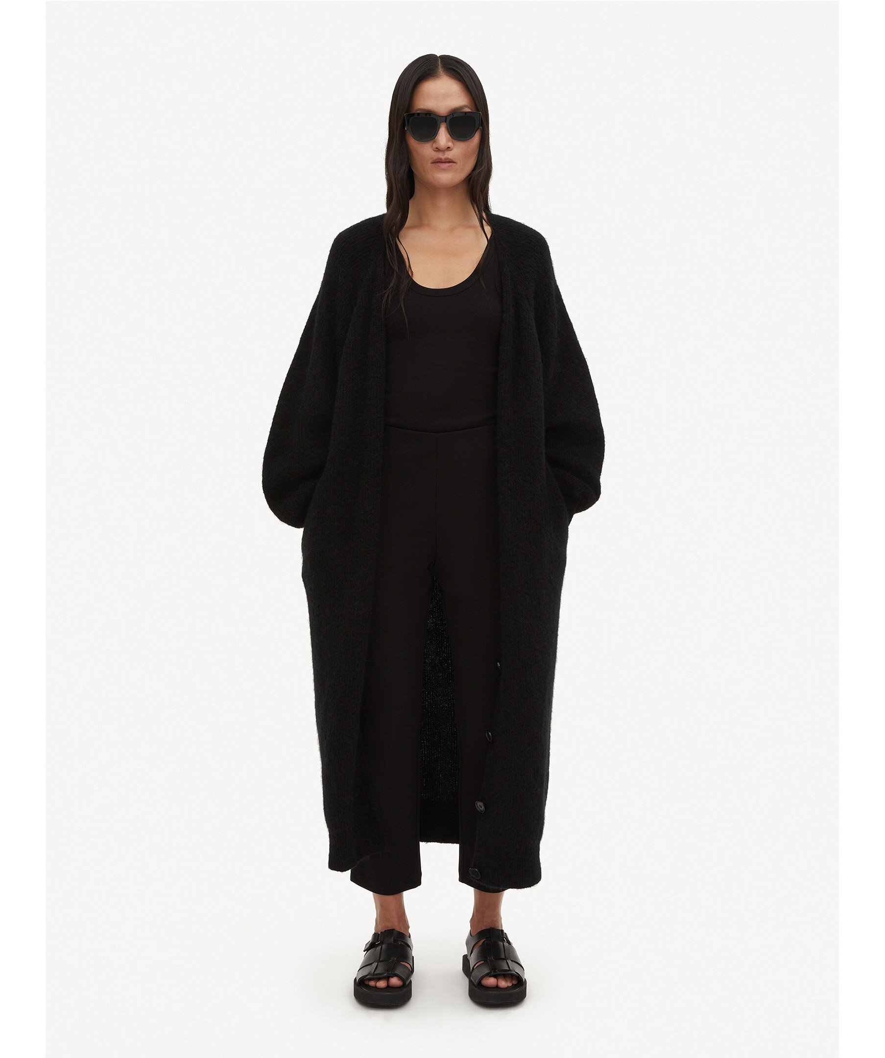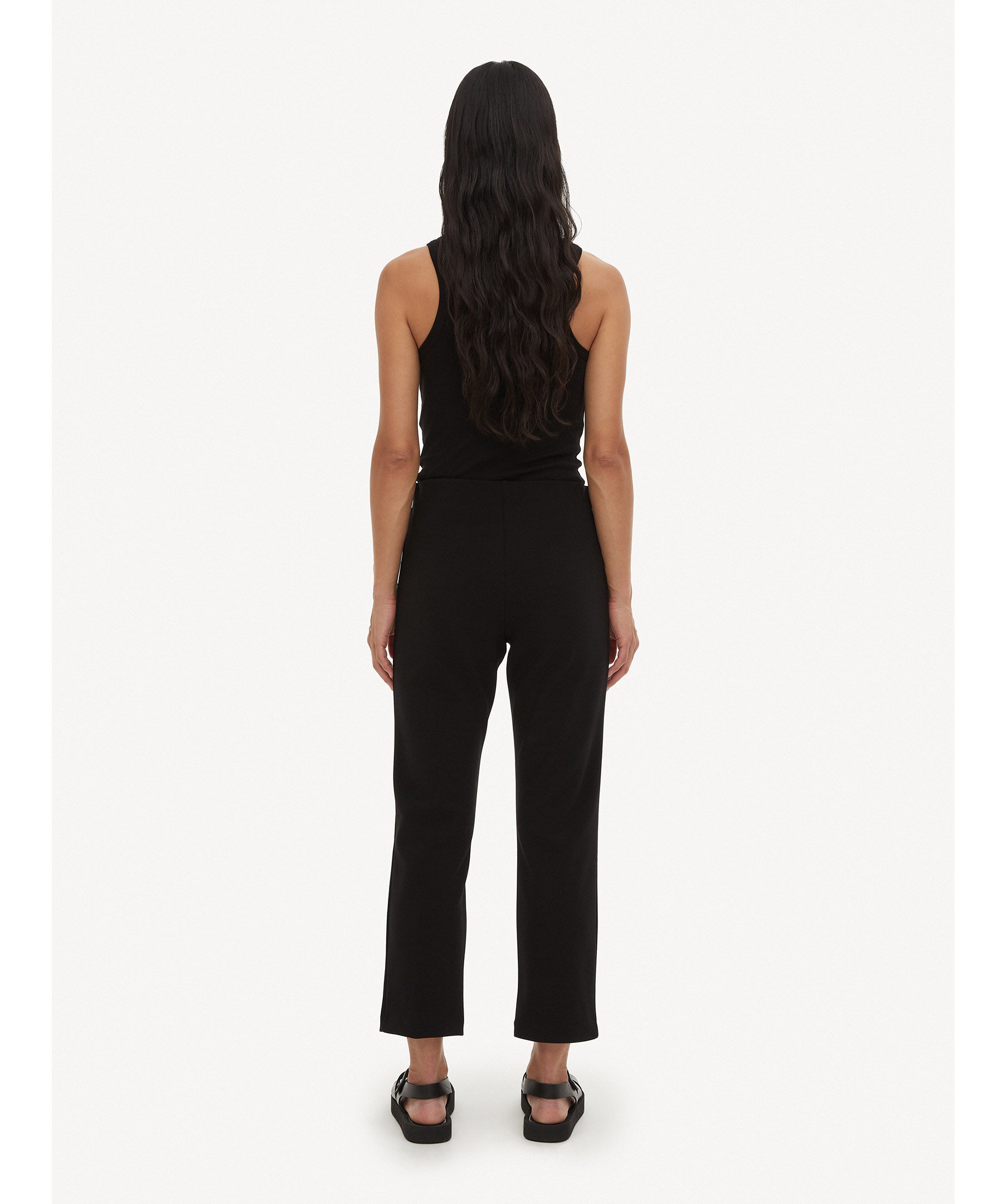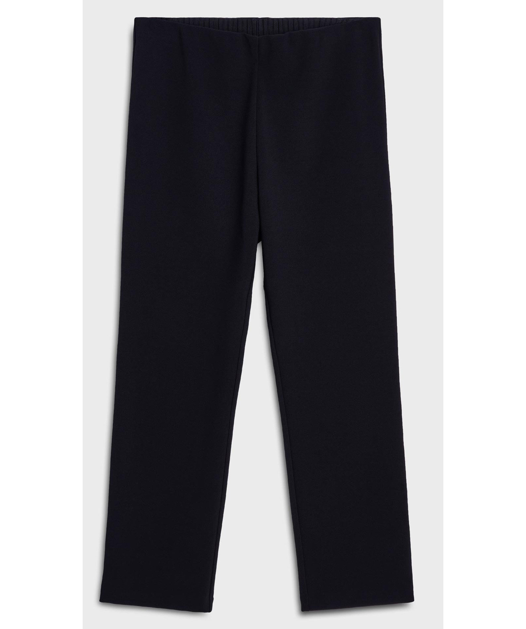 Svarta, raka och croppade byxor från by Malene Birger. Beskuren benlängd och resår i midjan. Mjukt och stretchigt material. Det rekommenderas att du går ner en storlek.