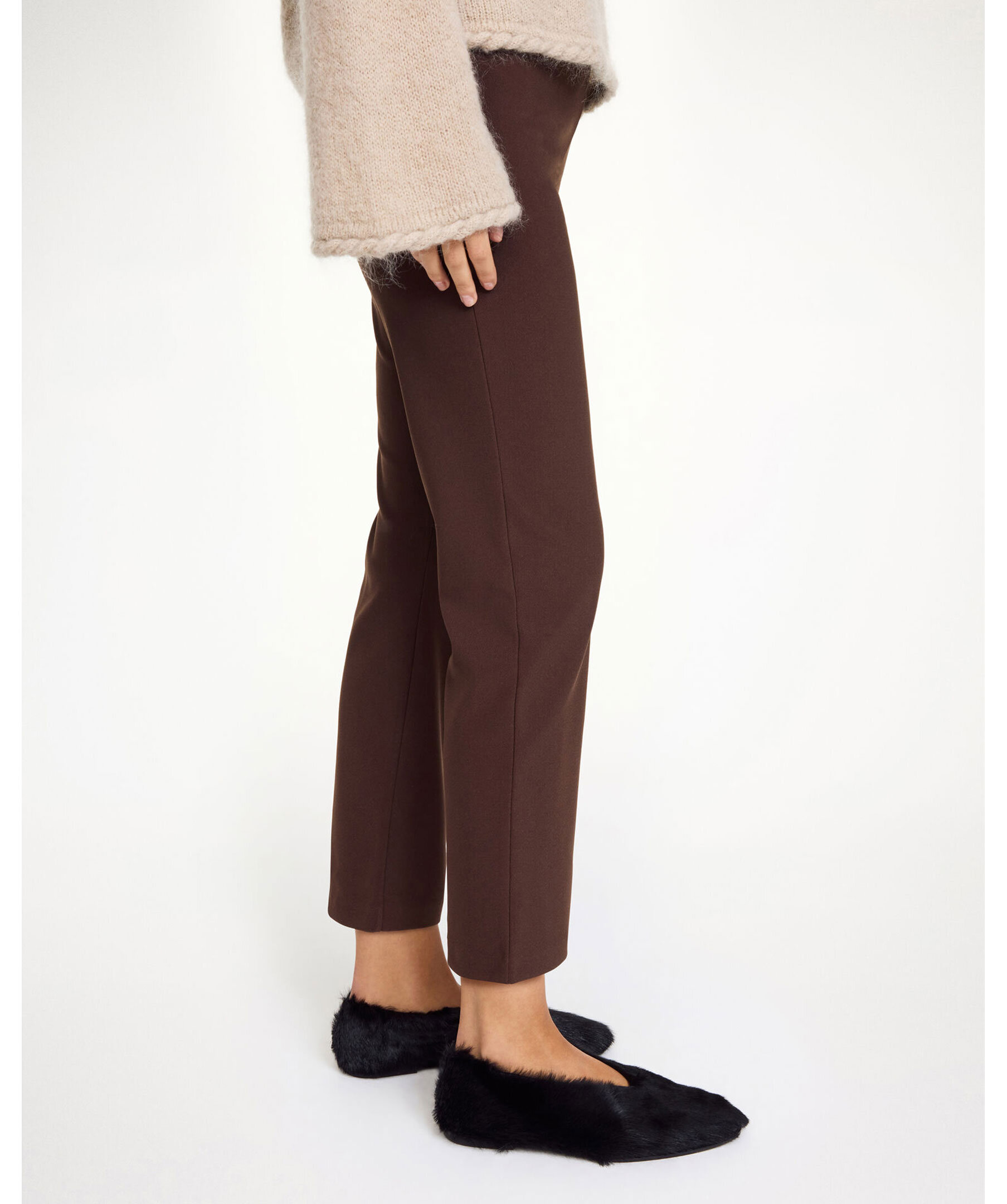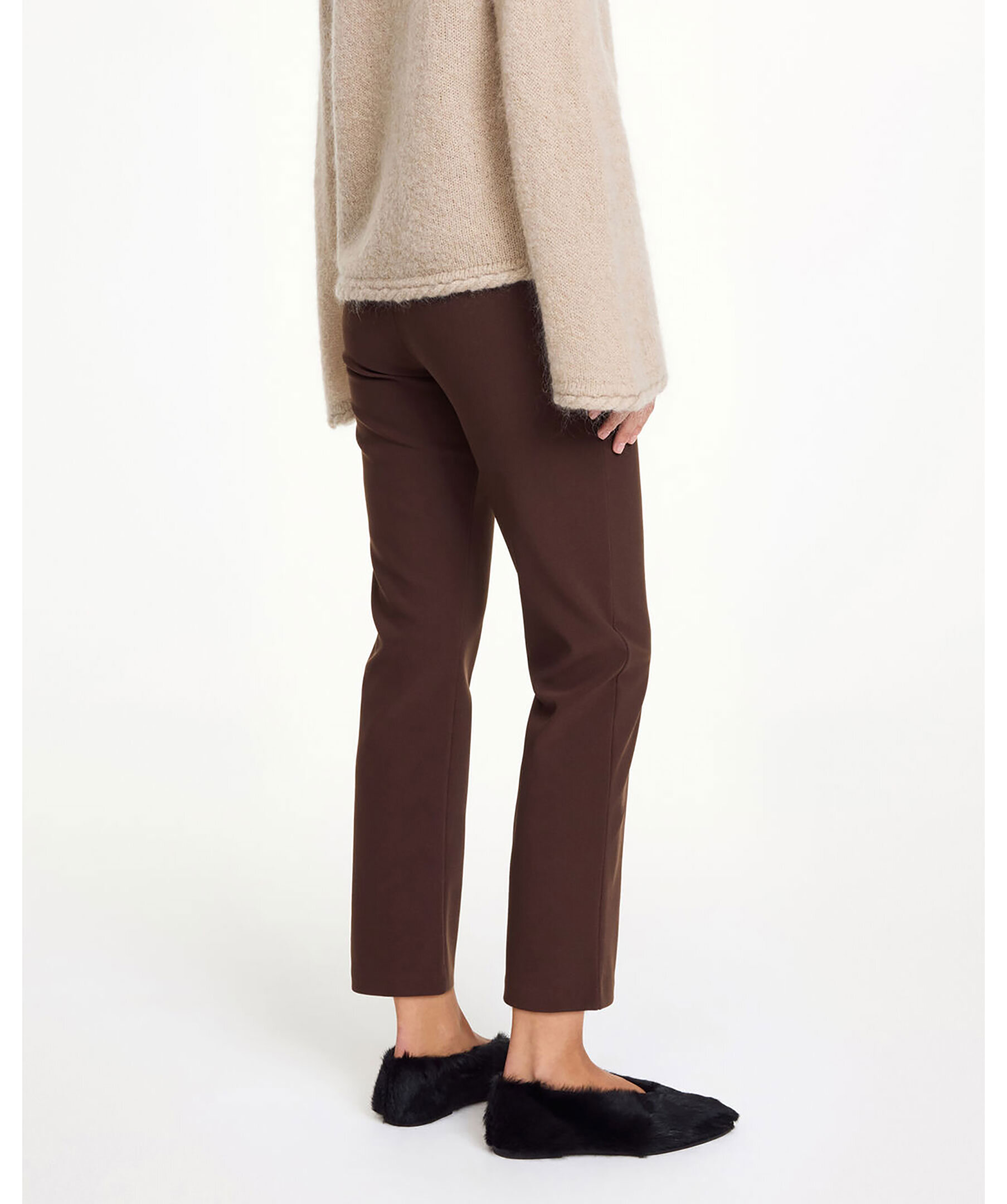 Bruna, croppade byxor från By Malene Birger. Byxorna har korta ben och en elastisk midja. Tillverkade i en polyesterblandning.