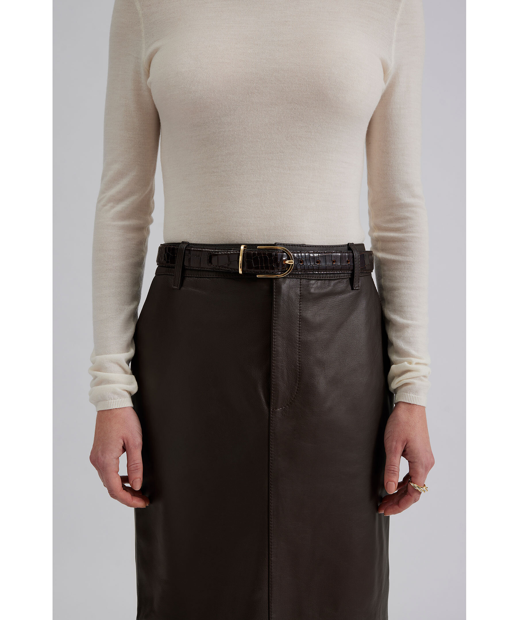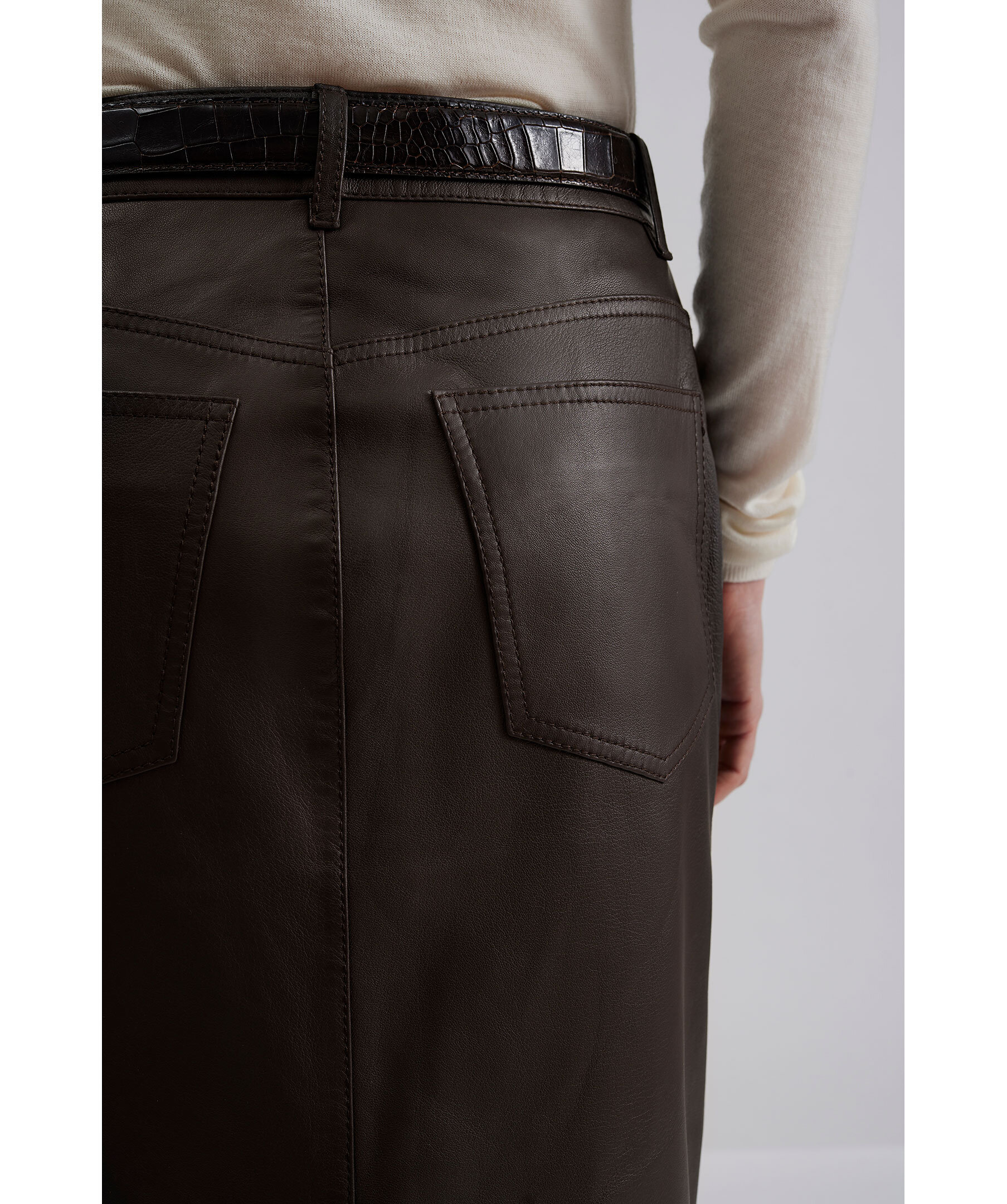 Mörkbrun läderkjol från By Malina. Kjolen har en slits baktill och fram- och bakfickor. Hällor för skärp och stängs med blixtlås och hake. Modellen är 173cm lång och har på sig strl S.