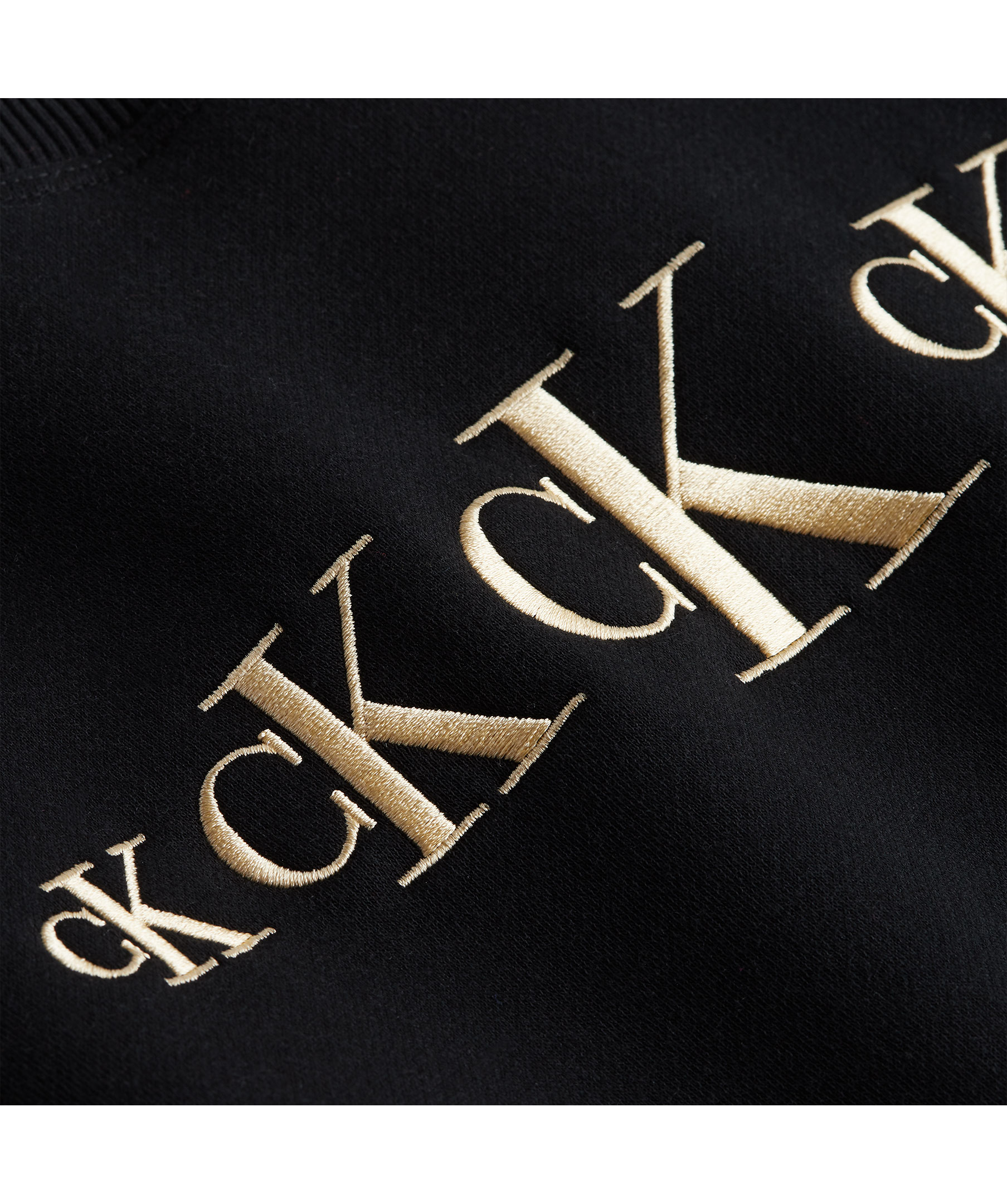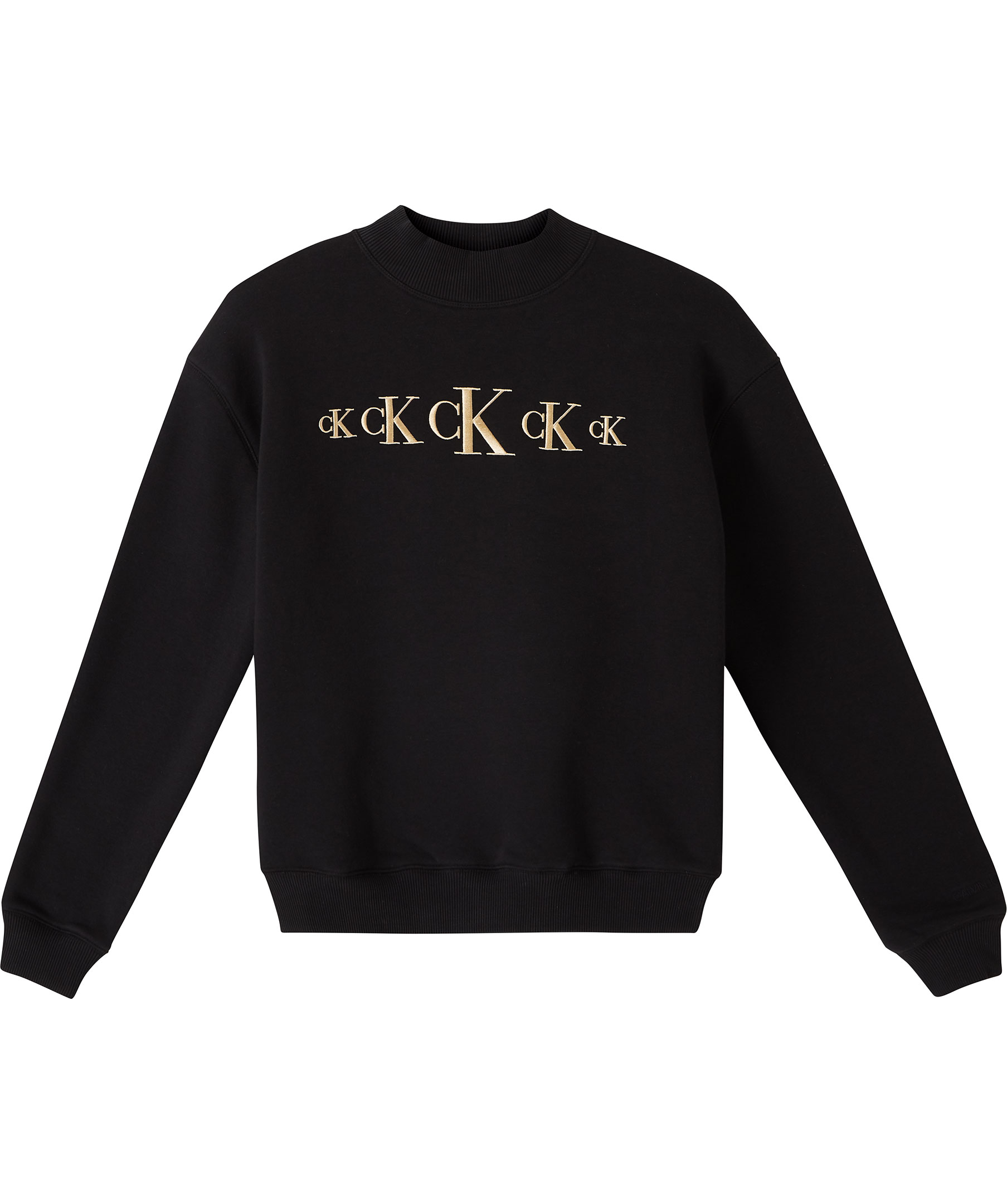 Svart sweatshirt i rak modell från Calvin Klein. Tillverkad i bomullsblandning. Fem beigea, broderade logotyper tryckt mitt på bröstet och en svart broderat logotyp i slutet på vänster ärm. Hög, rundad halsringning och ribbade muddar i ärmslut, ringning och plaggslut. *Loggor på bröstet *Rundad halsringning * Bomullsblandning